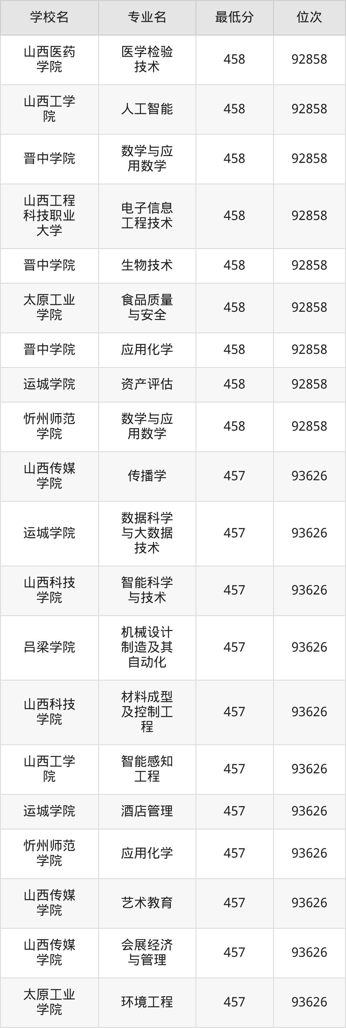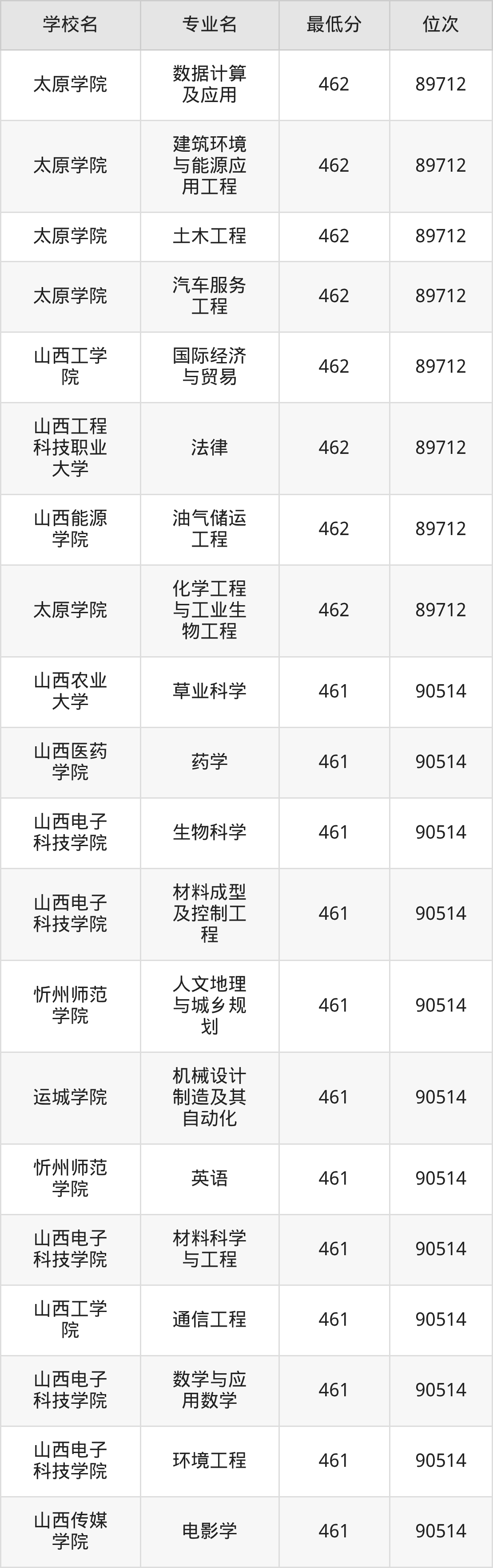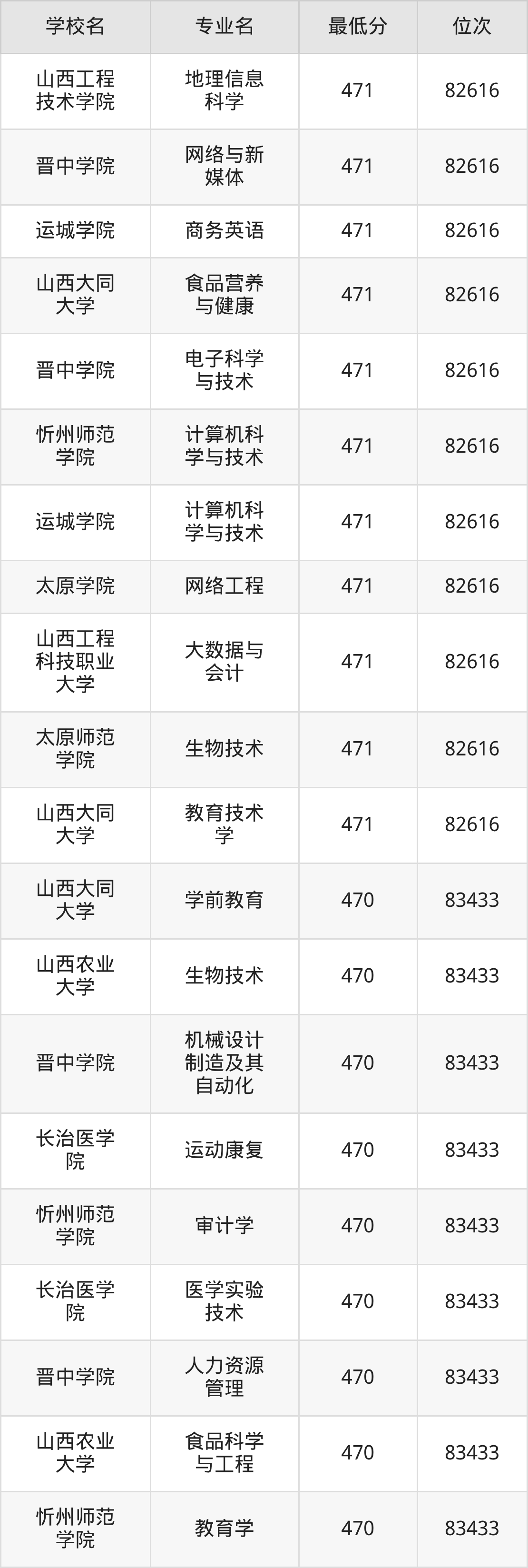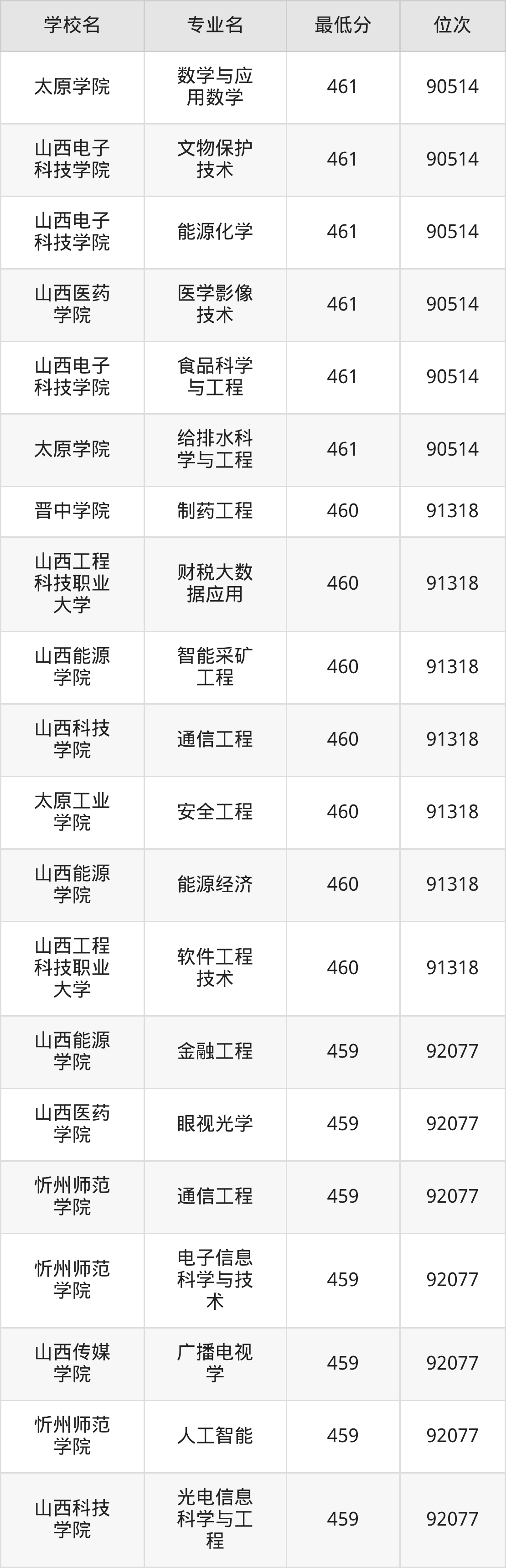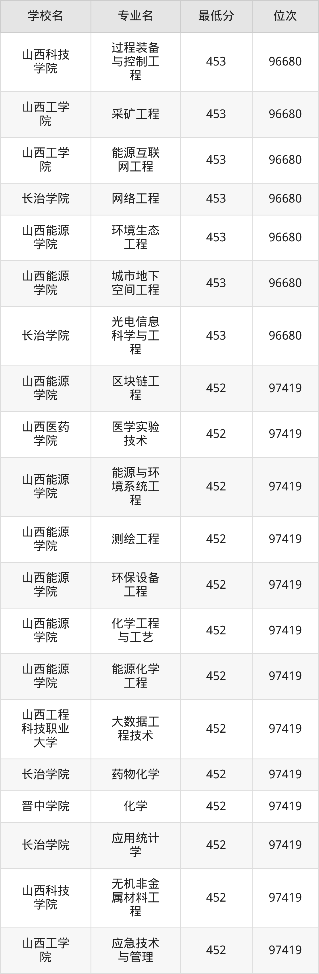 (1)山西工程技术学院:2025年公办本科分数线440分到487分,位次区间是106253名到70087名,招生专业有33个,最低为安全工程、包装工程、城市地下空间工程、采矿工程、土木工程、工业设计、地质工程、智能建造、测绘工程、智能采矿工程、矿物加工工程、道路桥梁与渡河工程、遥感科学与技术、最高为电气工程及其自动化。