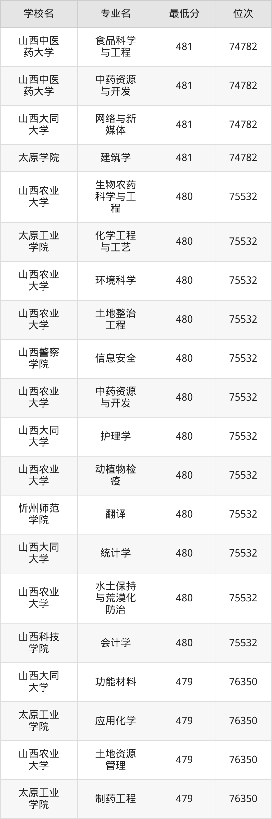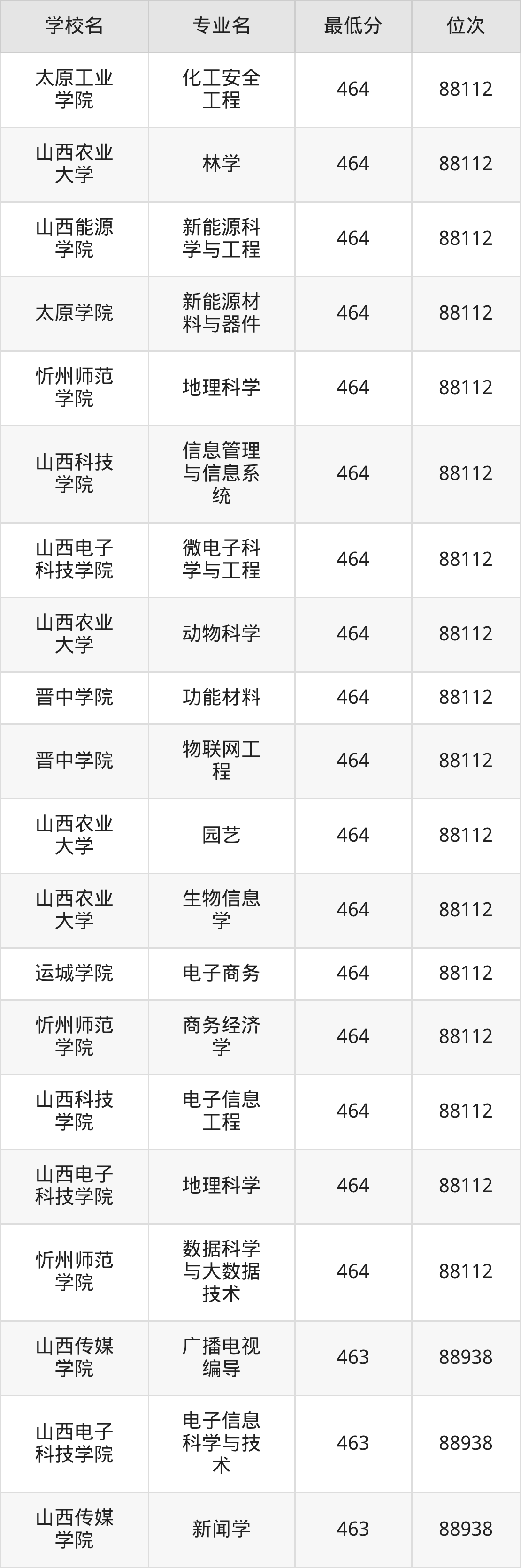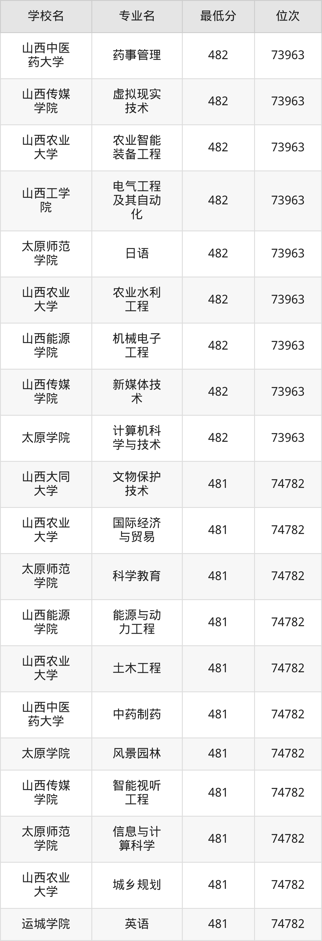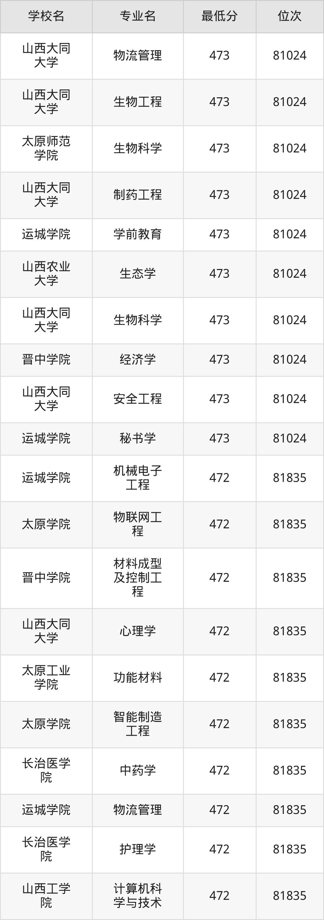 (1)山西工程技术学院:2025年公办本科分数线440分到487分,位次区间是106253名到70087名,招生专业有33个,最低为安全工程、包装工程、城市地下空间工程、采矿工程、土木工程、工业设计、地质工程、智能建造、测绘工程、智能采矿工程、矿物加工工程、道路桥梁与渡河工程、遥感科学与技术、最高为电气工程及其自动化。