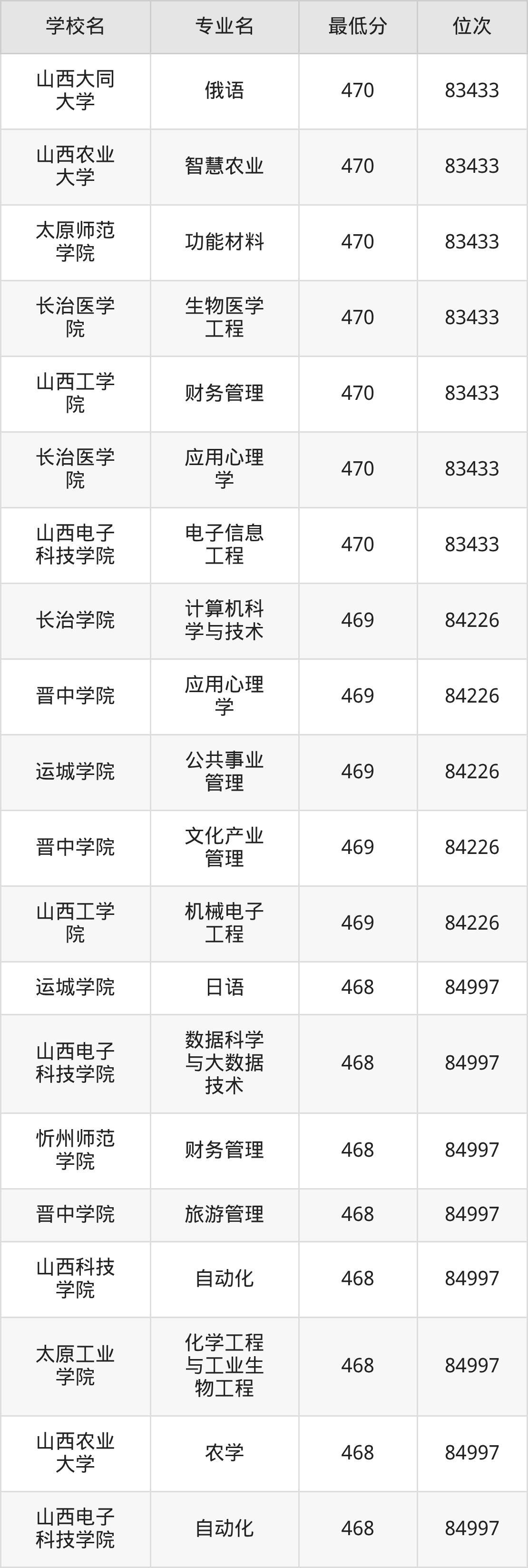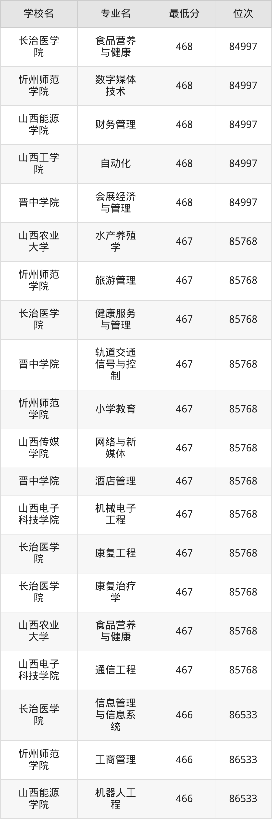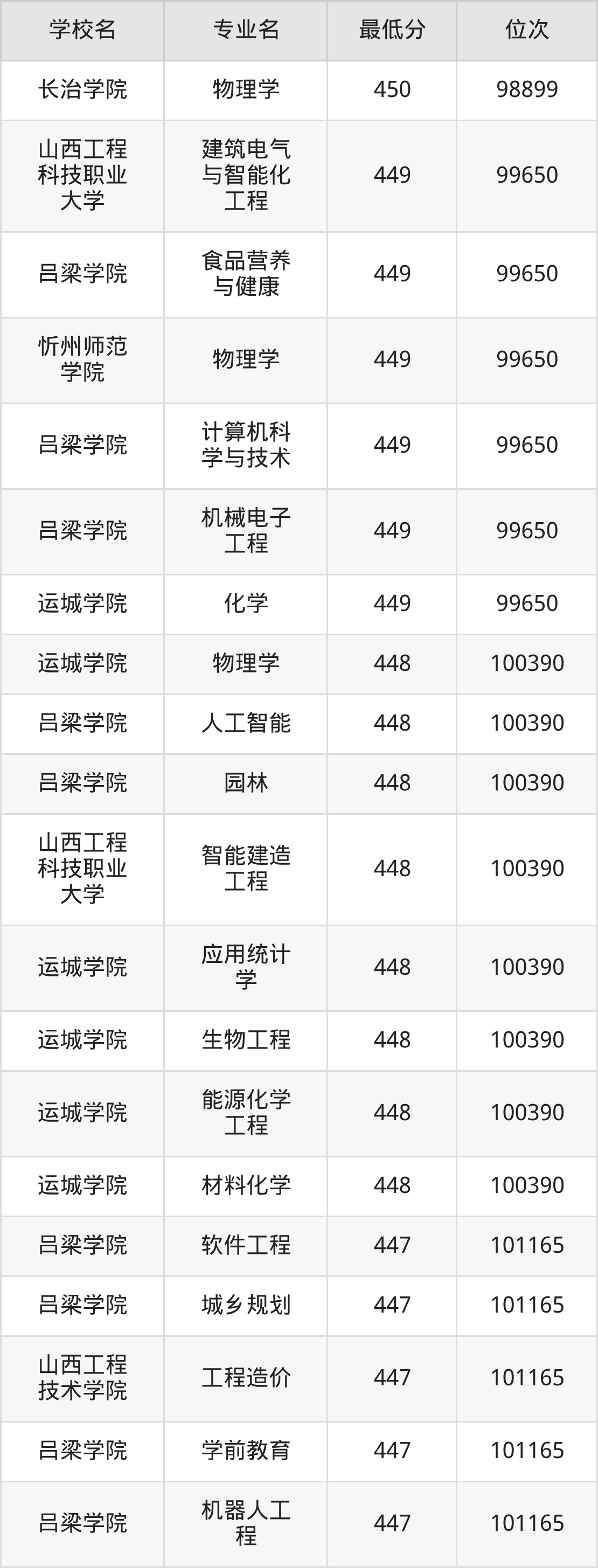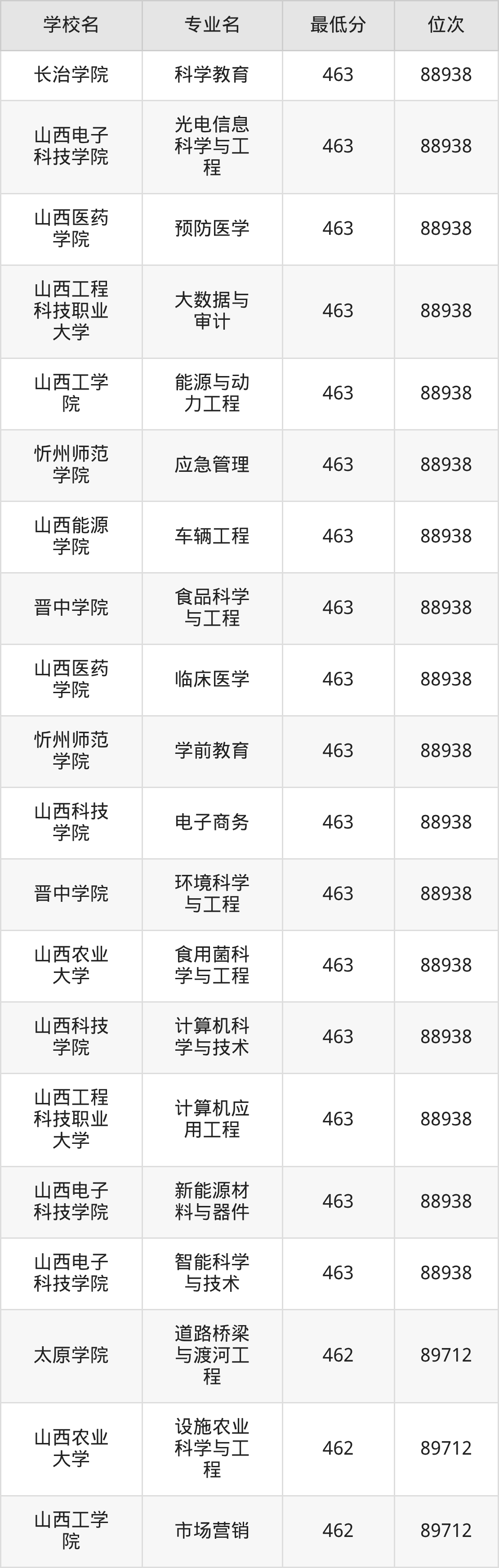 (5)长治学院:2025年公办本科分数线450分到469分,位次区间是98899名到84226名,招生专业有17个,最低为能源化学工程、生物科学、化学、环境生态工程、物理学、最高为计算机科学与技术。