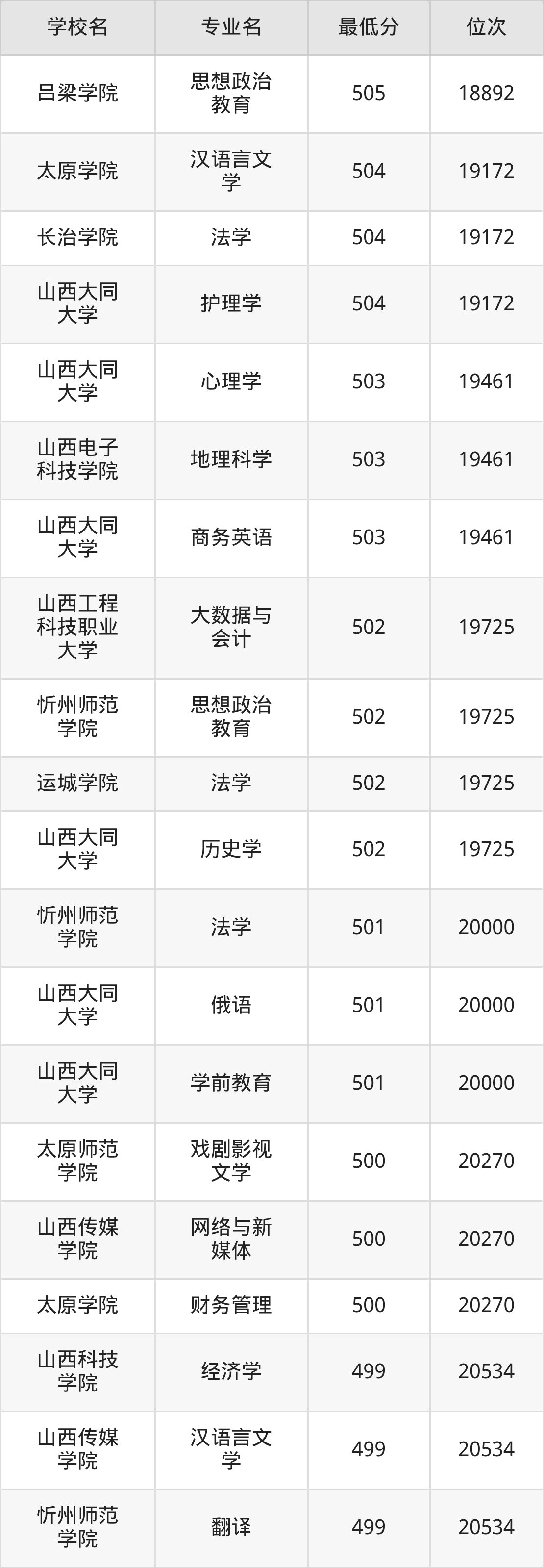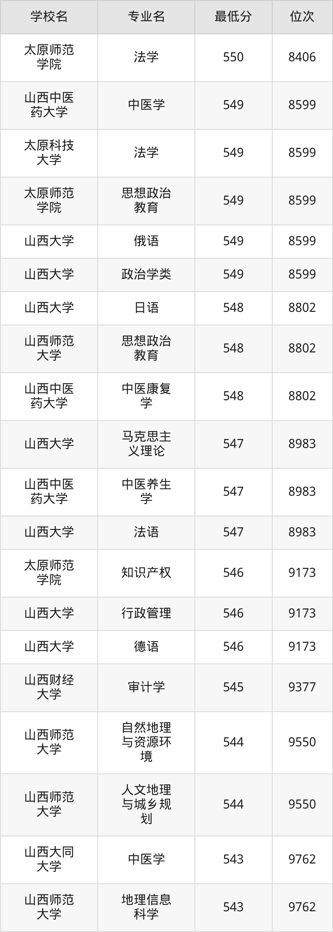 (2)太原师范学院:2025年公办本科分数线500分到550分,位次区间是20270名到8406名,招生专业有24个,最低为戏剧影视文学、最高为法学。