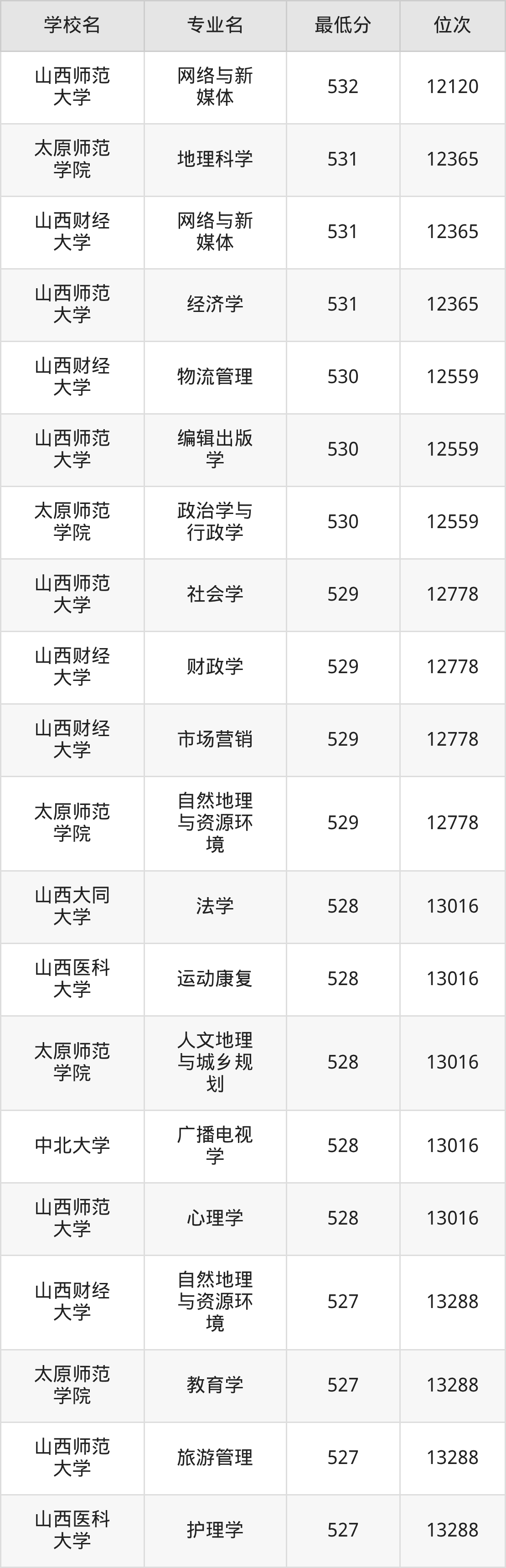 (6)山西医科大学:2025年公办本科分数线519分到528分,位次区间是15260名到13016名,招生专业有6个,最低为社会工作、最高为运动康复。
