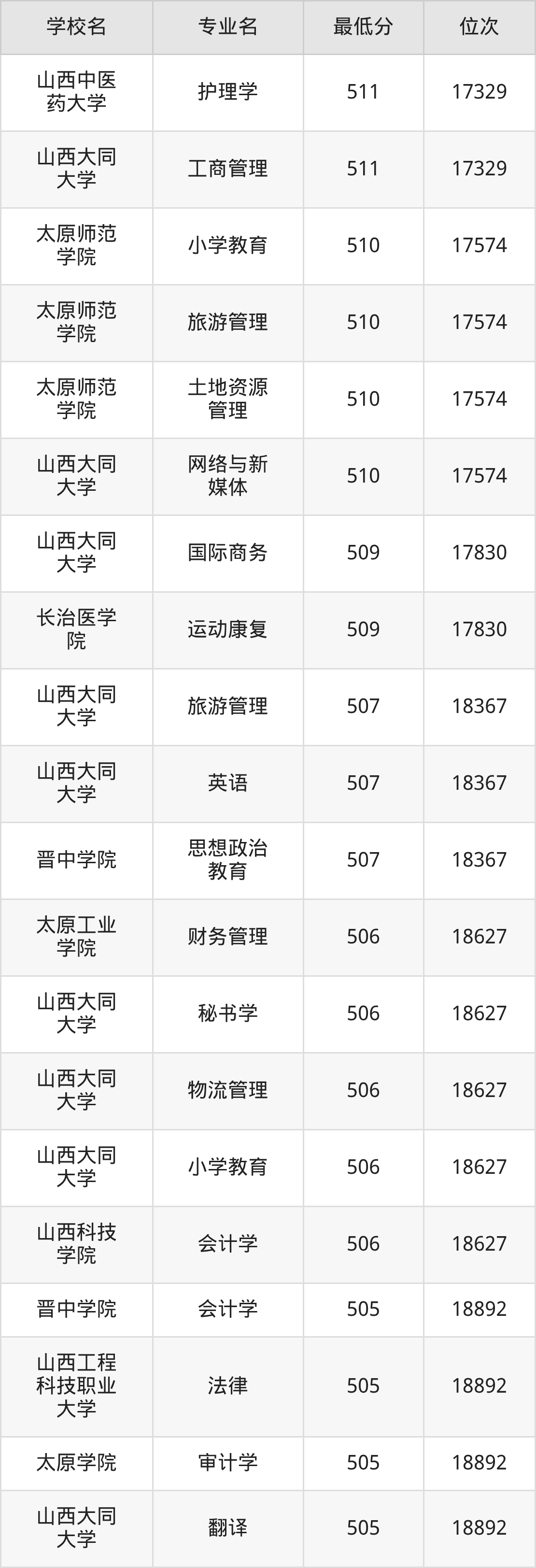 (3)山西中医药大学:2025年公办本科分数线511分到549分,位次区间是17329名到8599名,招生专业有6个,最低为护理学、最高为中医学。