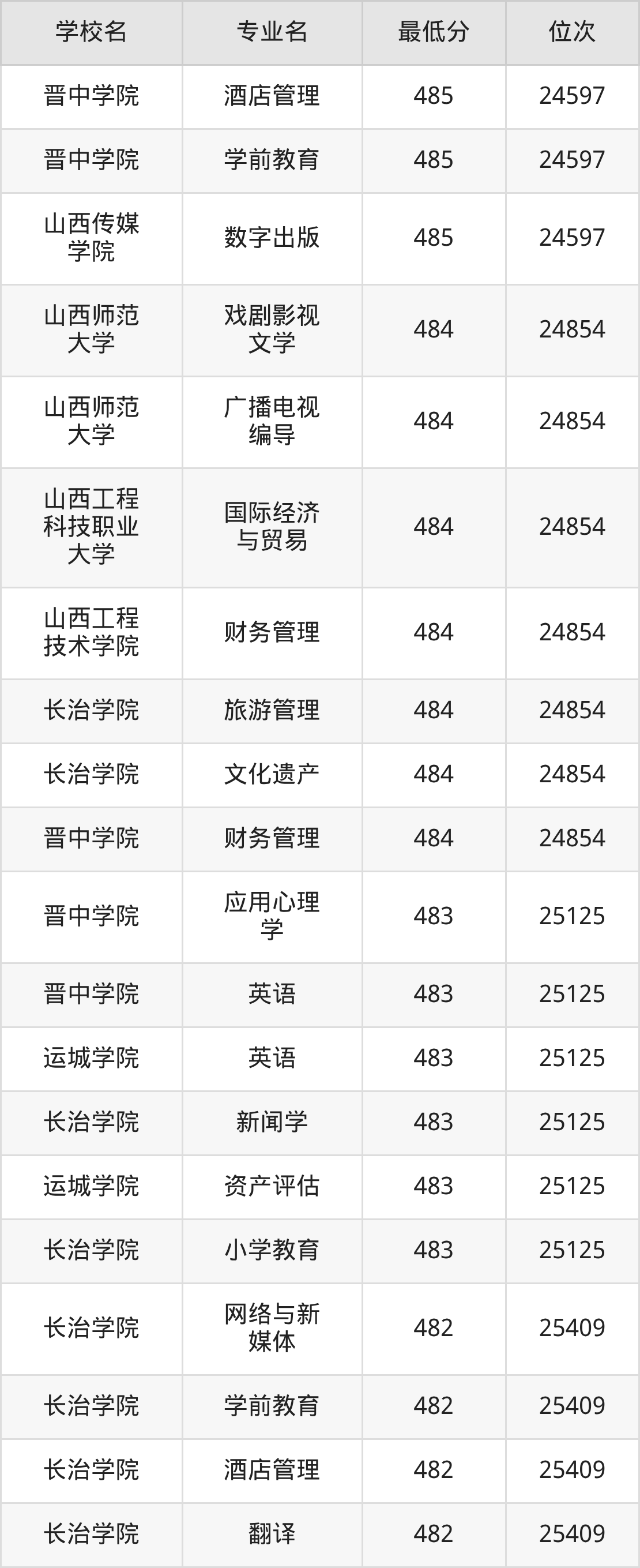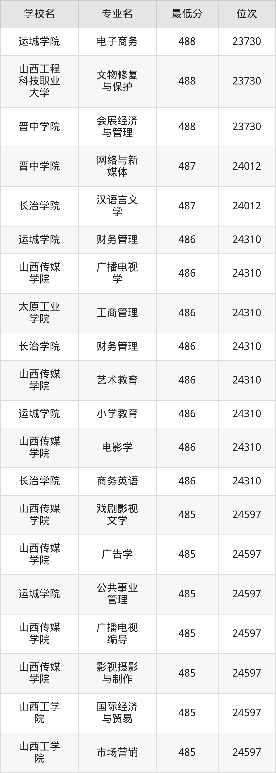 (4)山西传媒学院:2025年公办本科分数线455分到490分,位次区间是95192名到67880名,招生专业有17个,最低为广告学、影视摄影与制作、文化产业管理、数字出版、戏剧影视文学、最高为数字媒体技术。