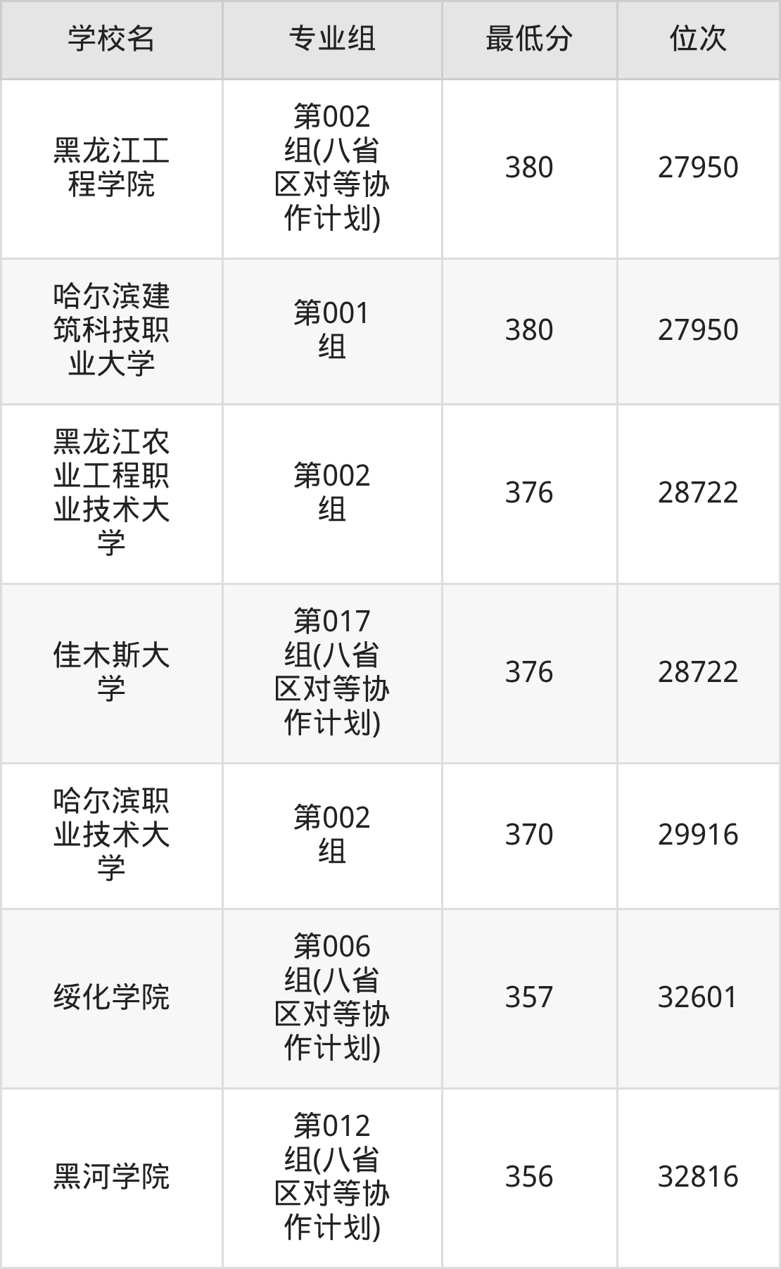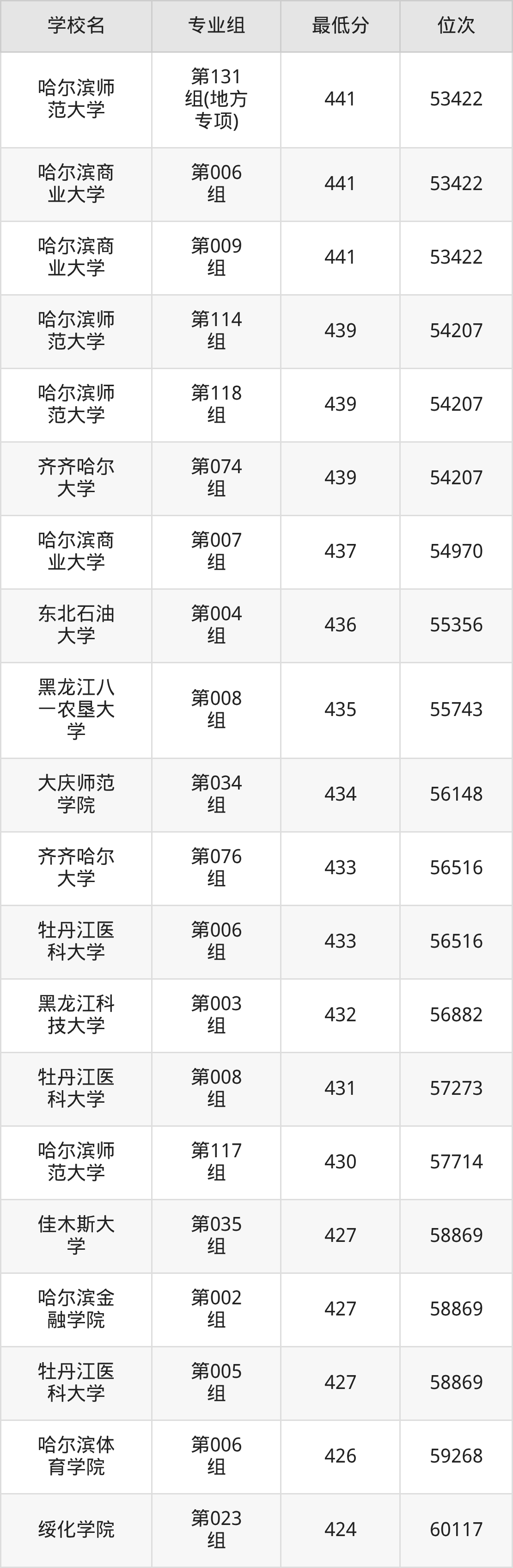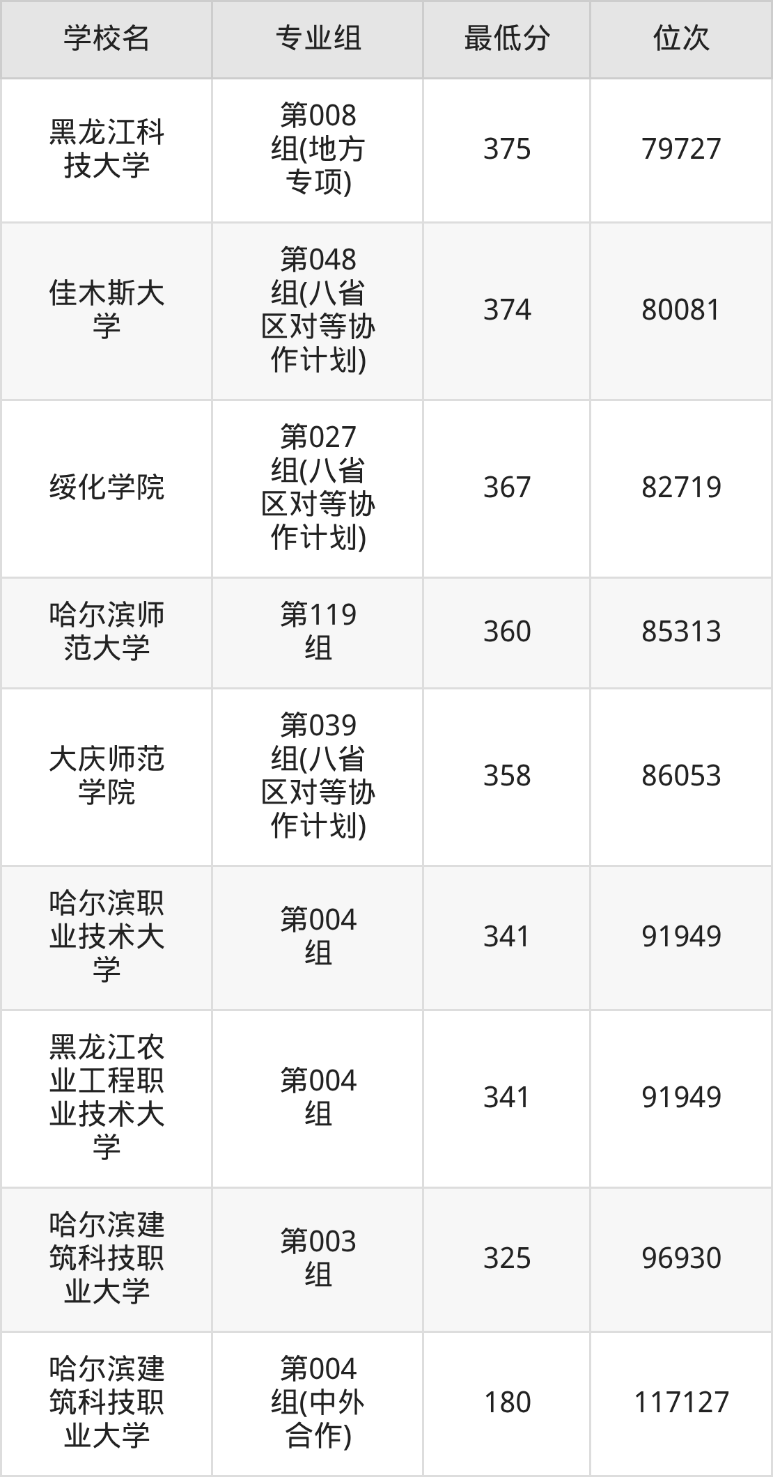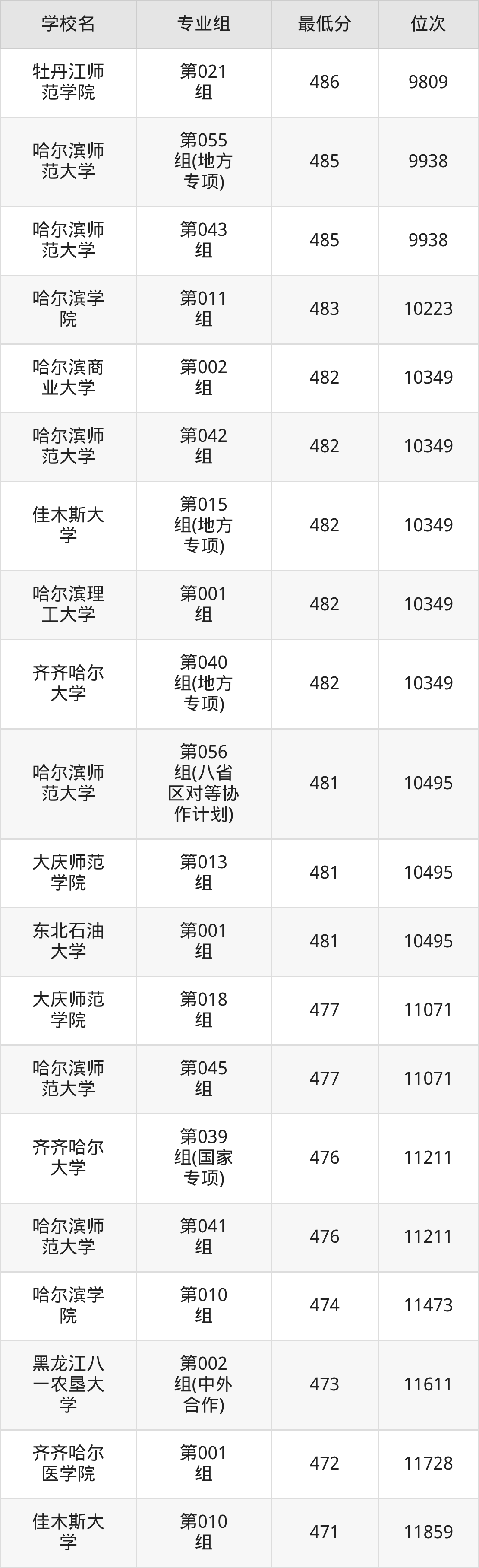 (2)哈尔滨学院:2025年公办本科分数线419分到483分,位次区间是20367名到10223名,招生专业组有5个,最低为第012组(八省区对等协作计划)、最高为第011组。
