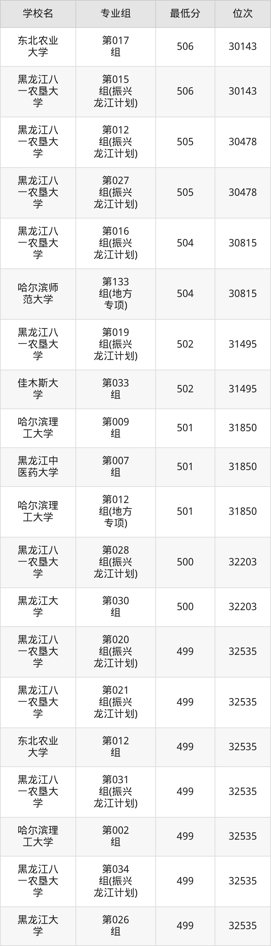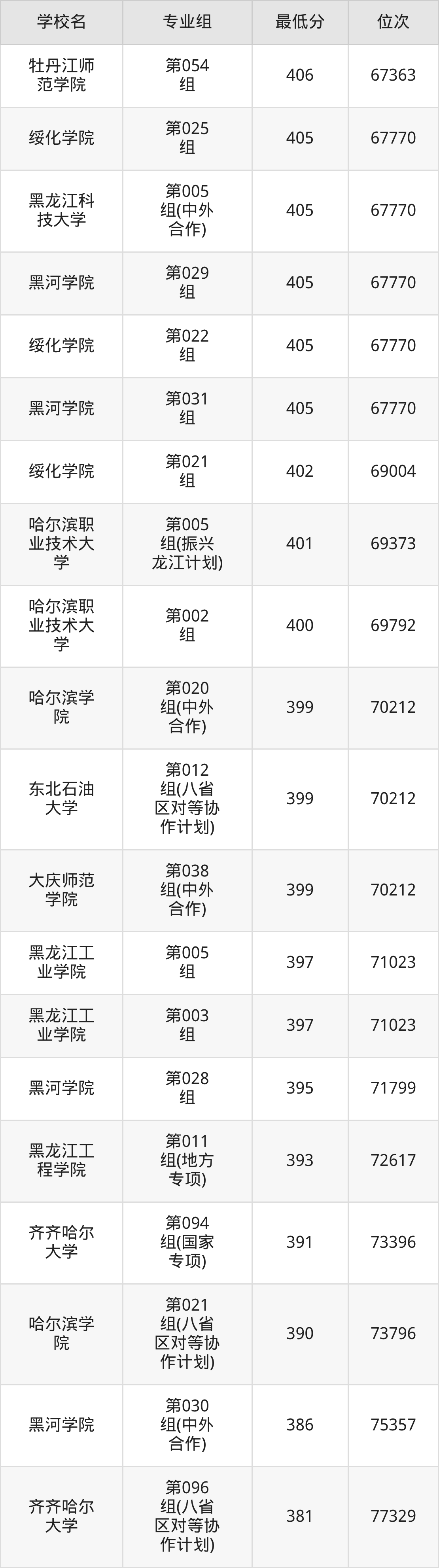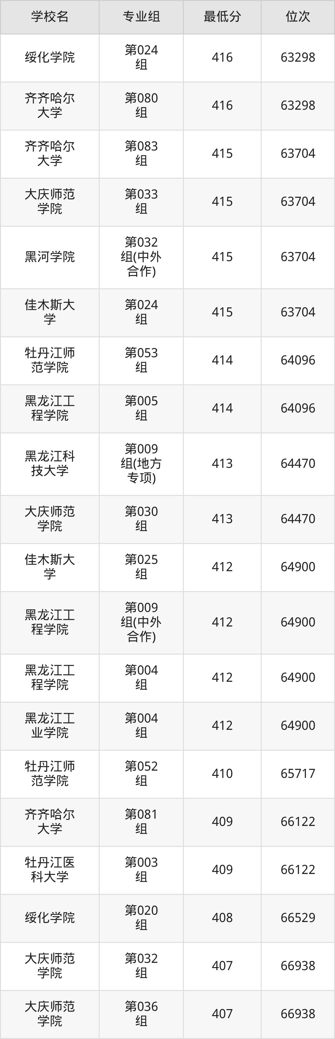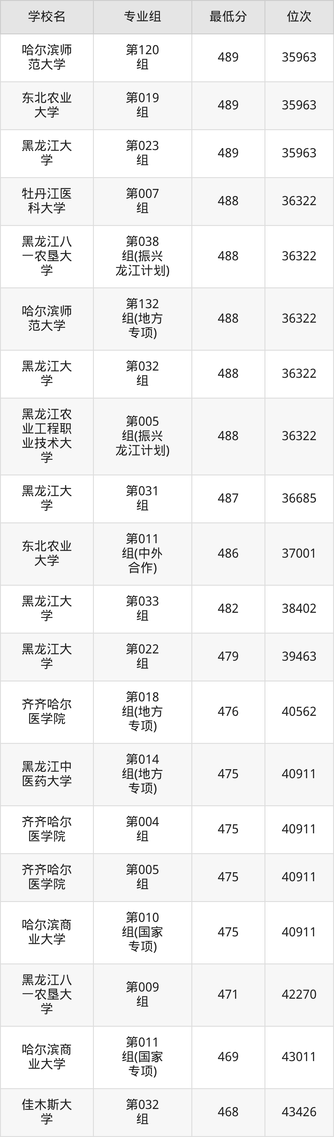 (2)哈尔滨学院:2025年公办本科分数线419分到483分,位次区间是20367名到10223名,招生专业组有5个,最低为第012组(八省区对等协作计划)、最高为第011组。