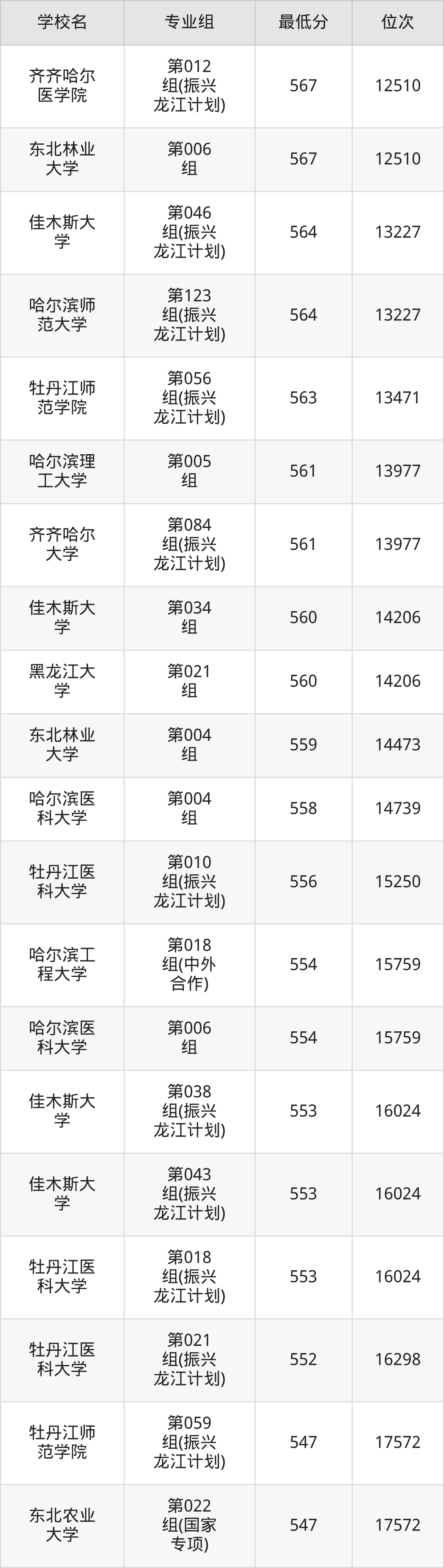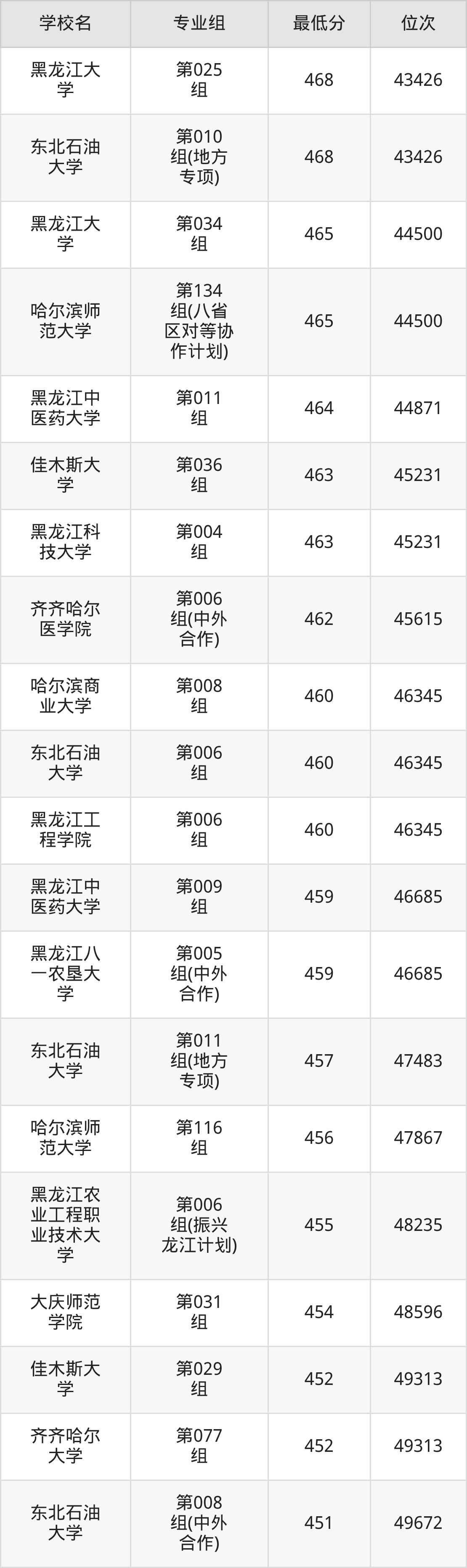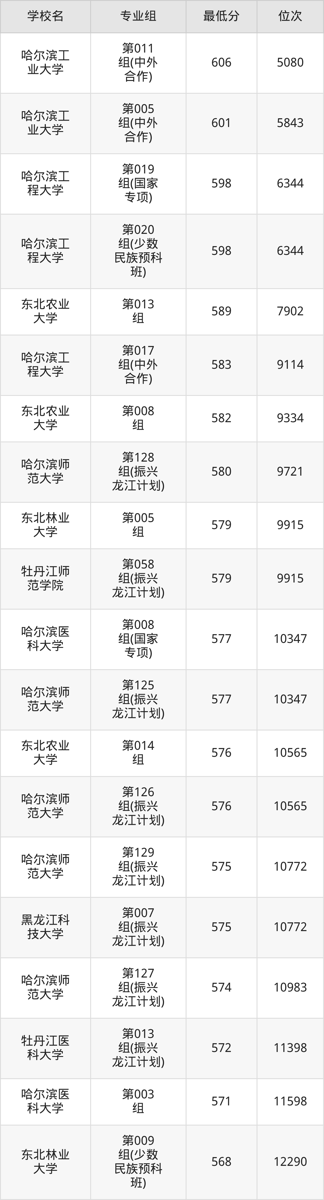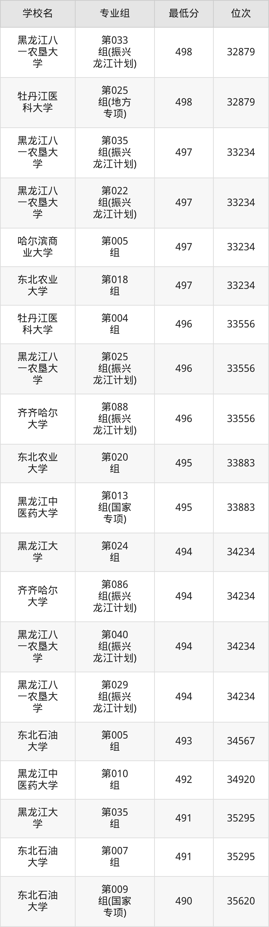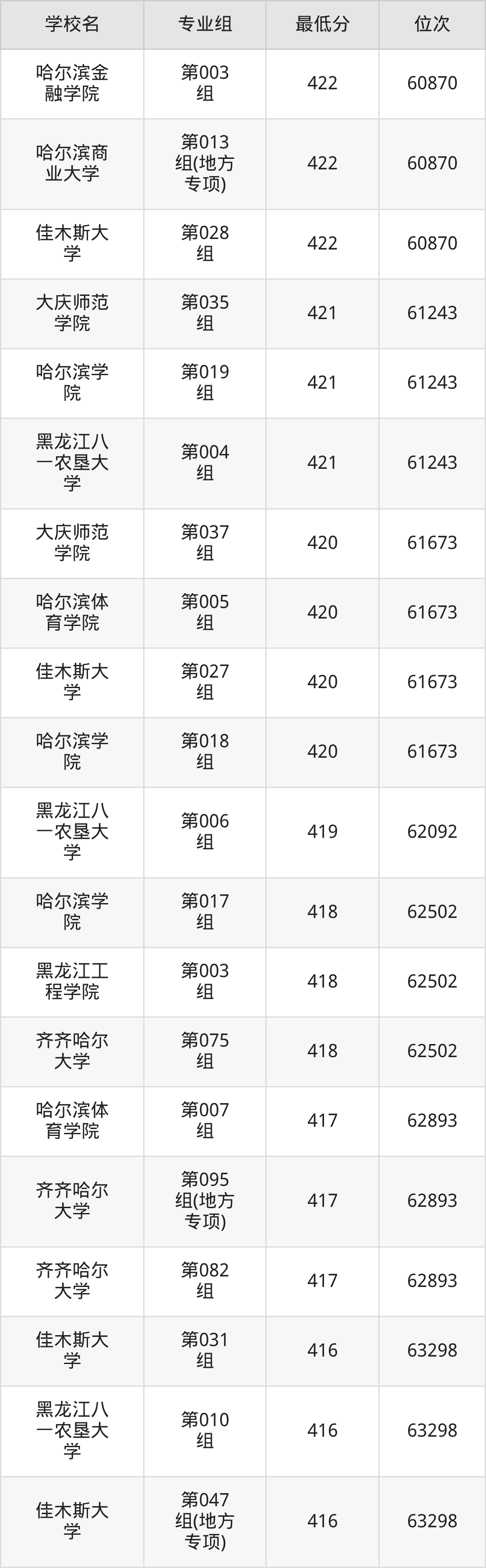 (2)哈尔滨学院:2025年公办本科分数线419分到483分,位次区间是20367名到10223名,招生专业组有5个,最低为第012组(八省区对等协作计划)、最高为第011组。