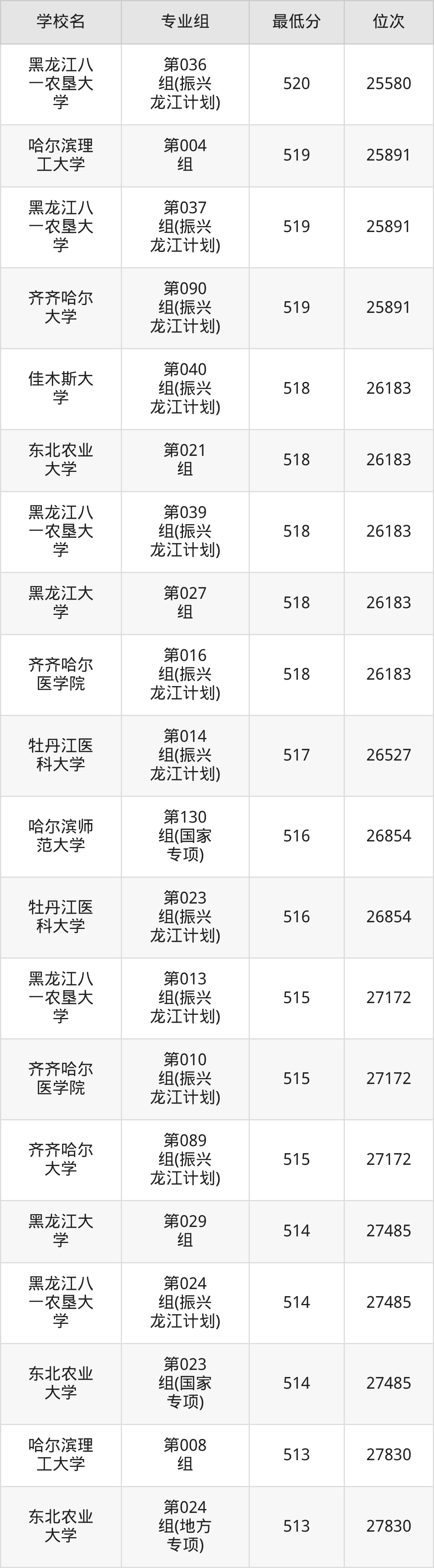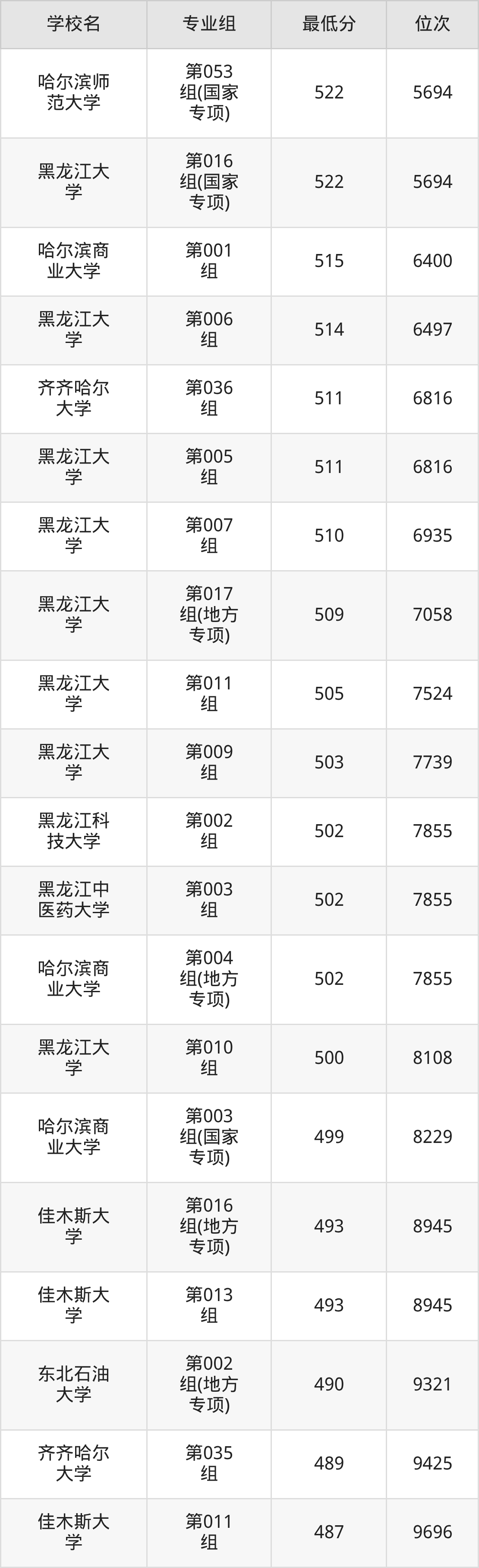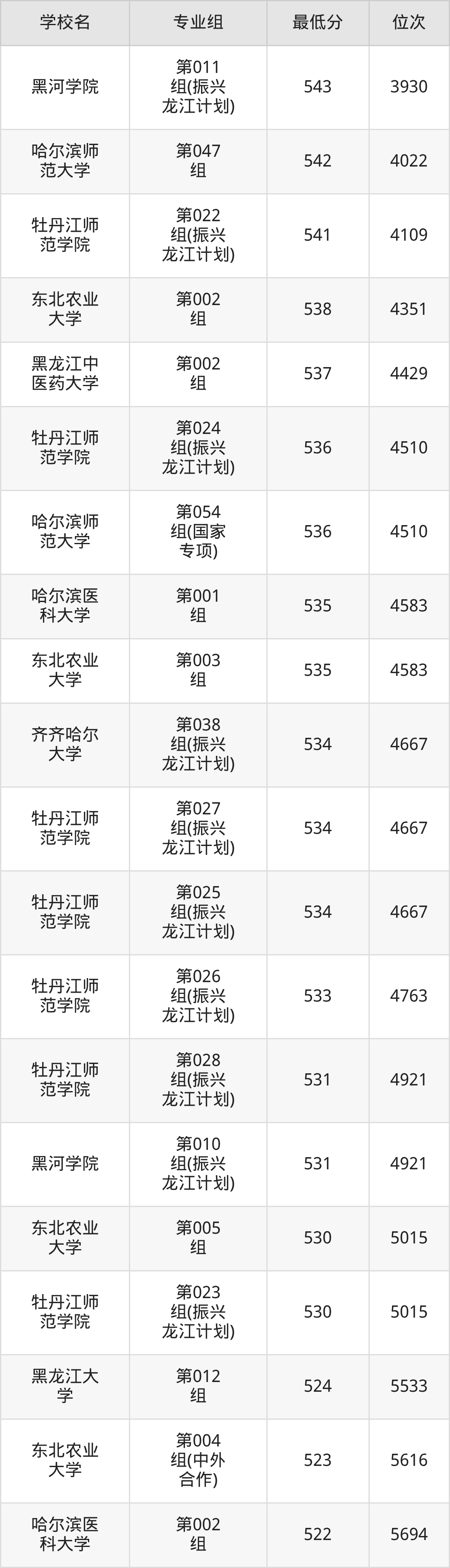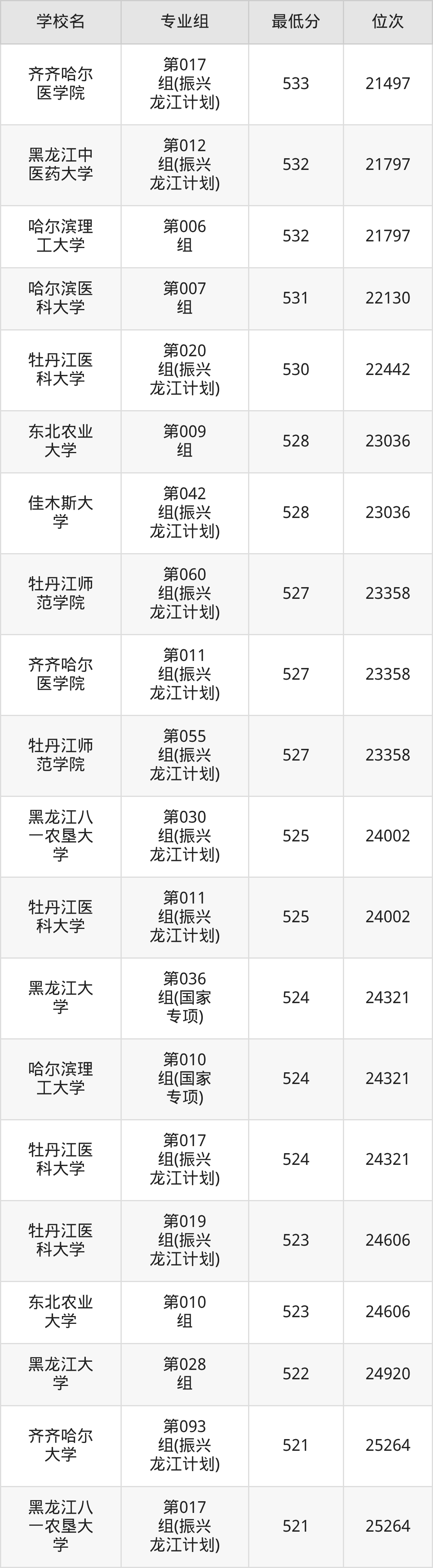 (2)哈尔滨学院:2025年公办本科分数线419分到483分,位次区间是20367名到10223名,招生专业组有5个,最低为第012组(八省区对等协作计划)、最高为第011组。