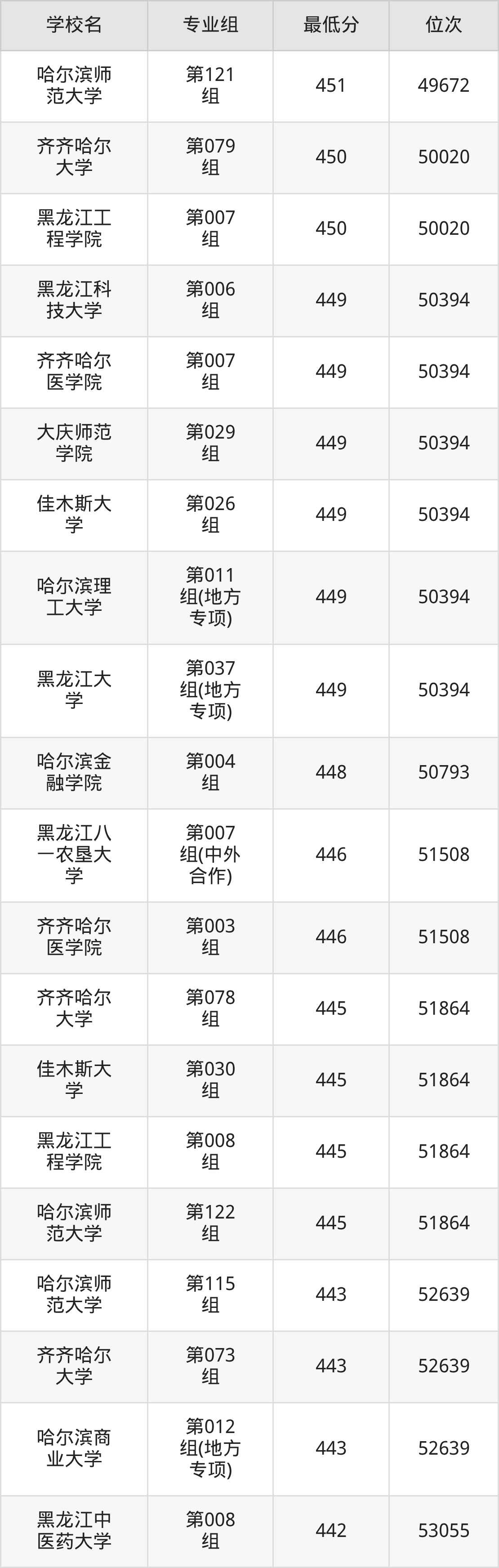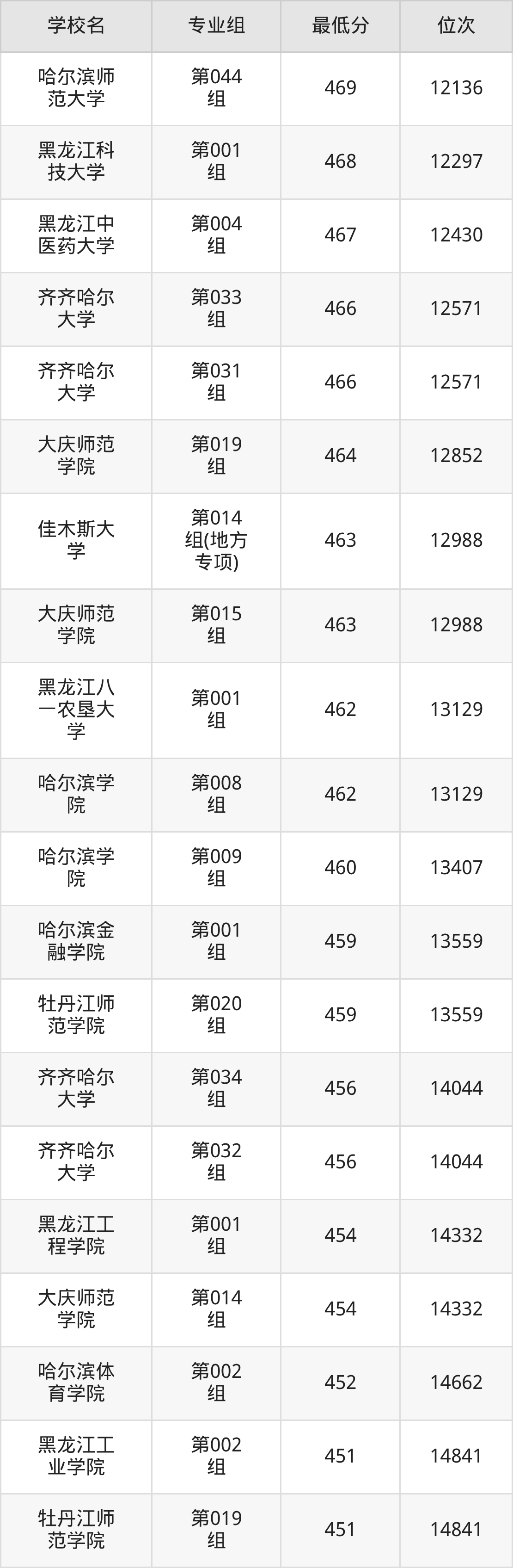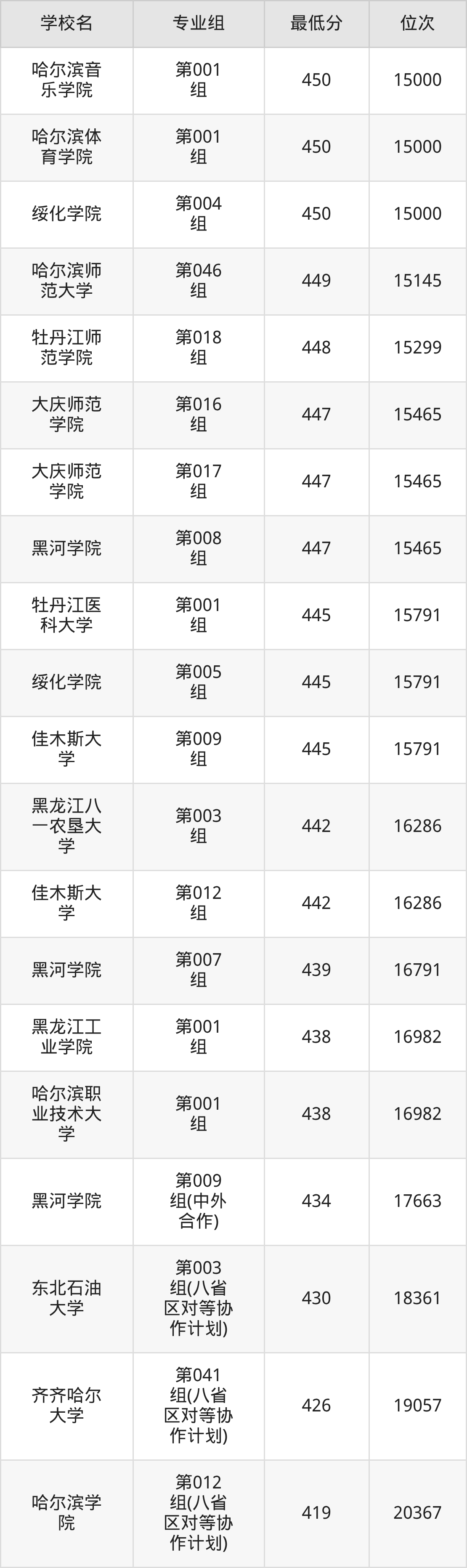 (3)哈尔滨音乐学院:2025年公办本科分数线450分,位次是15000名,招生专业组有1个,最低为第001组。