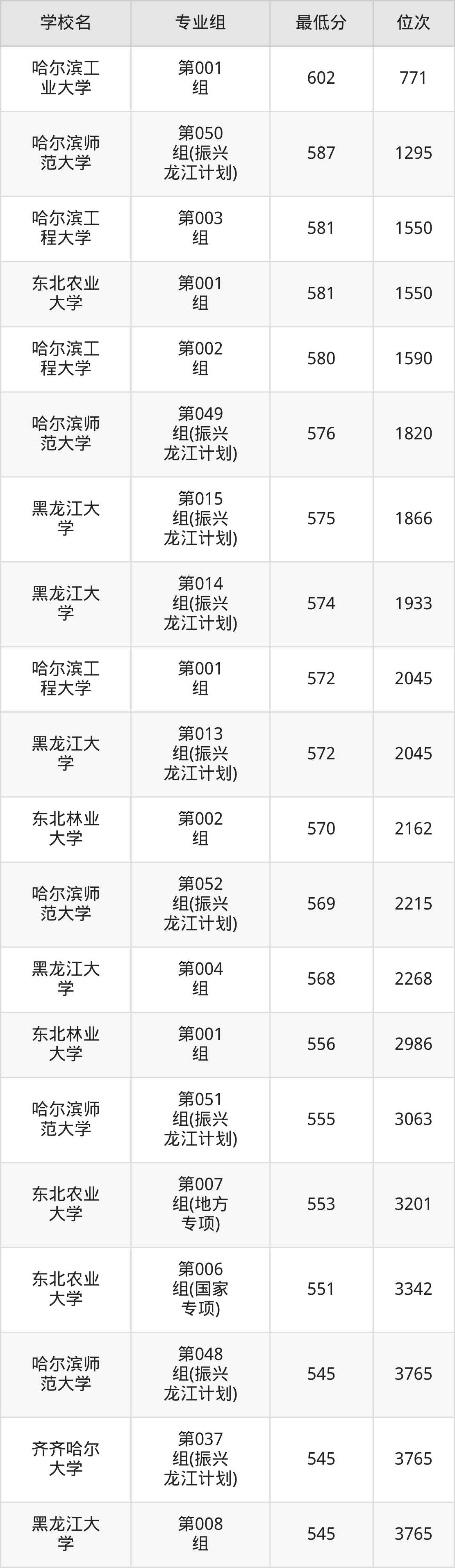 2025年黑龙江公办本科历史类最低录取分数线是356分,位次排名是32816名,对应收分最低的是黑河学院(第012组(八省区对等协作计划))。录取分数线最高的是哈尔滨工业大学第001组,2025年最低分602分、位次是771名。