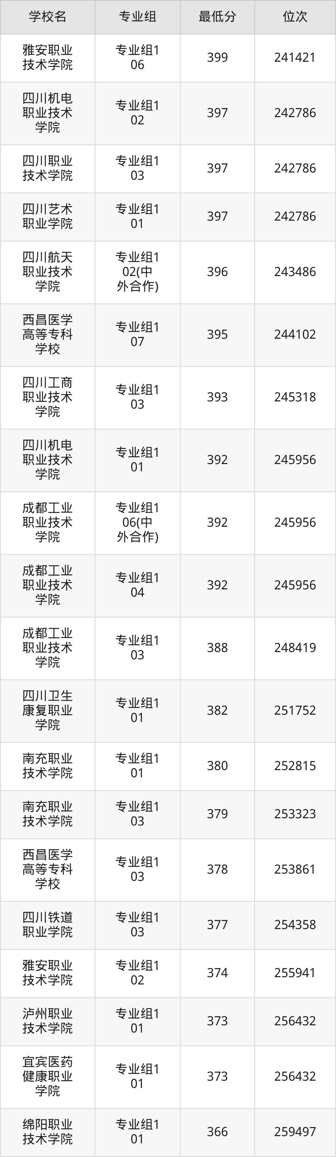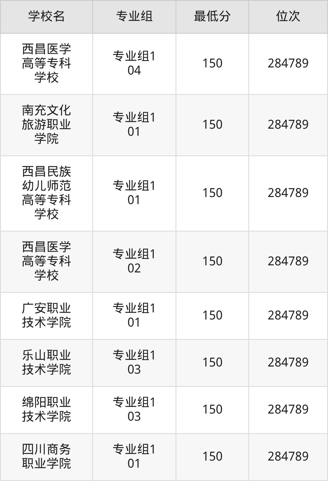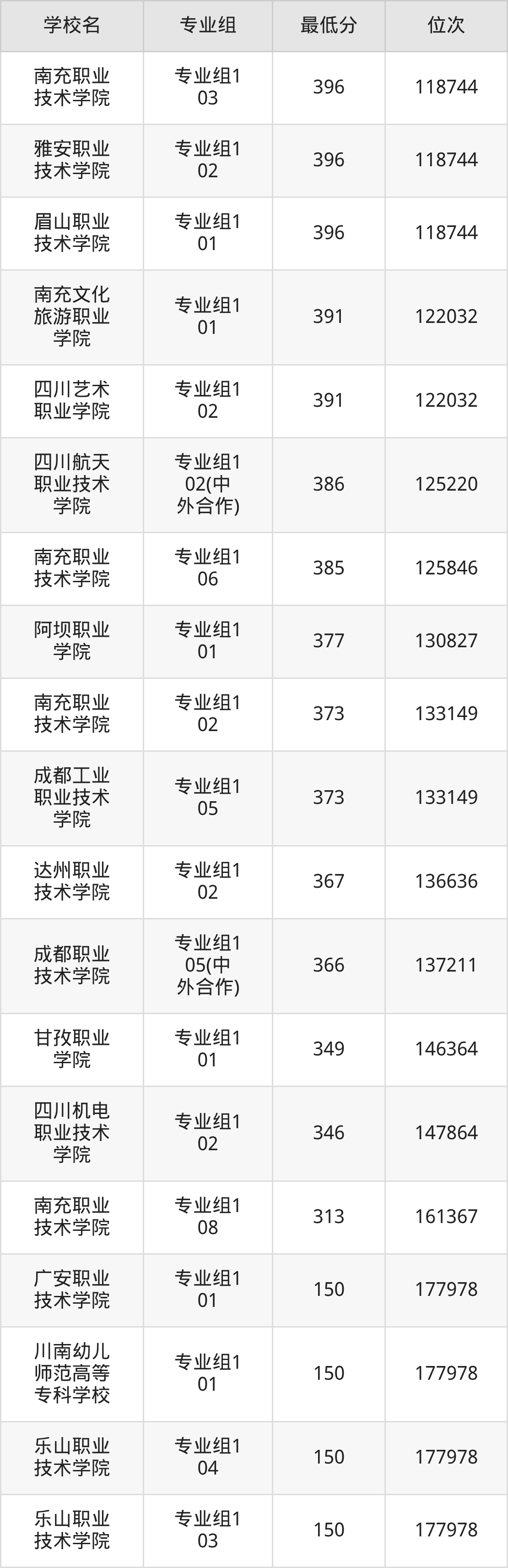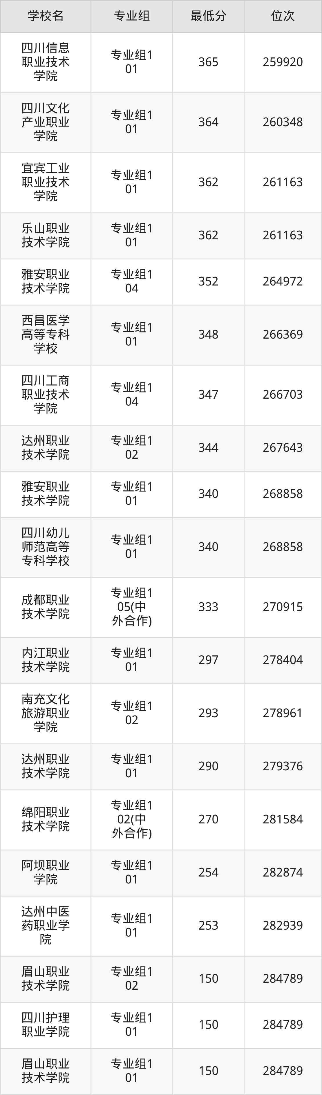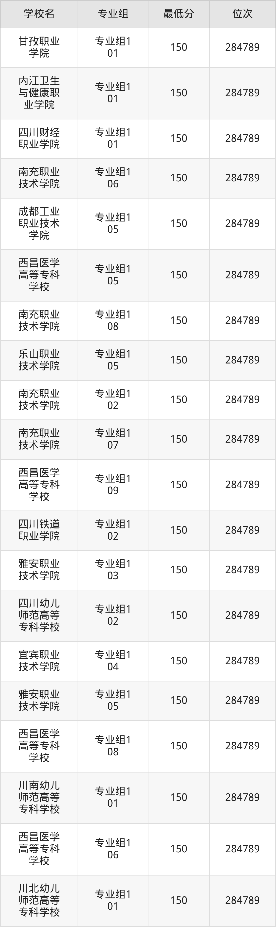 (2)甘孜职业学院:2025年公办大专分数线150分,位次是284789名,招生专业组有1个,最低为专业组101。