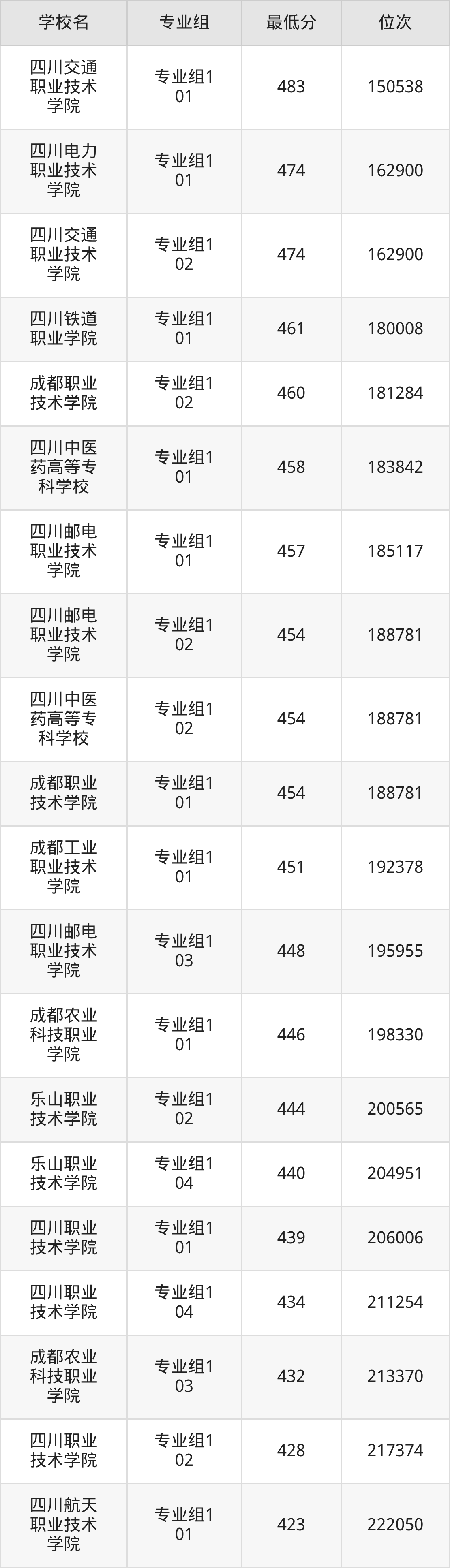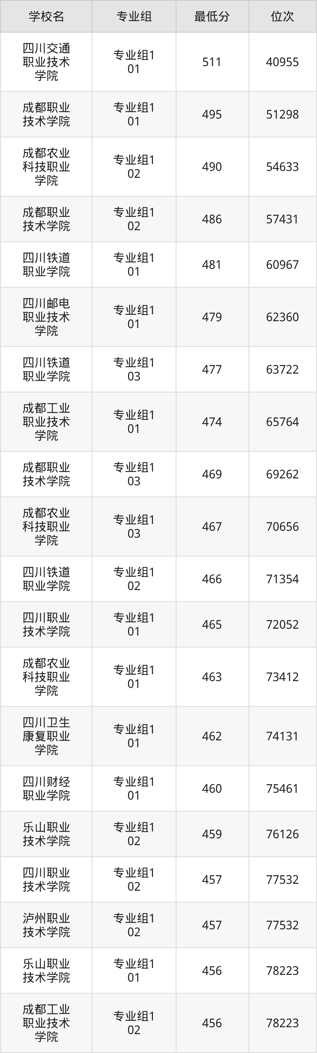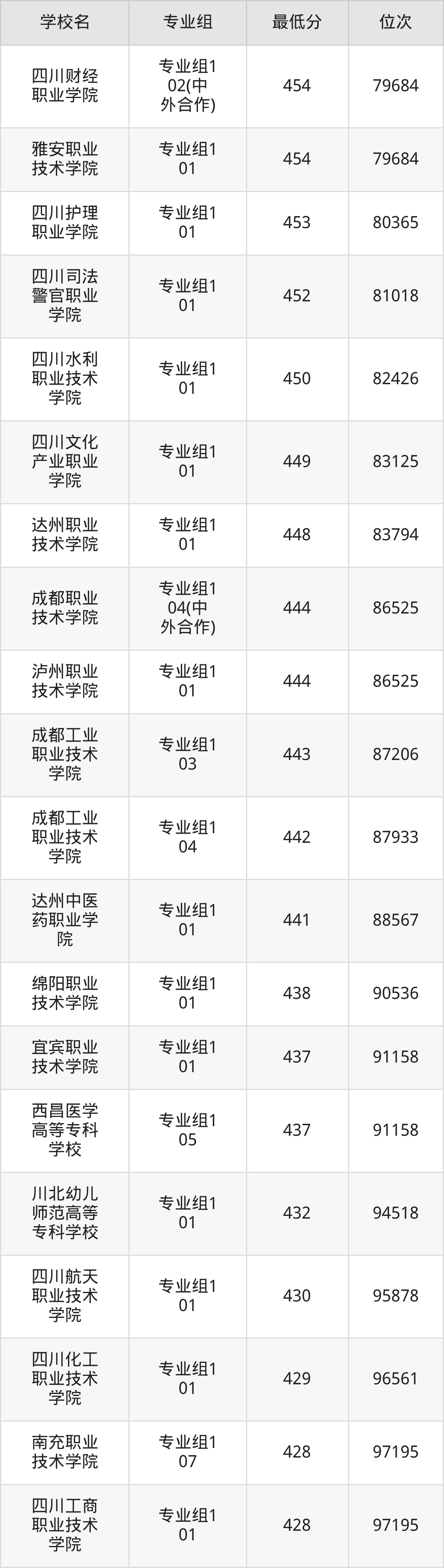 (2)四川卫生康复职业学院:2025年公办大专分数线462分,位次是74131名,招生专业组有1个,最低为专业组101。