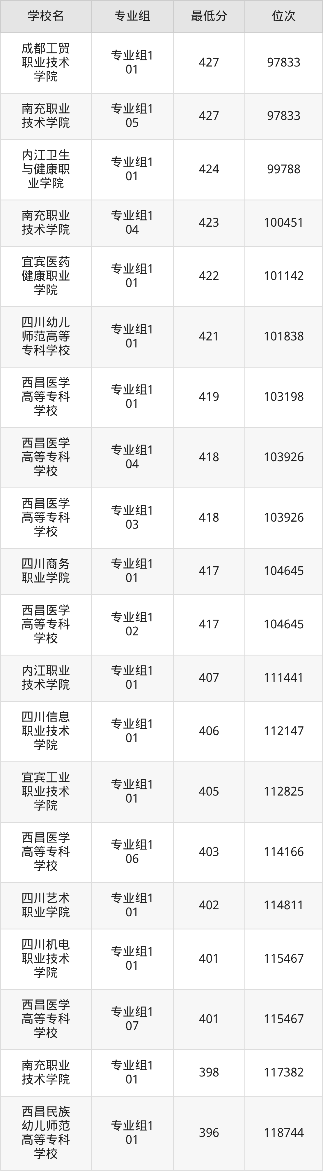 (3)成都工贸职业技术学院:2025年公办大专分数线427分,位次是97833名,招生专业组有1个,最低为专业组101。
