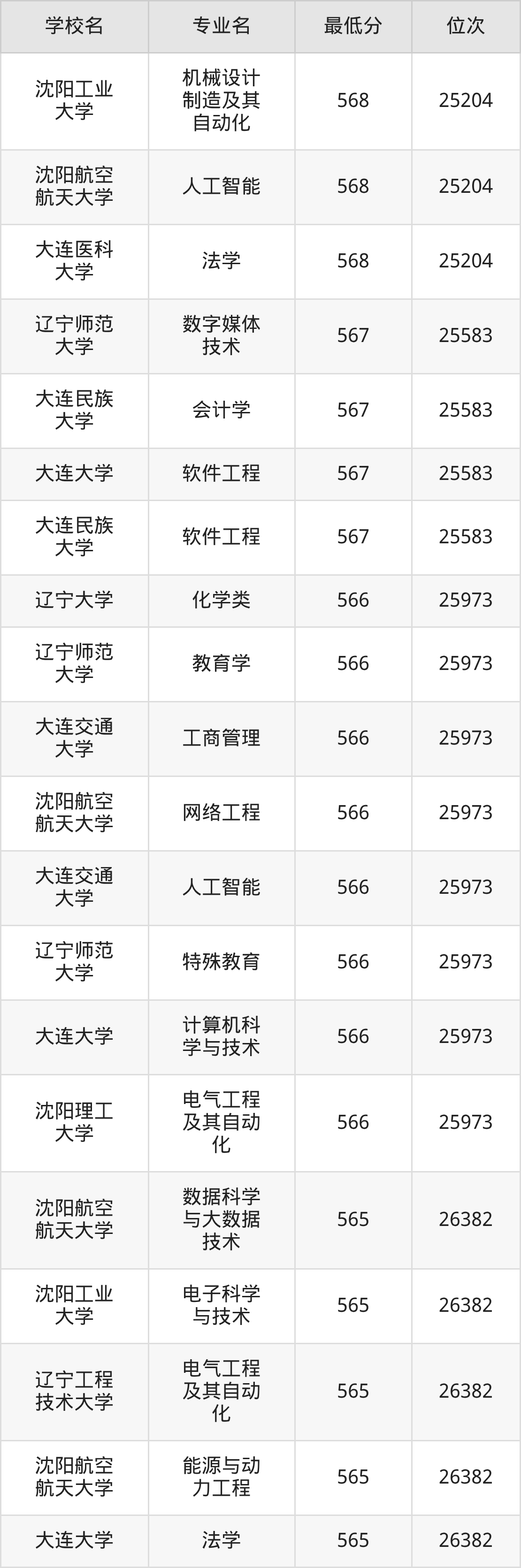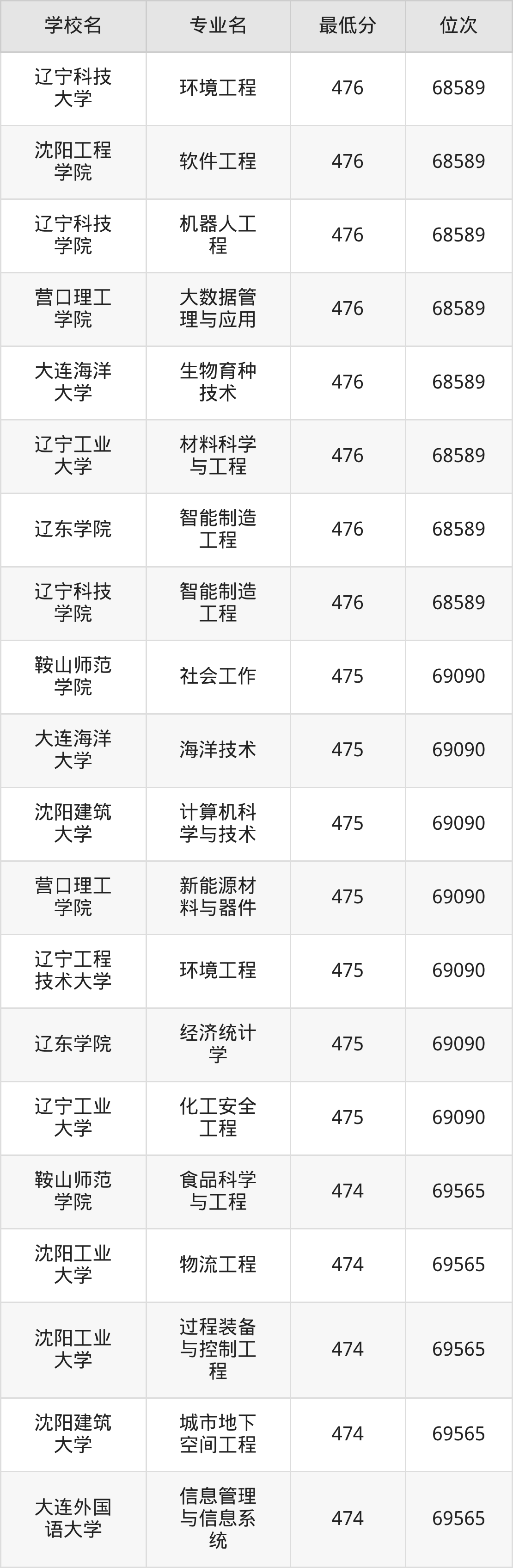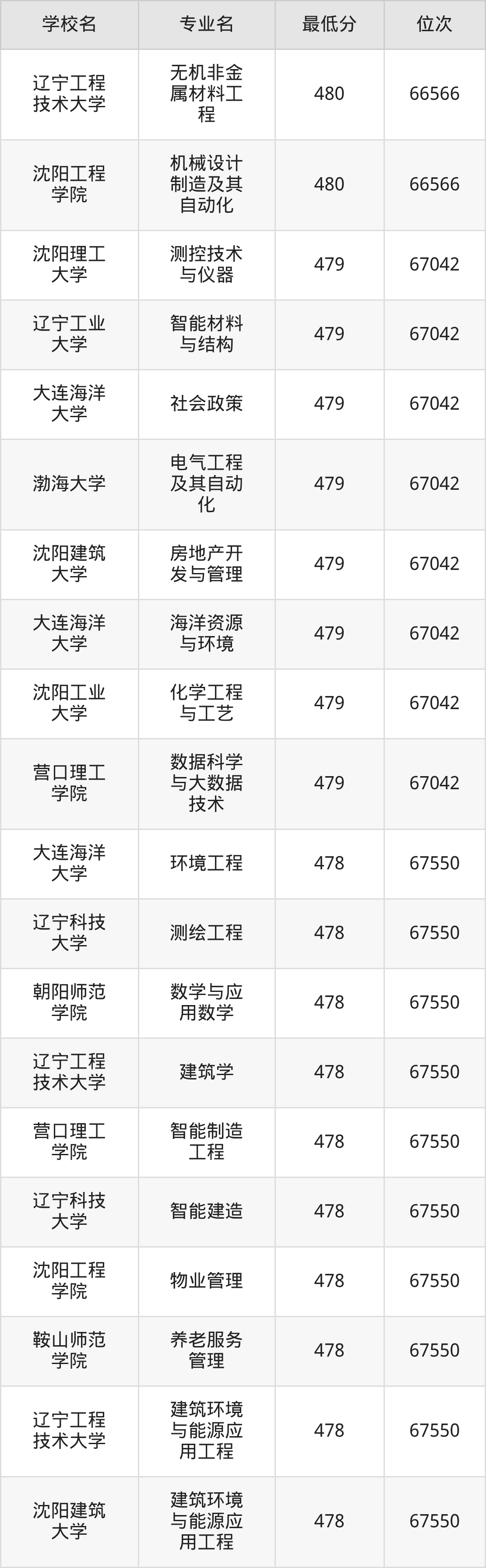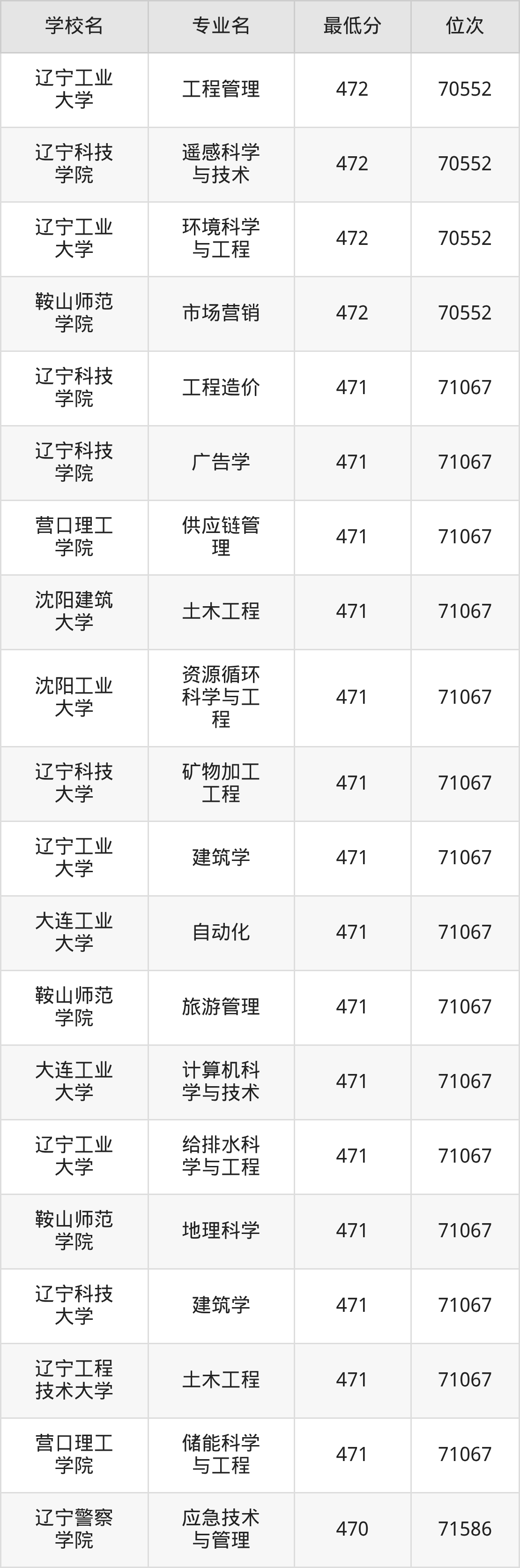 (4)辽宁工程技术大学:2025年公办本科分数线471分到565分,位次区间是71067名到26382名,招生专业有58个,最低为土木工程、最高为电气工程及其自动化。