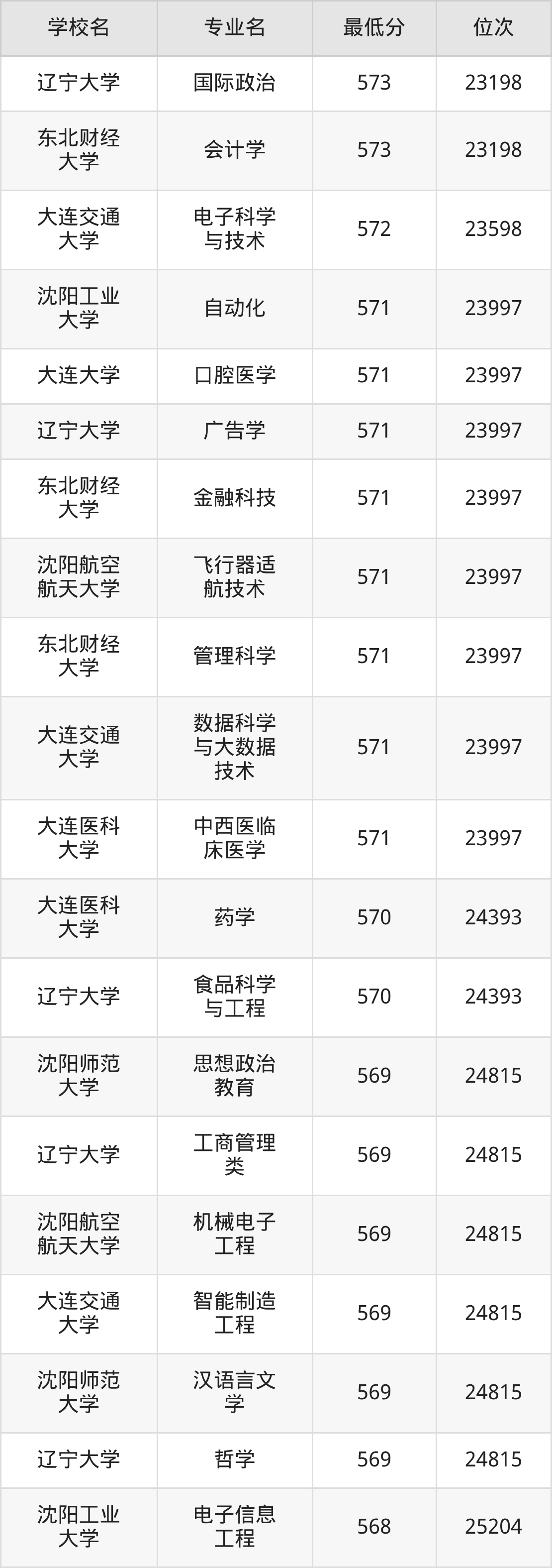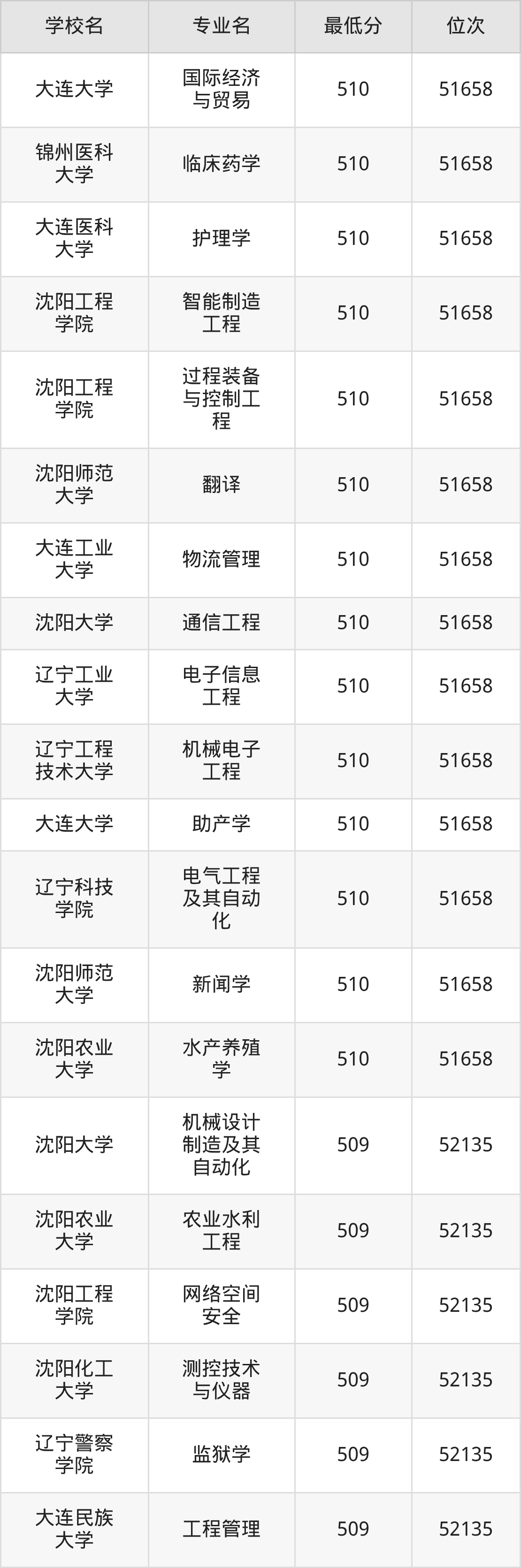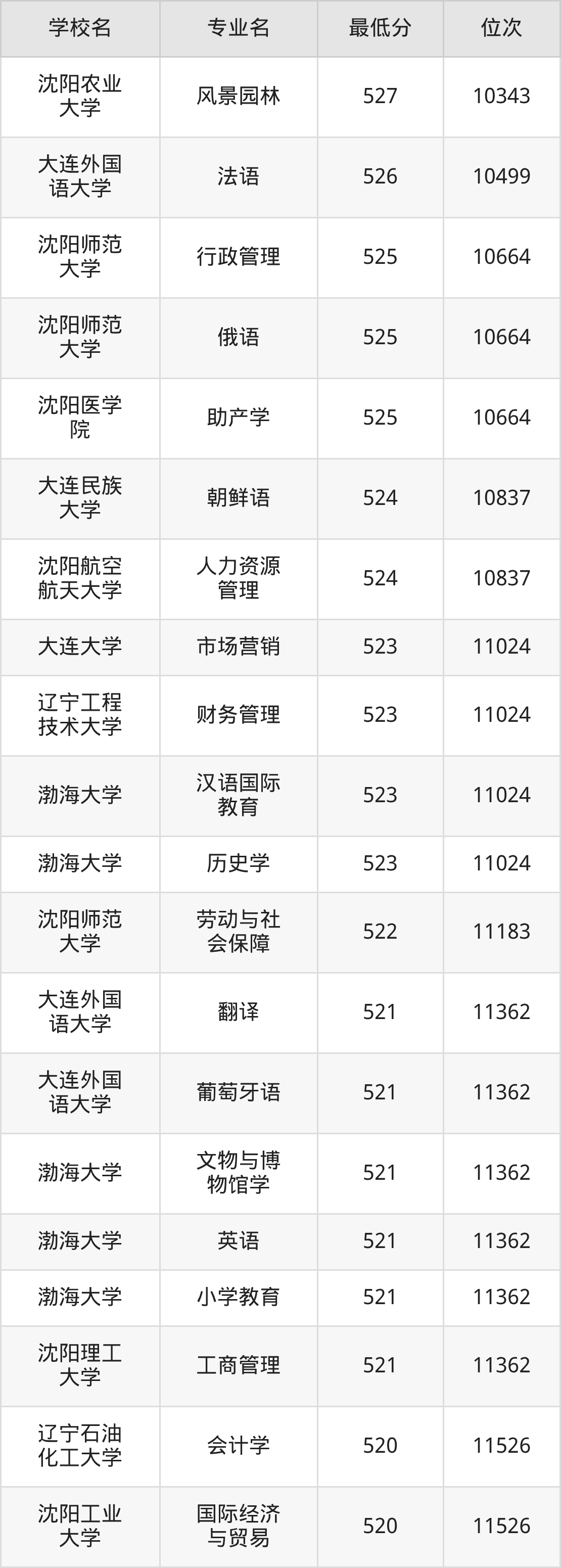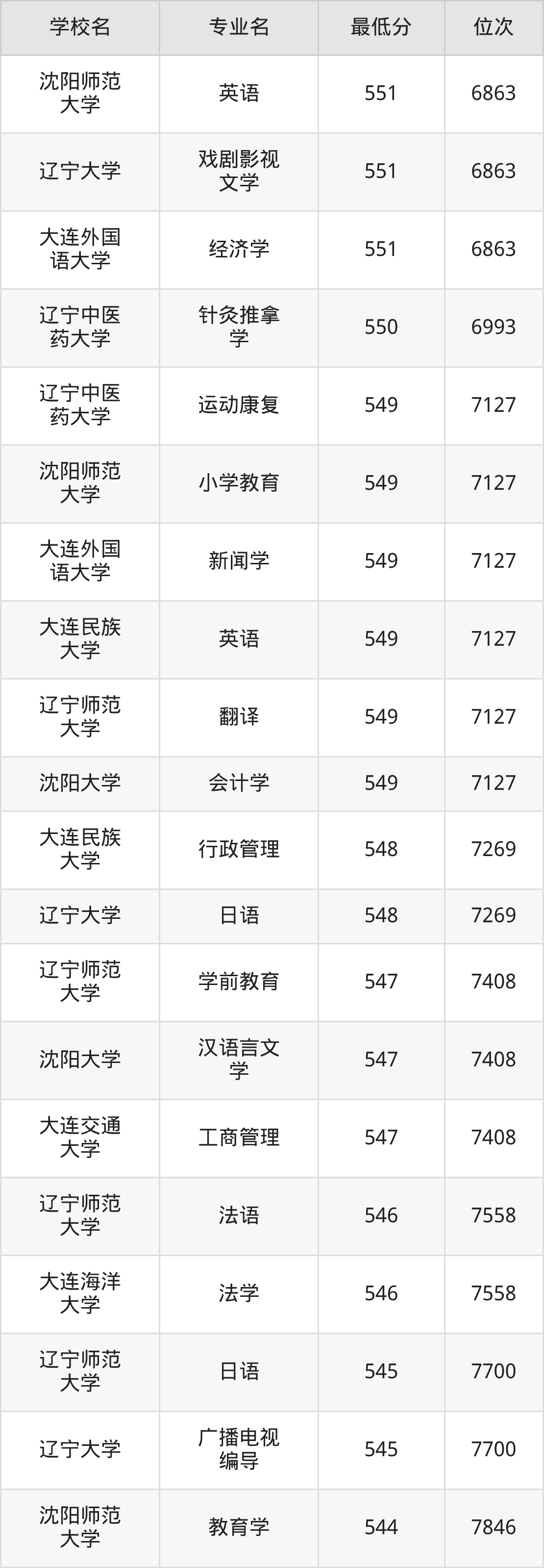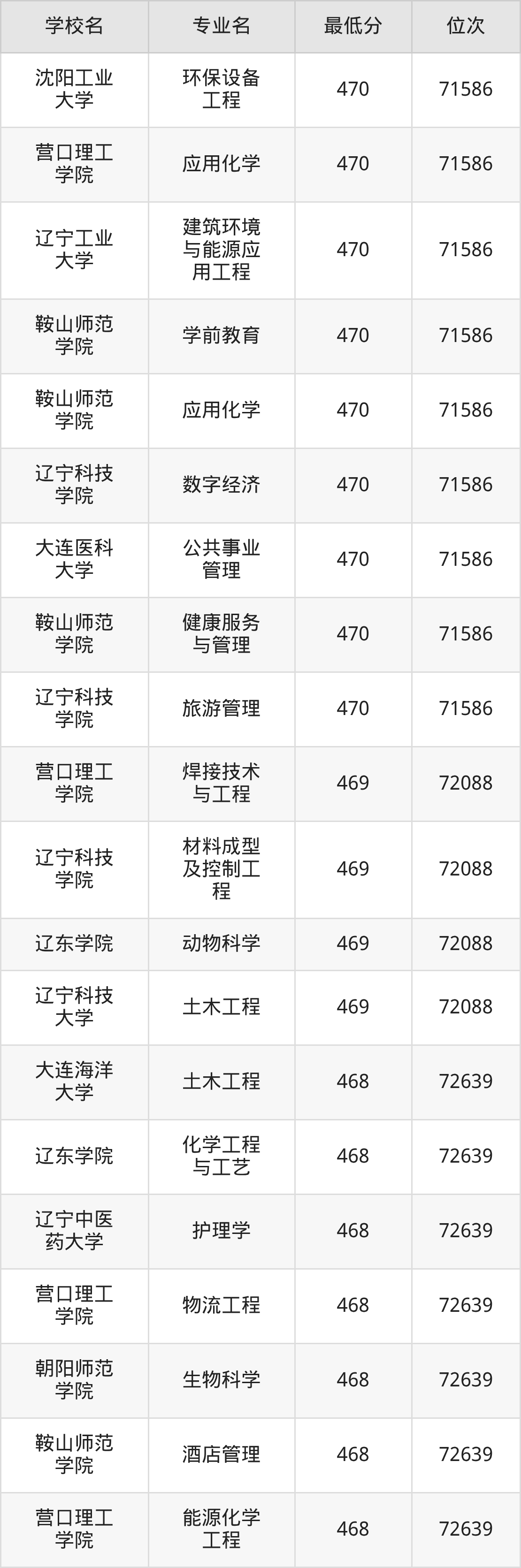 (3)辽宁中医药大学:2025年公办本科分数线437分到571分,位次区间是26916名到4523名,招生专业有11个,最低为护理学、最高为中医学。