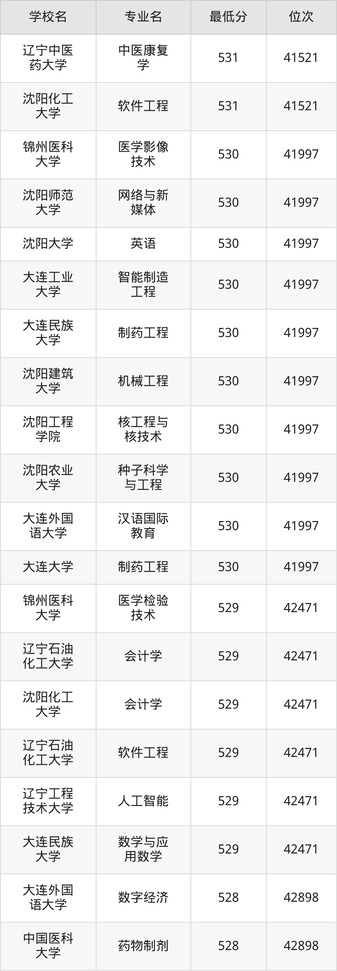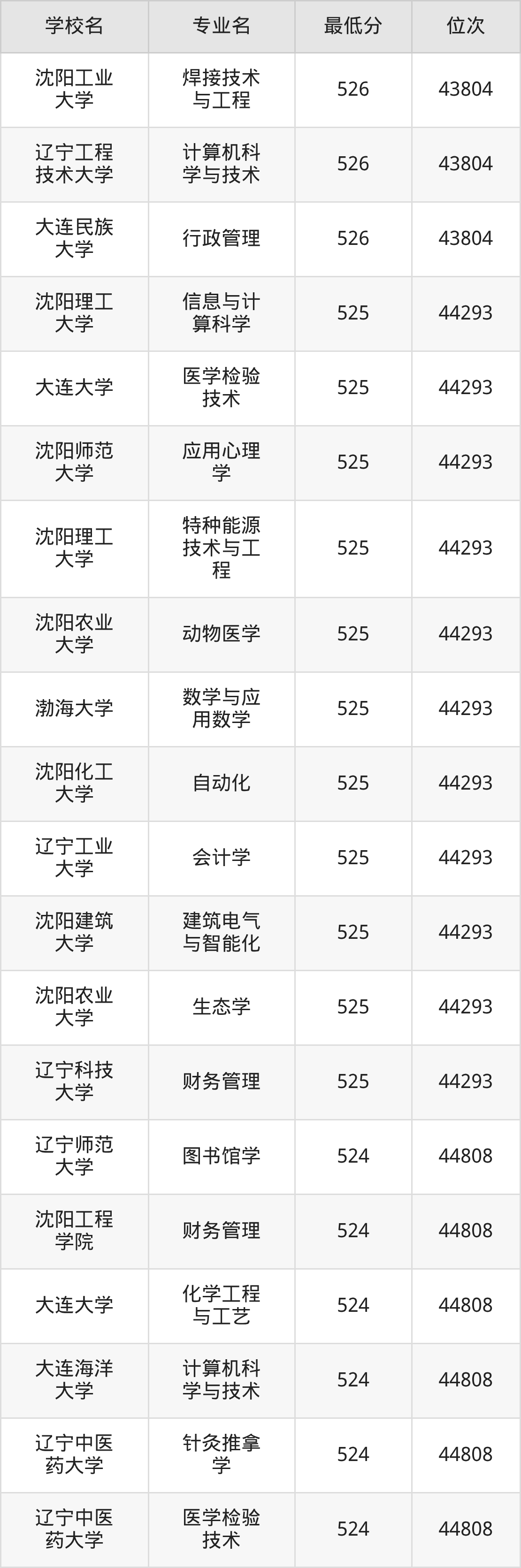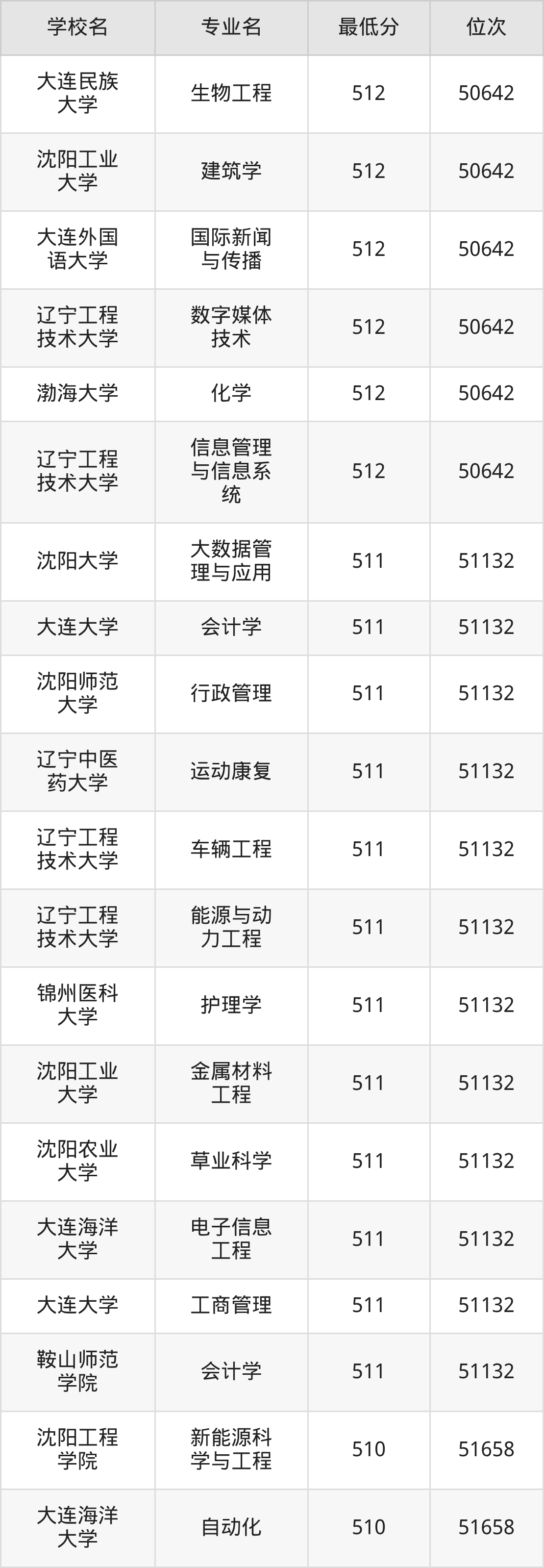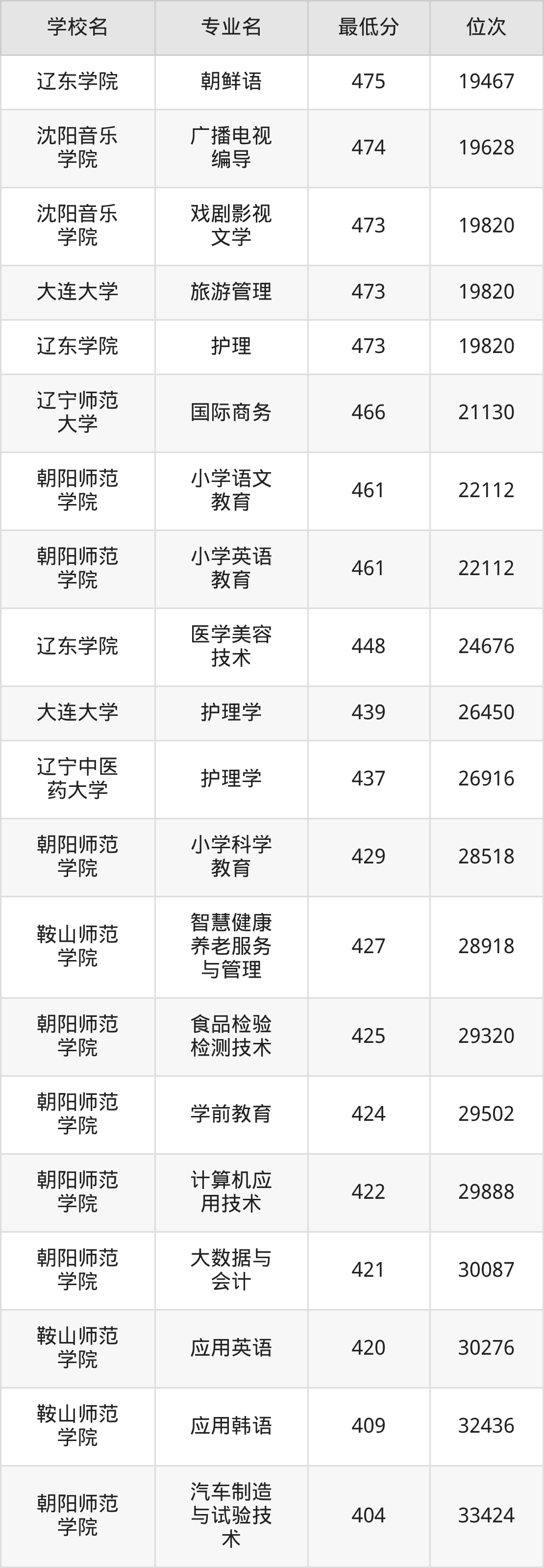 (3)辽宁中医药大学:2025年公办本科分数线437分到571分,位次区间是26916名到4523名,招生专业有11个,最低为护理学、最高为中医学。