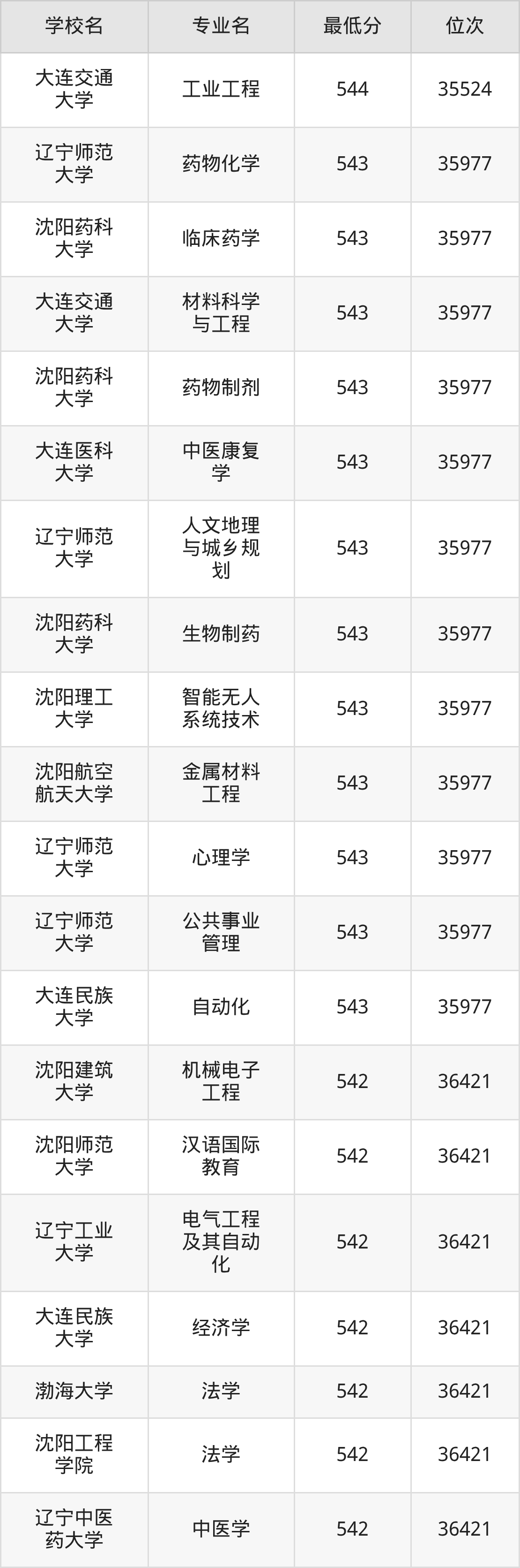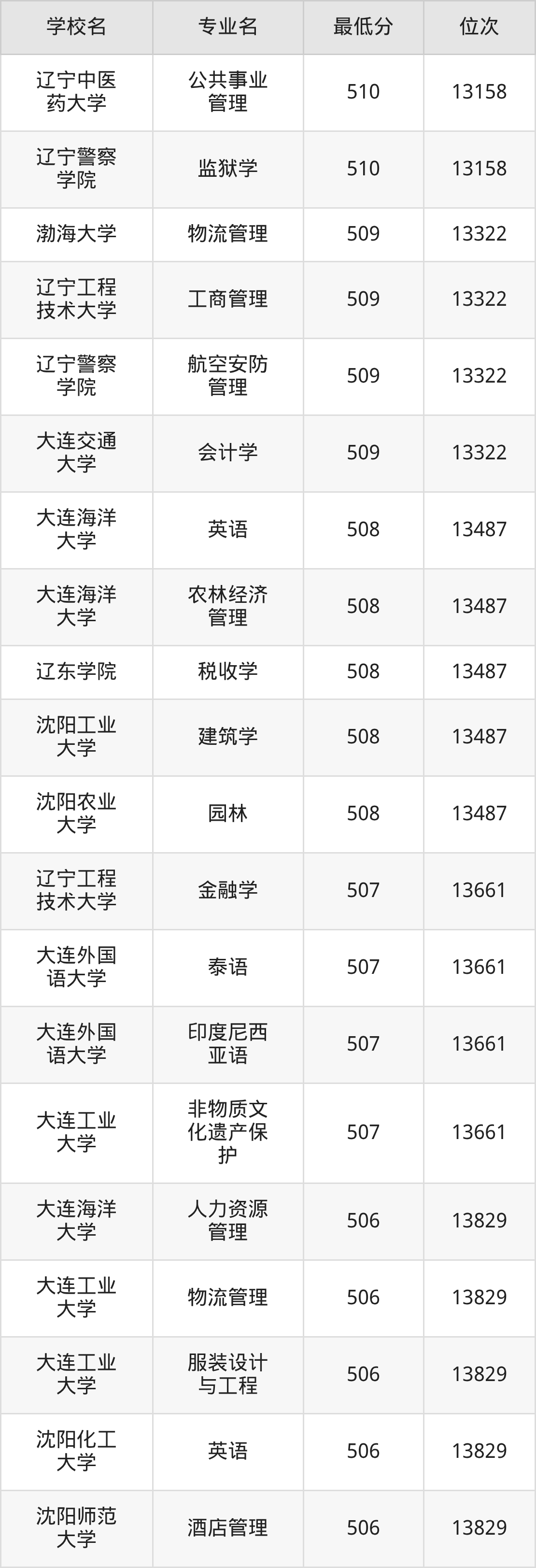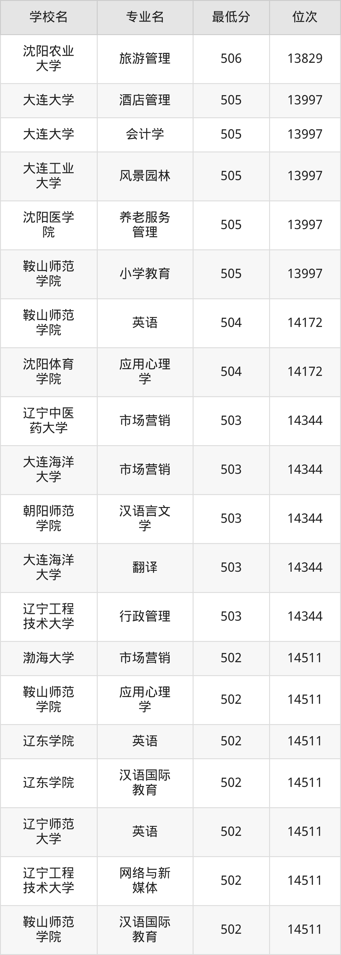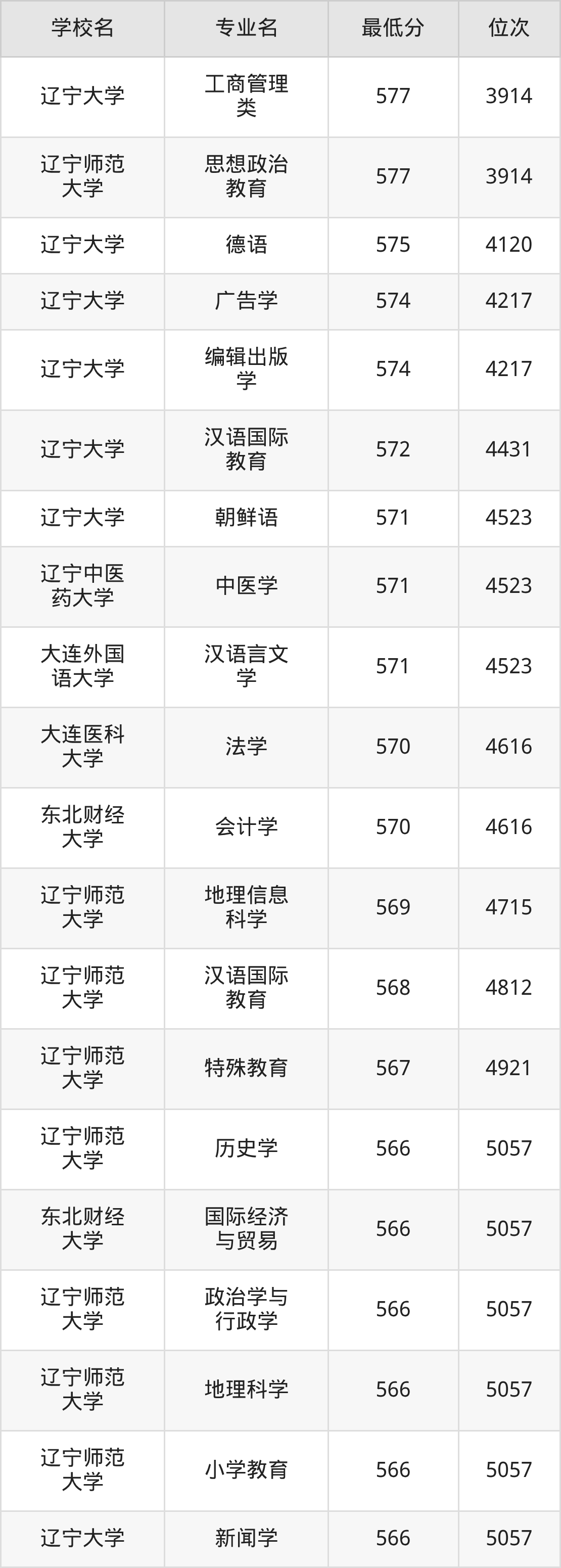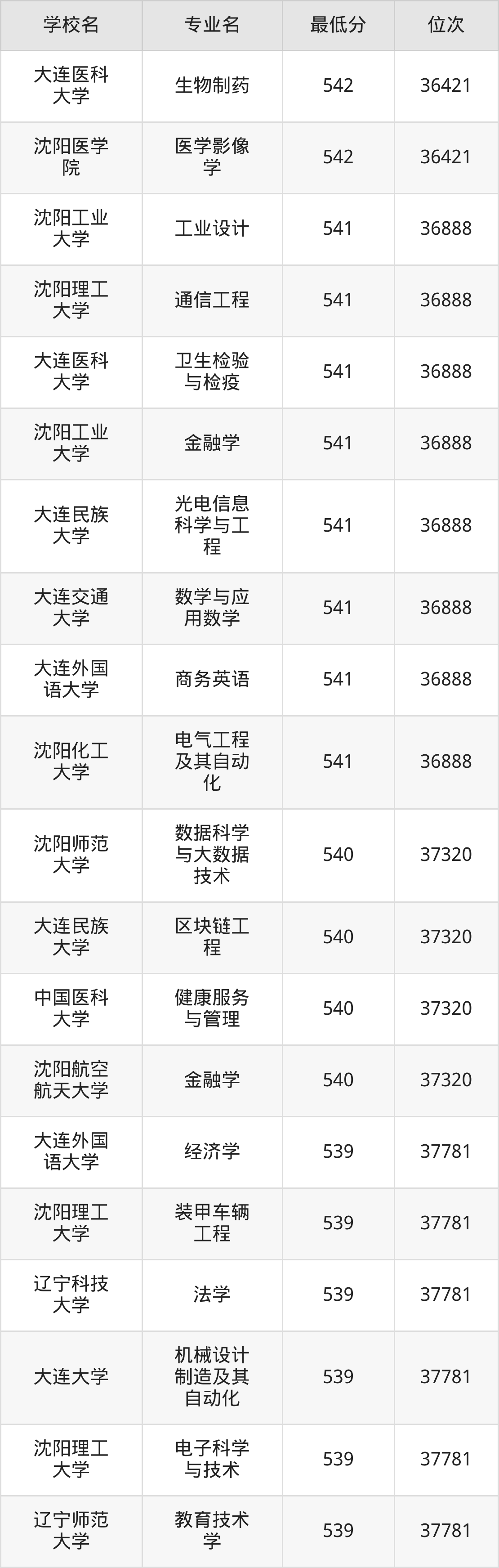 (3)辽宁中医药大学:2025年公办本科分数线437分到571分,位次区间是26916名到4523名,招生专业有11个,最低为护理学、最高为中医学。