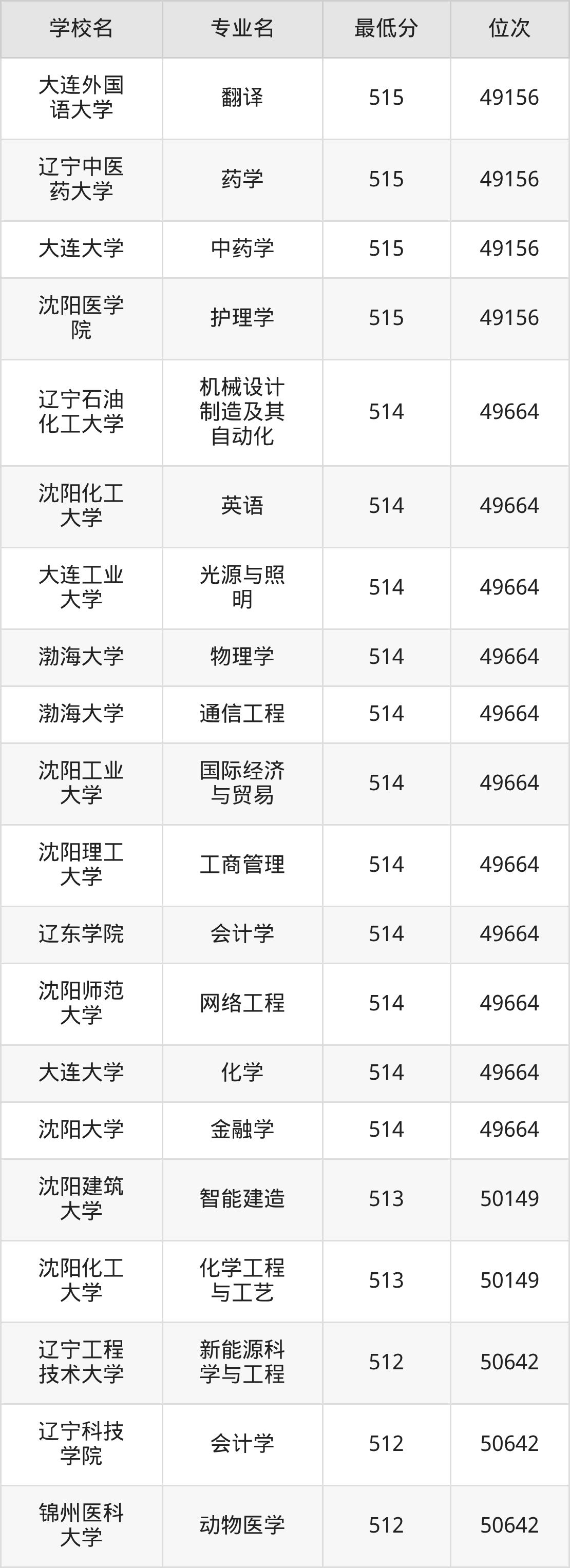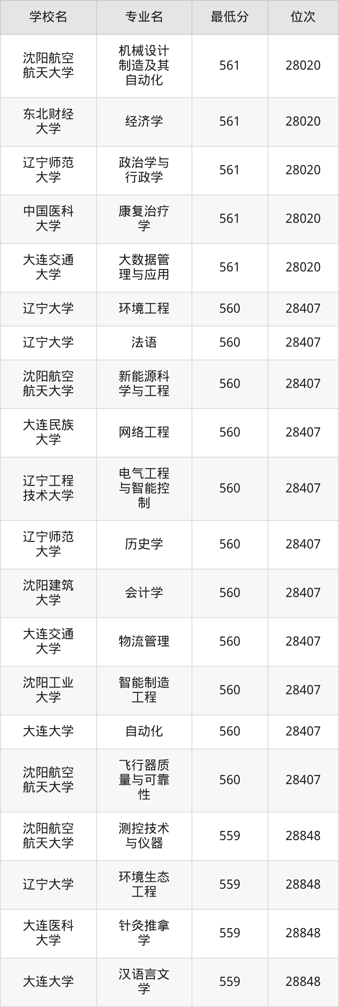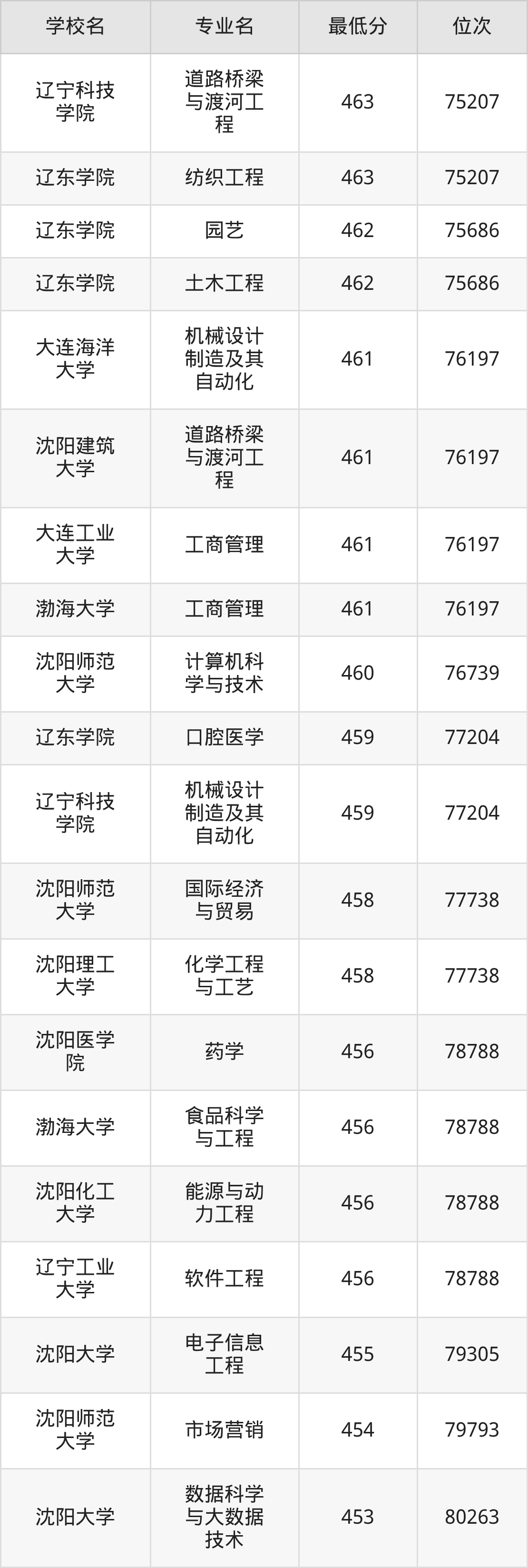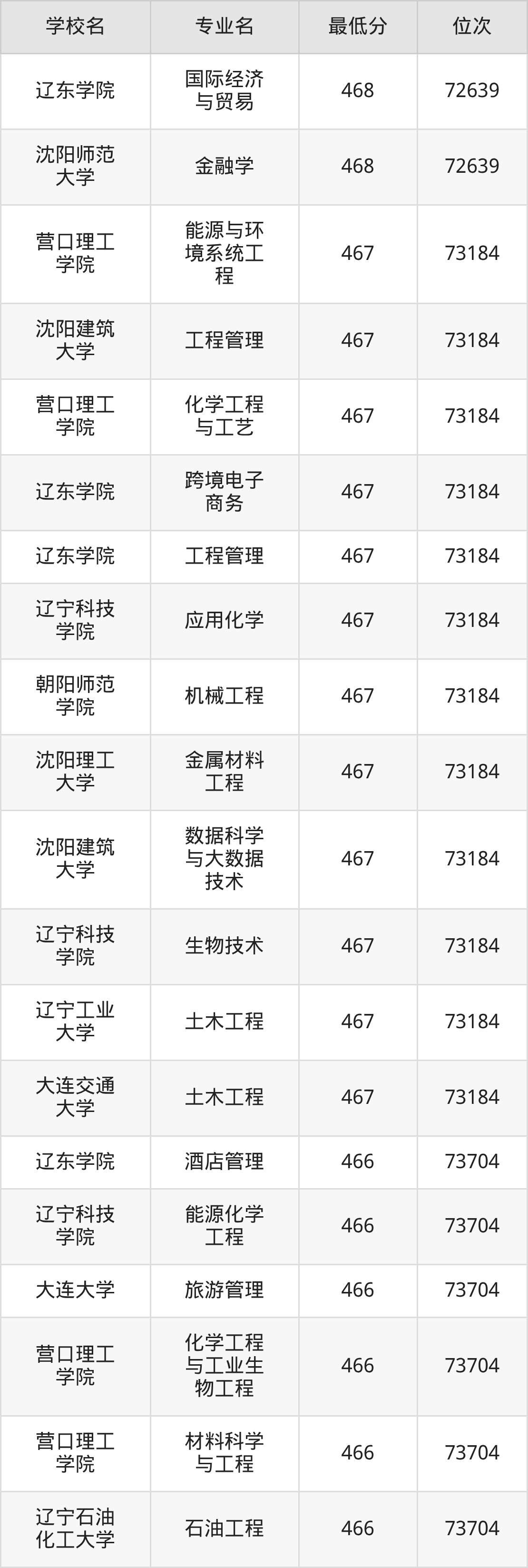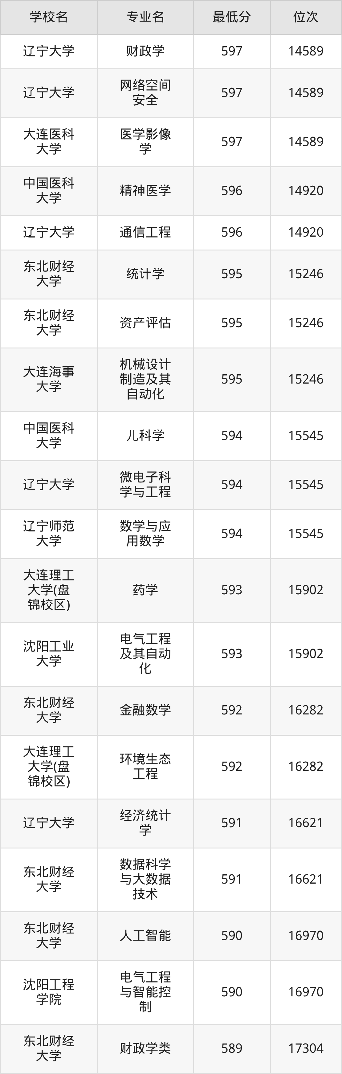 (3)辽宁中医药大学:2025年公办本科分数线437分到571分,位次区间是26916名到4523名,招生专业有11个,最低为护理学、最高为中医学。