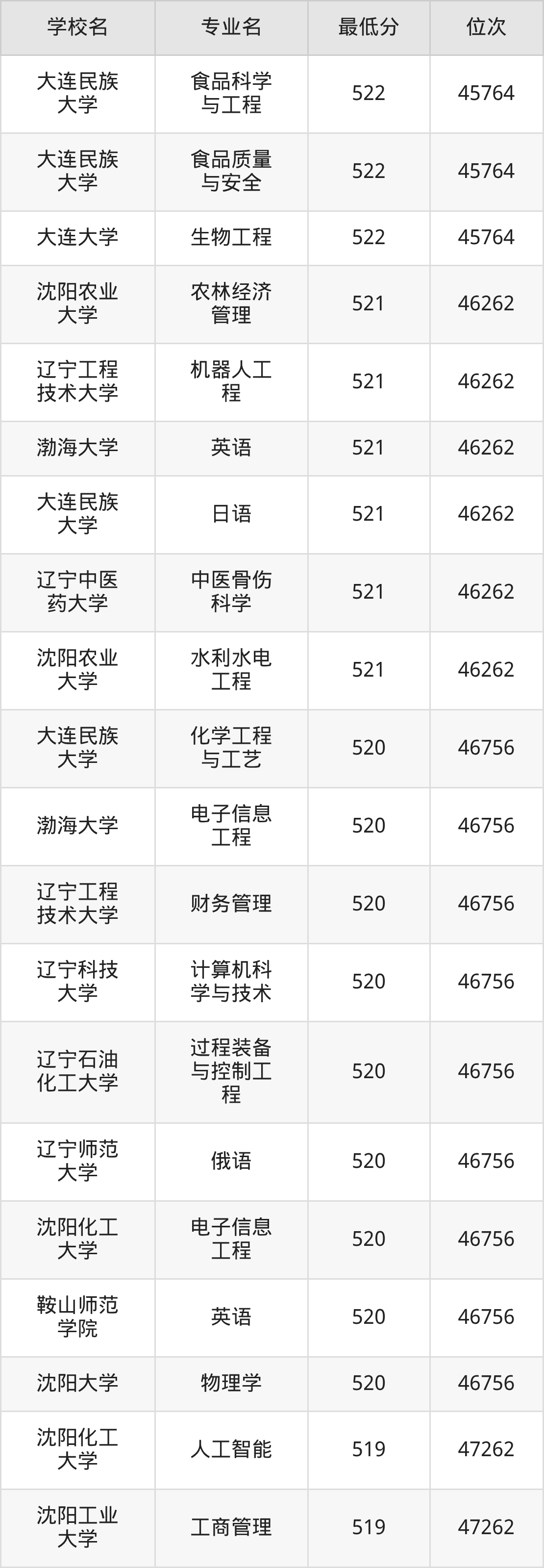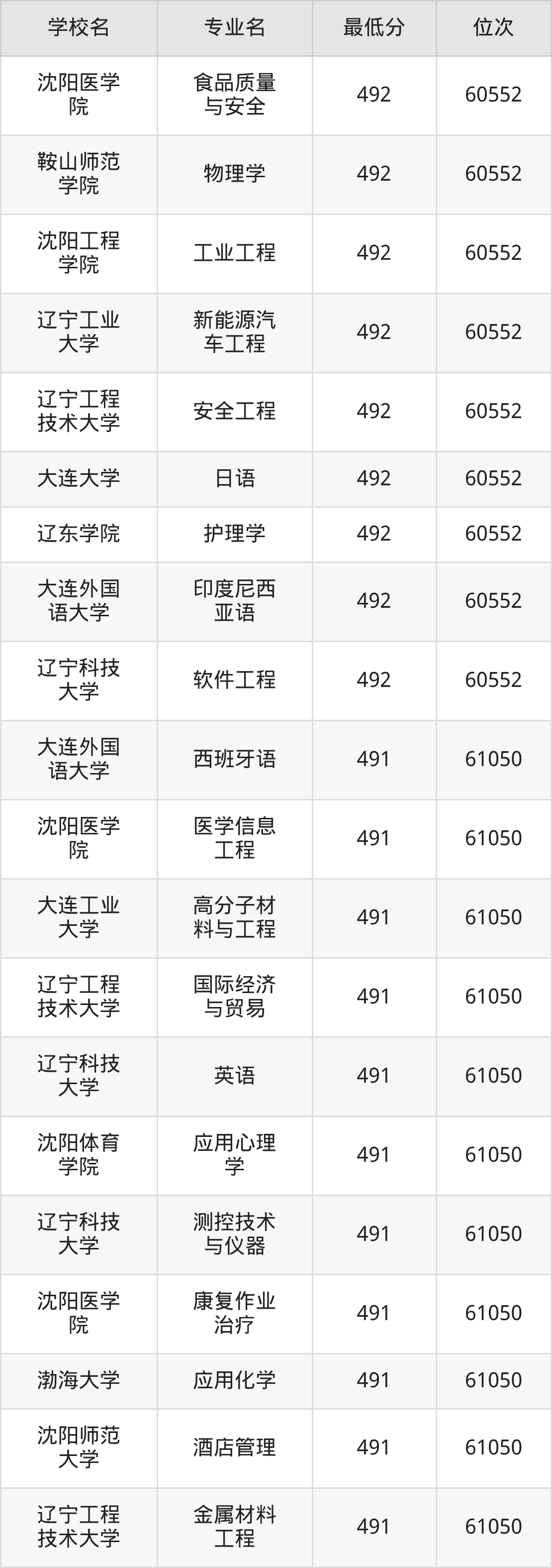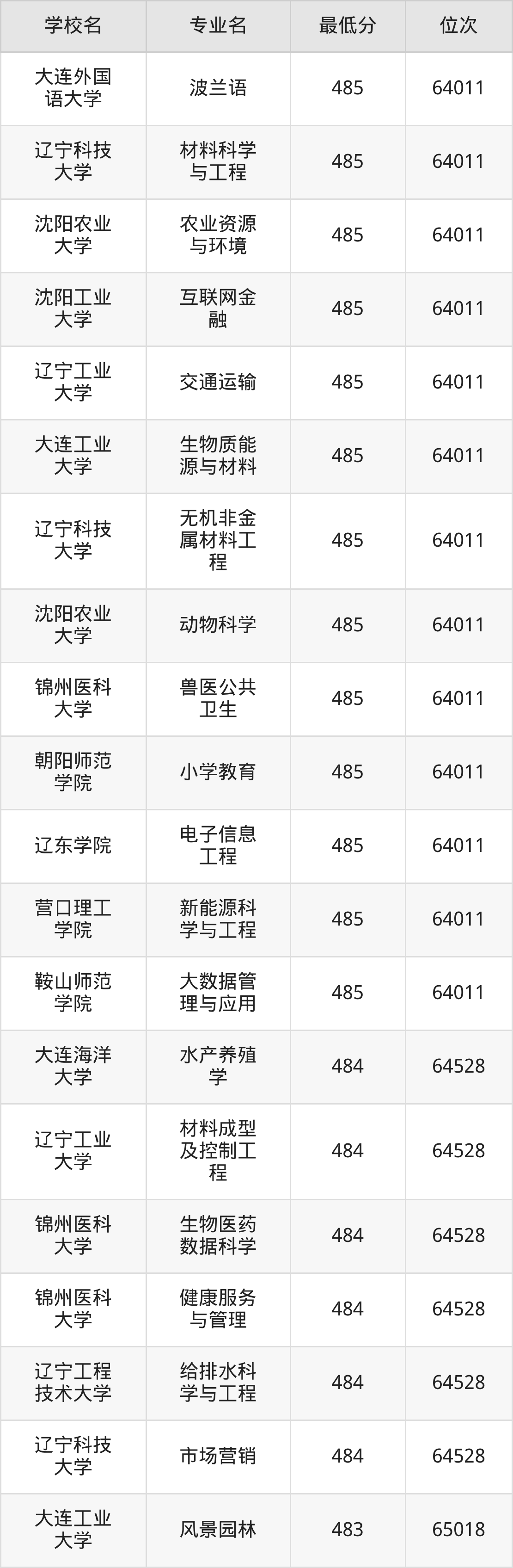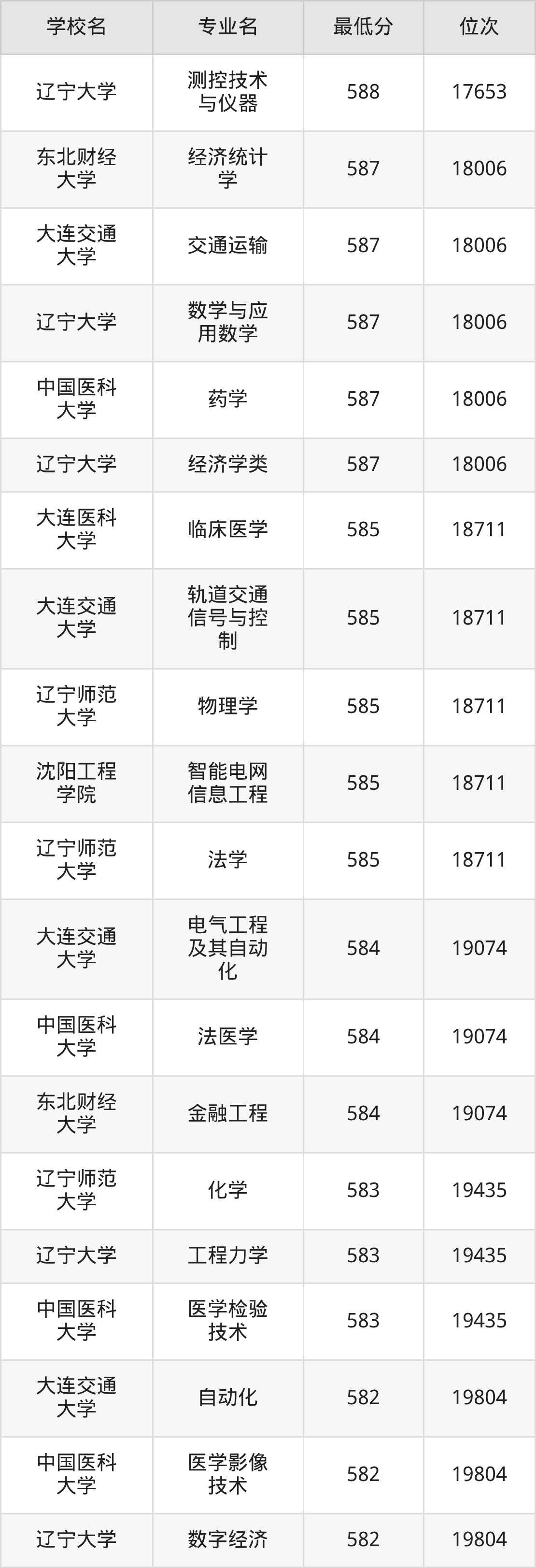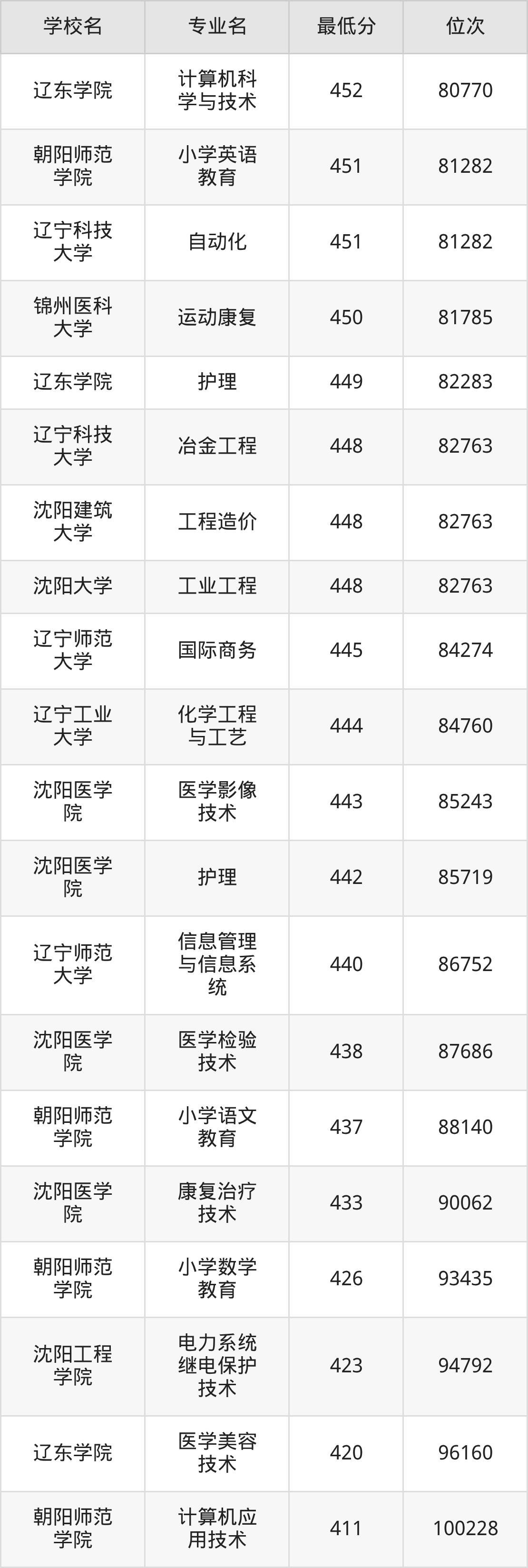 (3)辽宁中医药大学:2025年公办本科分数线437分到571分,位次区间是26916名到4523名,招生专业有11个,最低为护理学、最高为中医学。