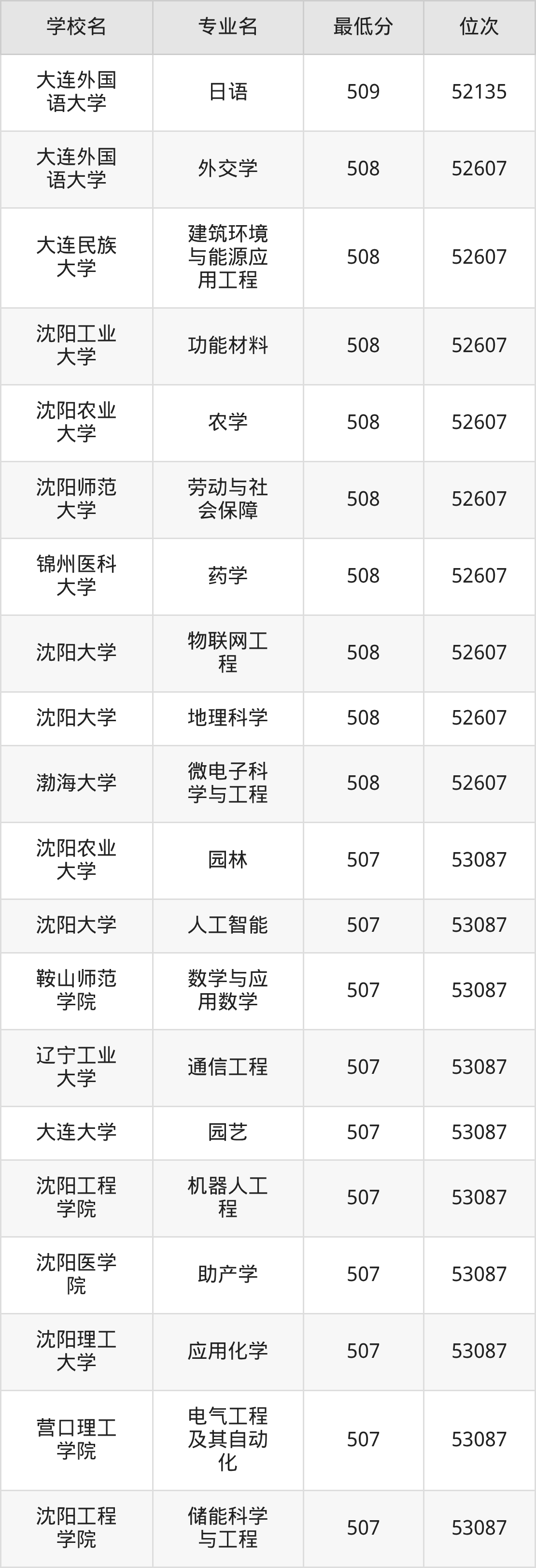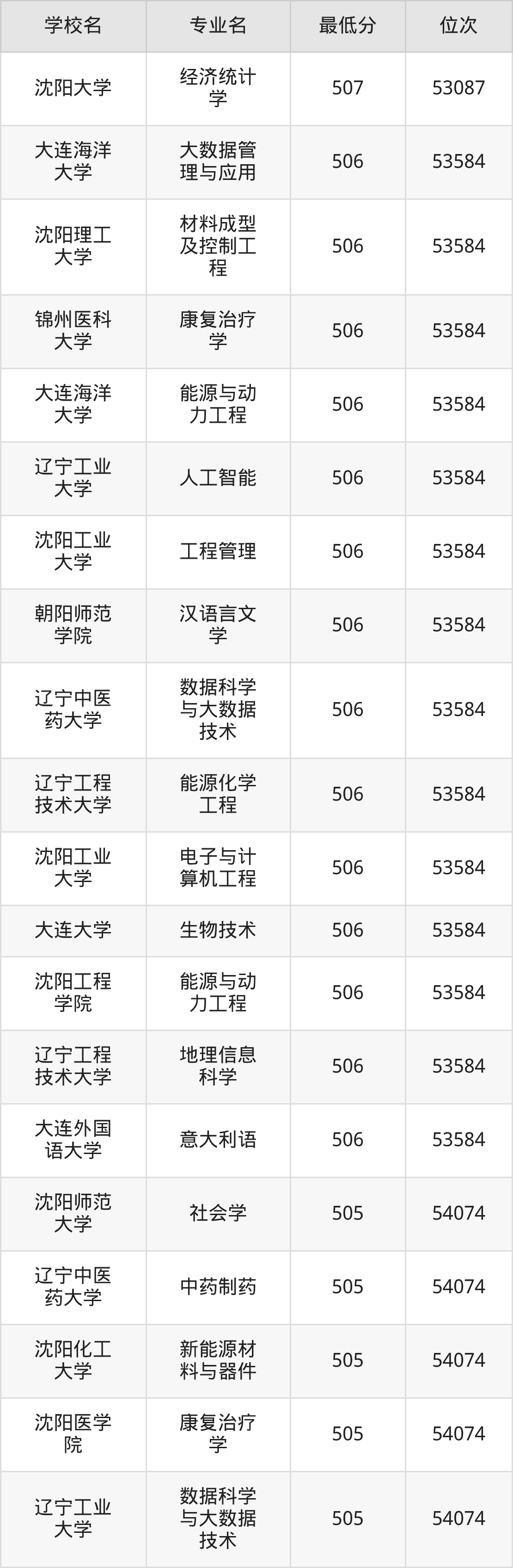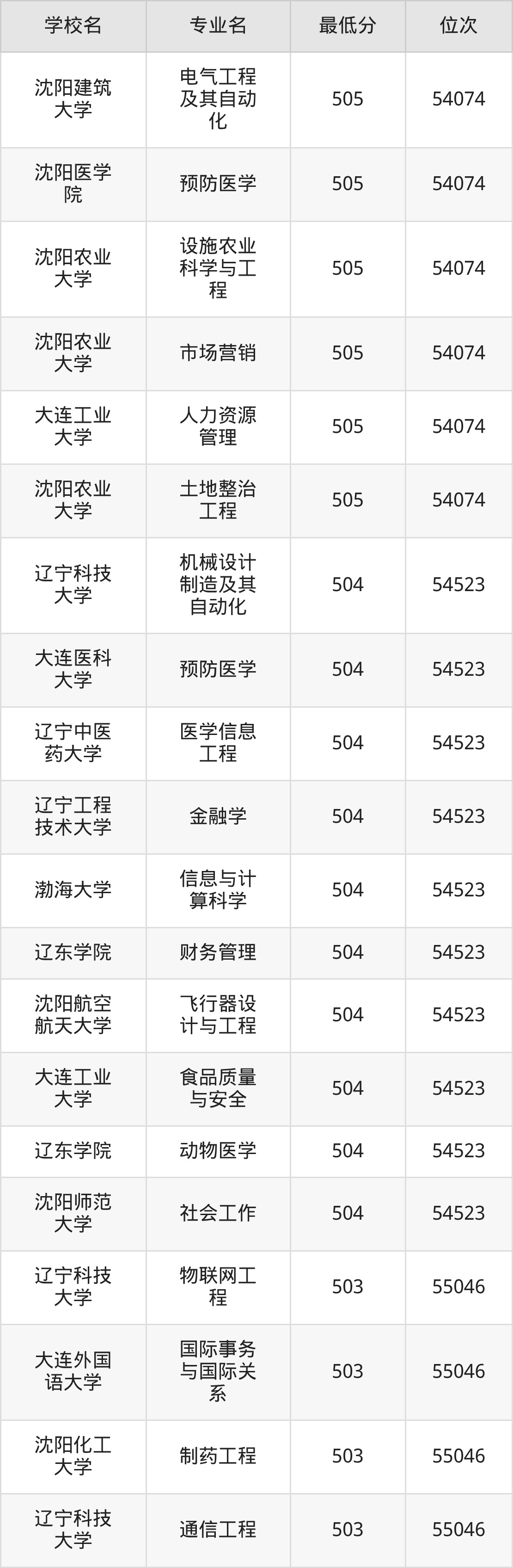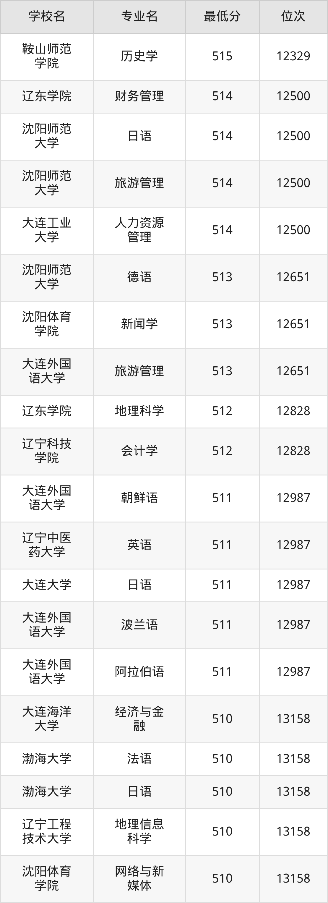 (3)辽宁中医药大学:2025年公办本科分数线437分到571分,位次区间是26916名到4523名,招生专业有11个,最低为护理学、最高为中医学。