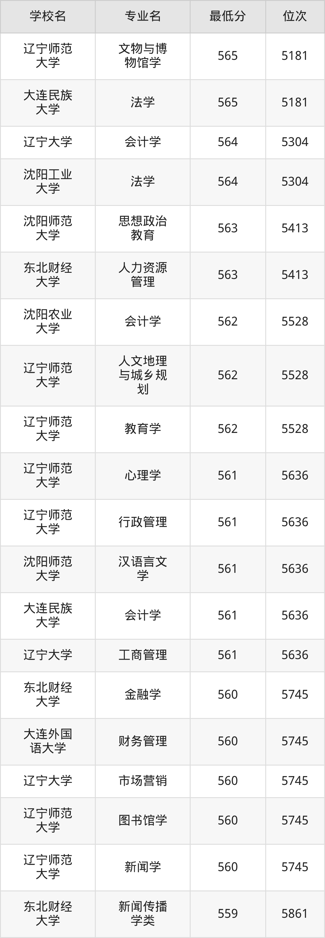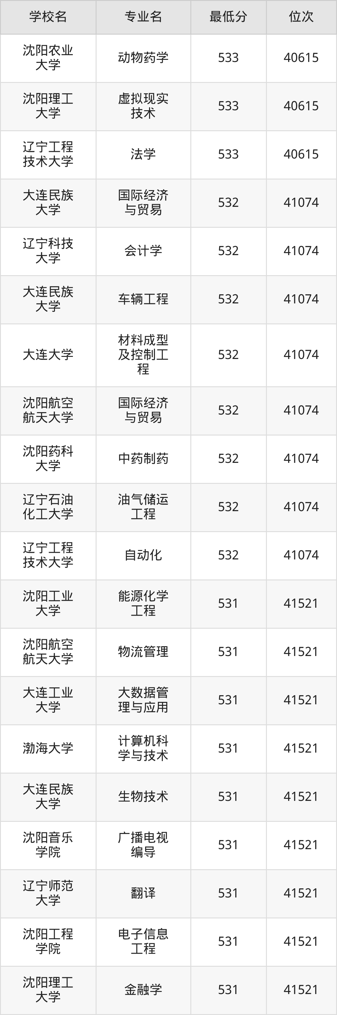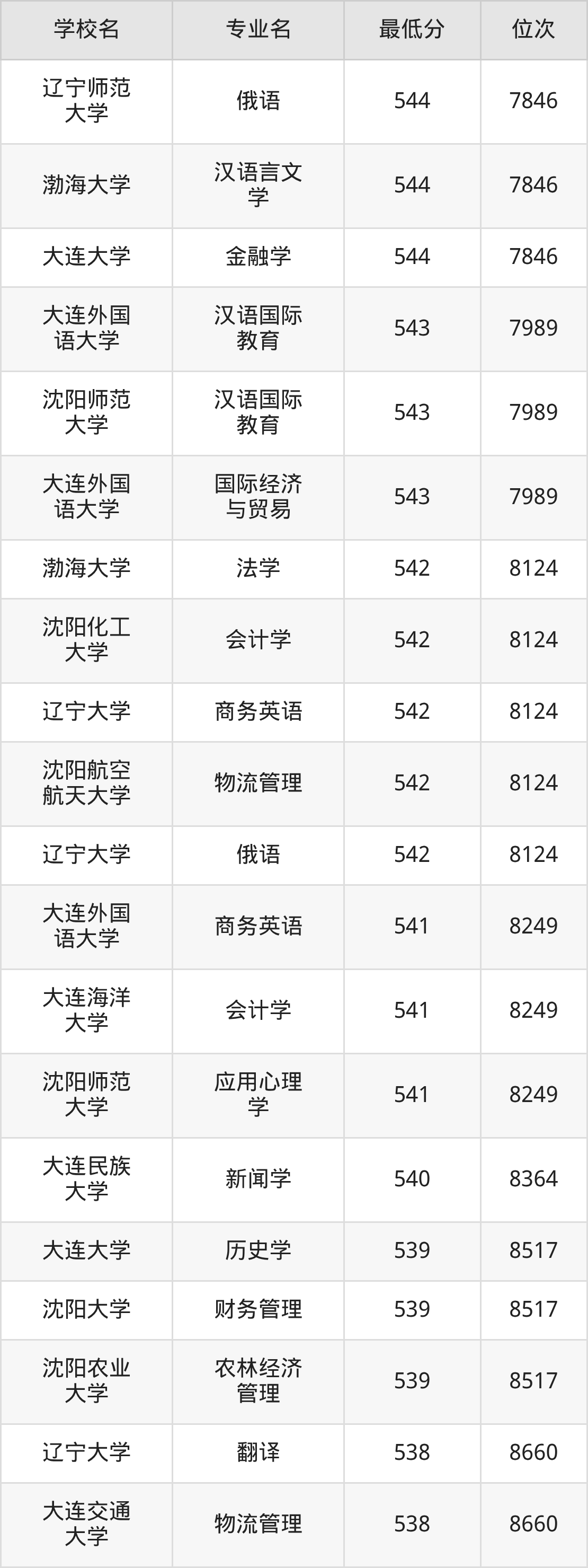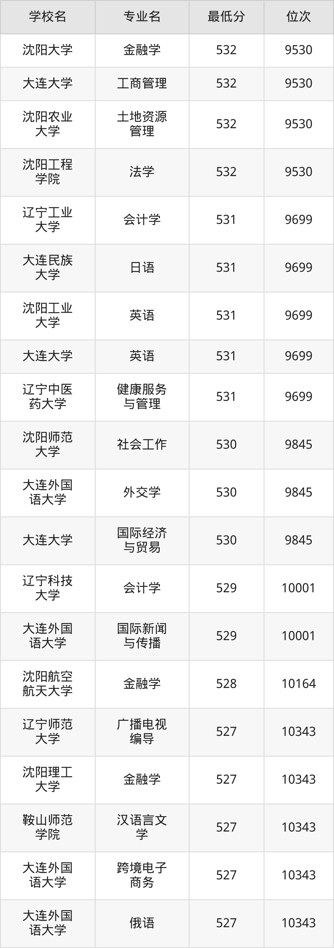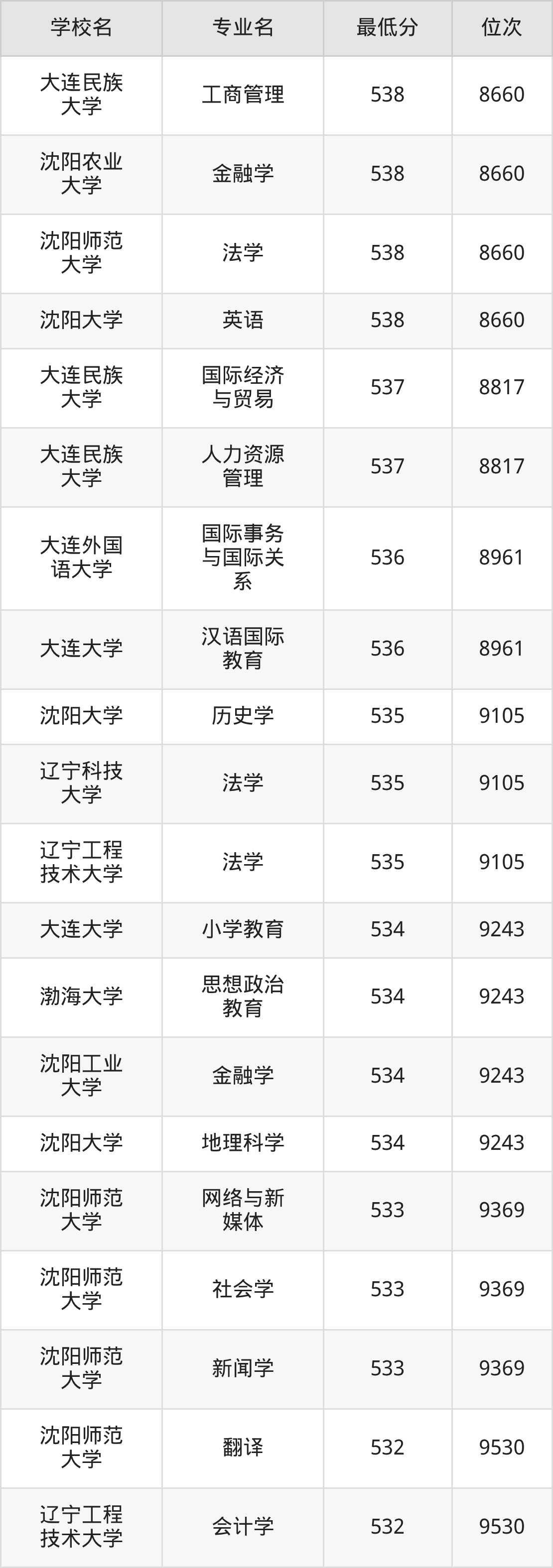 (6)沈阳大学:2025年公办本科分数线532分到555分,位次区间是9530名到6368名,招生专业有8个,最低为金融学、最高为法学。