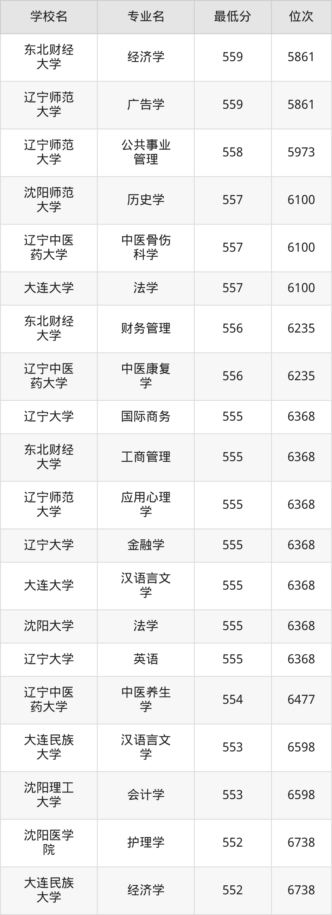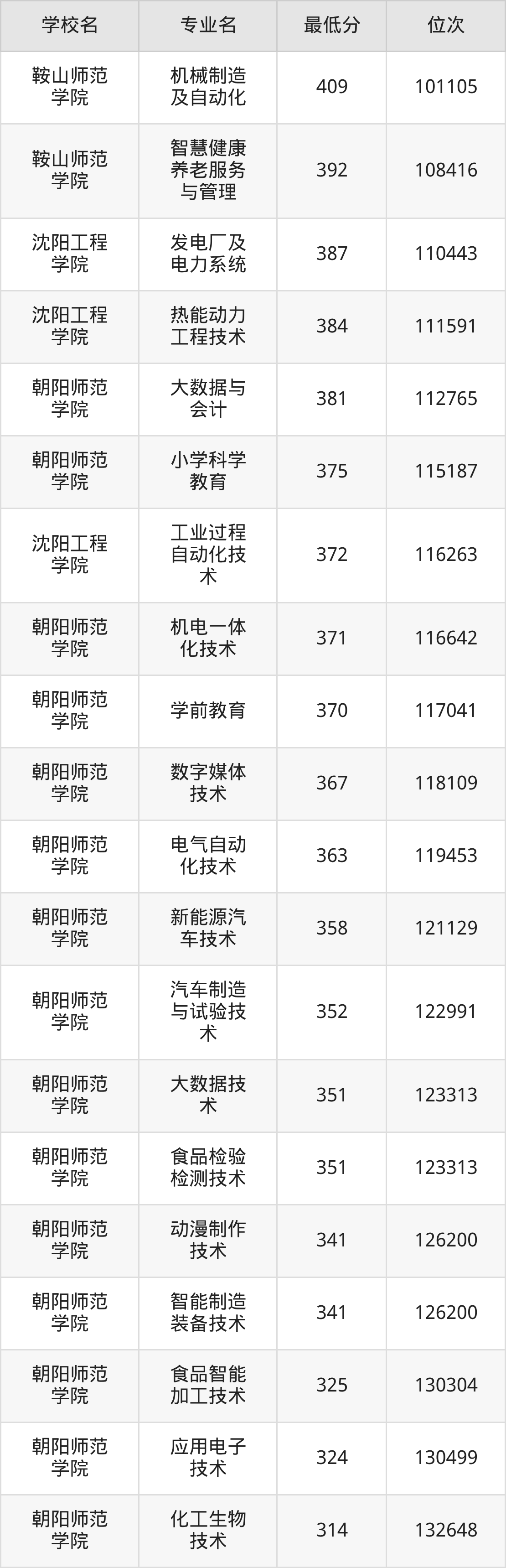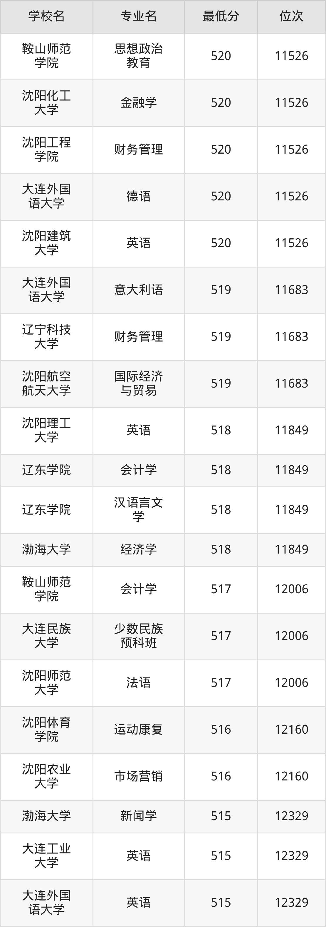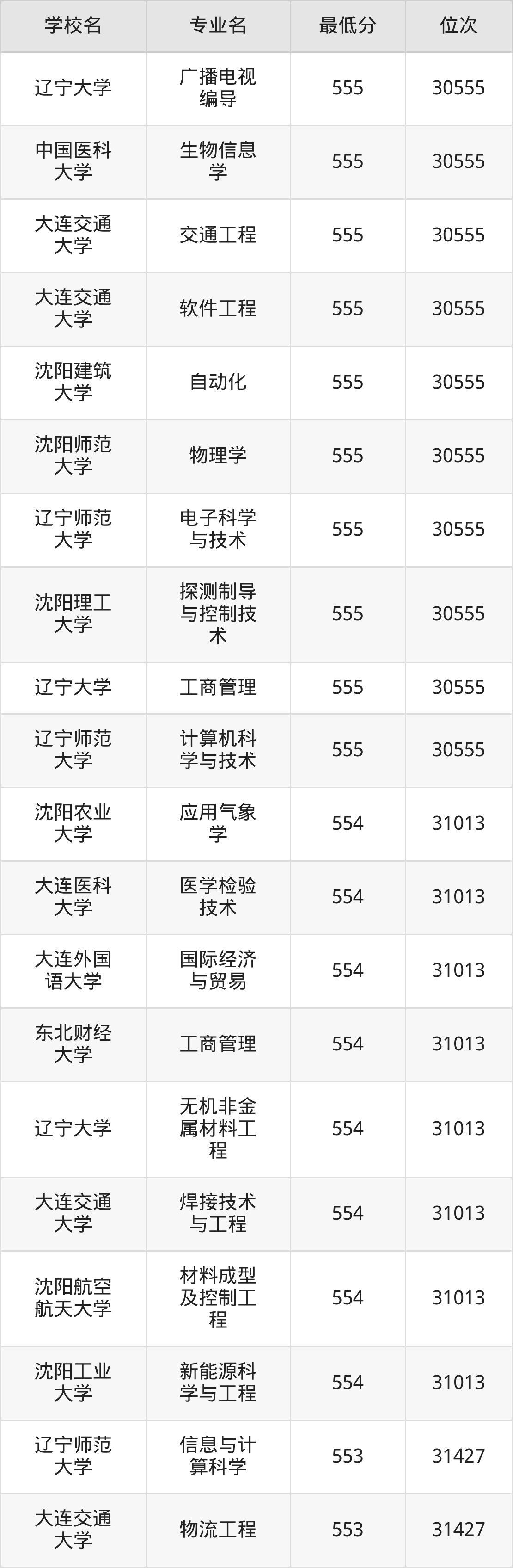 (6)沈阳大学:2025年公办本科分数线532分到555分,位次区间是9530名到6368名,招生专业有8个,最低为金融学、最高为法学。