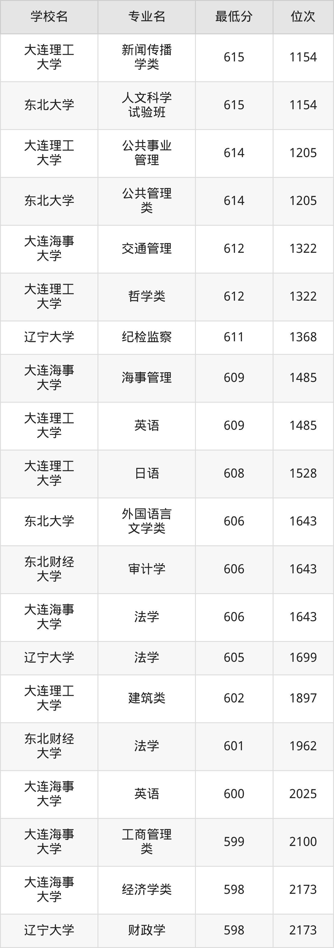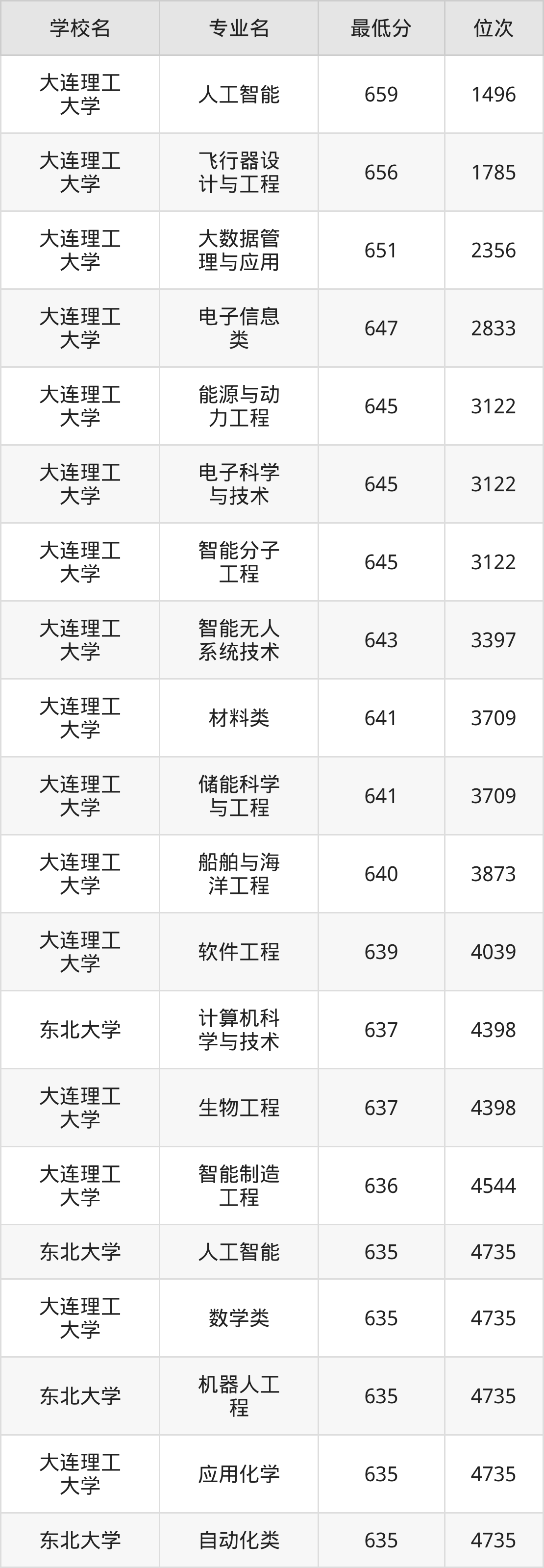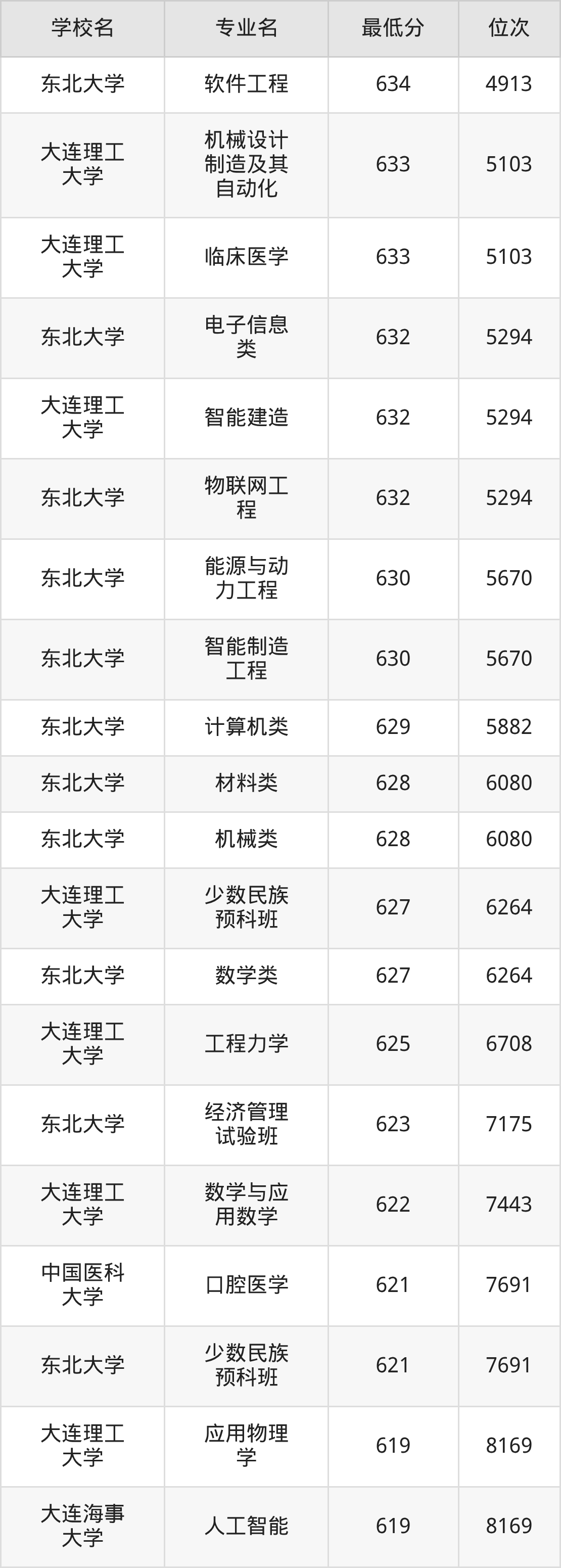 (1)东北大学:2025年公办本科分数线621分到637分,位次区间是7691名到4398名,招生专业有15个,最低为少数民族预科班、最高为计算机科学与技术。