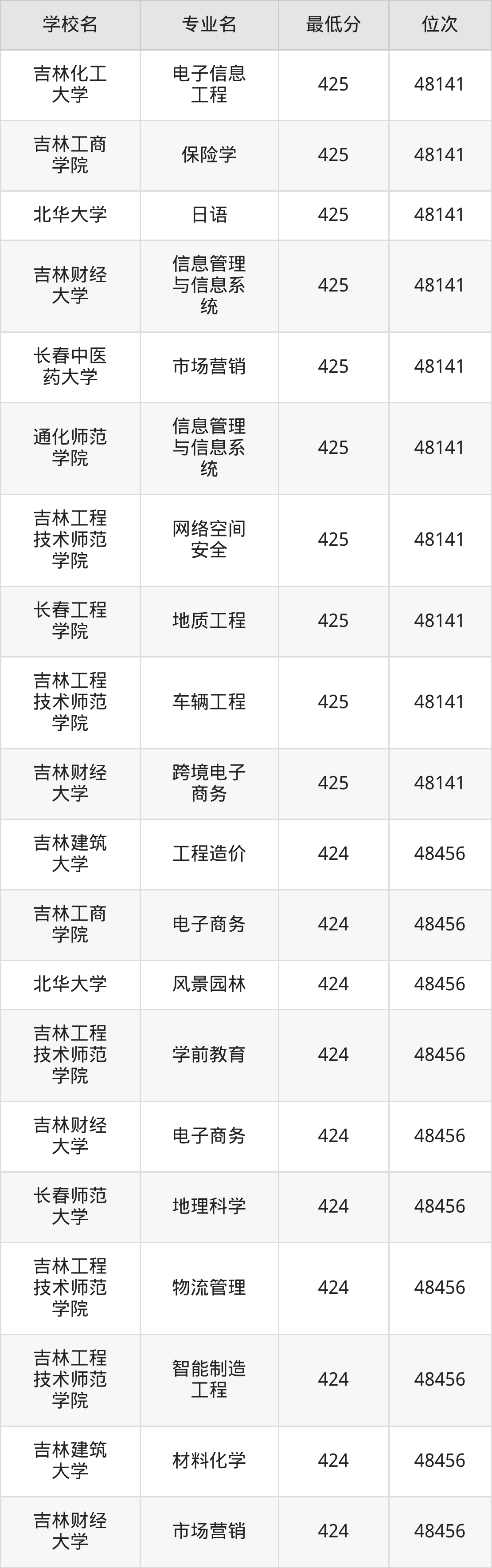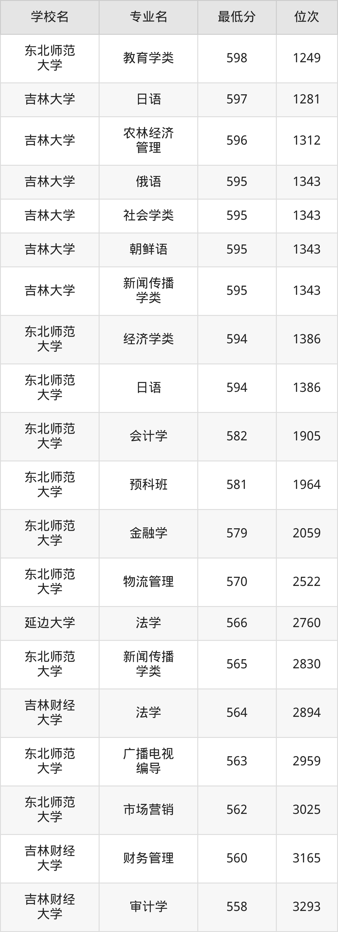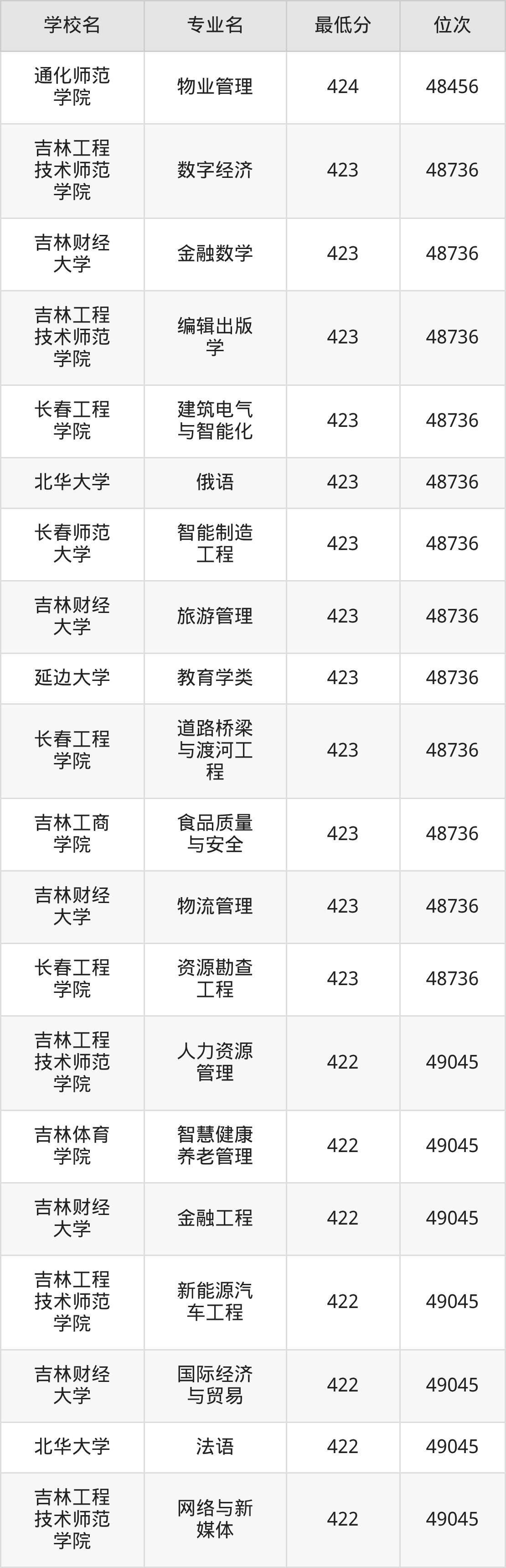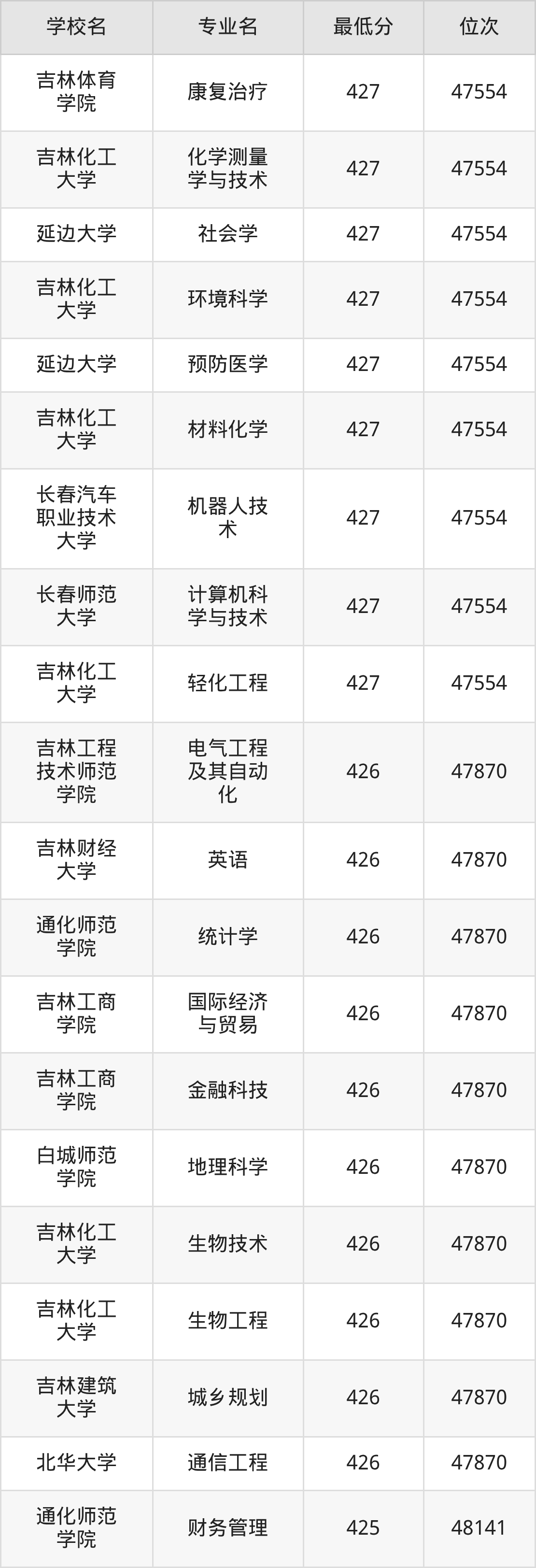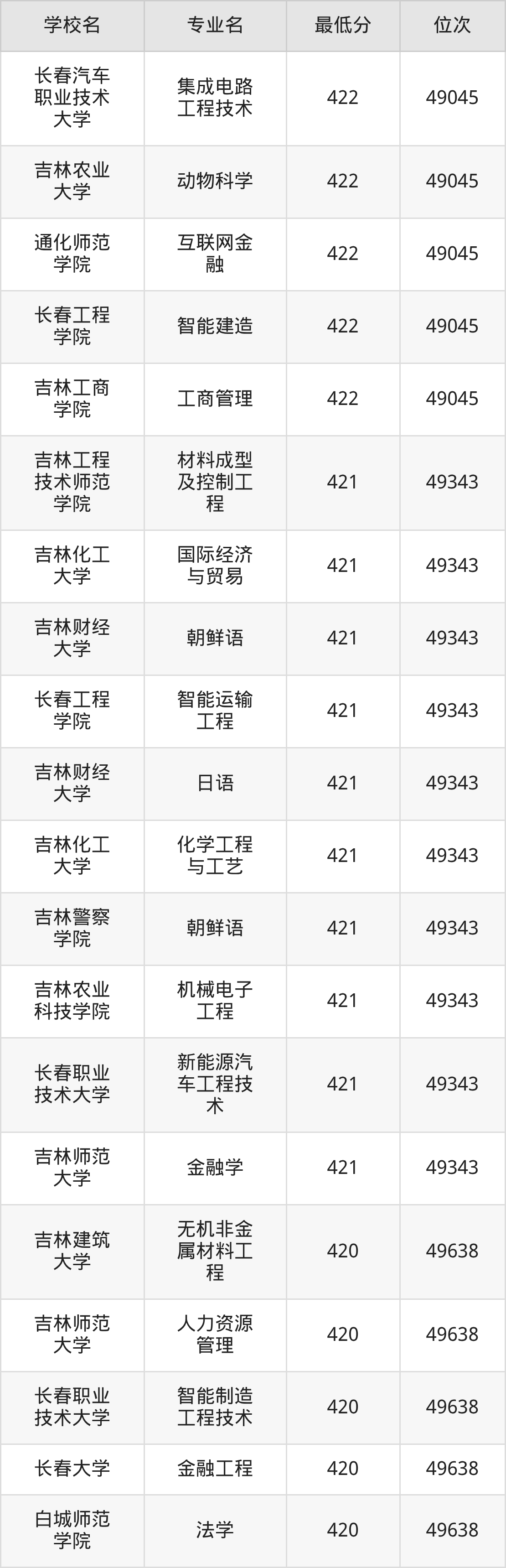 (4)吉林财经大学:2025年公办本科分数线421分到540分,位次区间是49343名到16442名,招生专业有39个,最低为朝鲜语、日语、最高为法学。