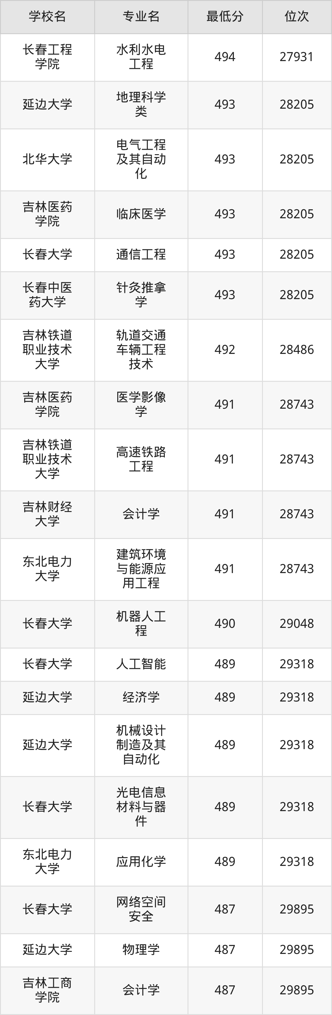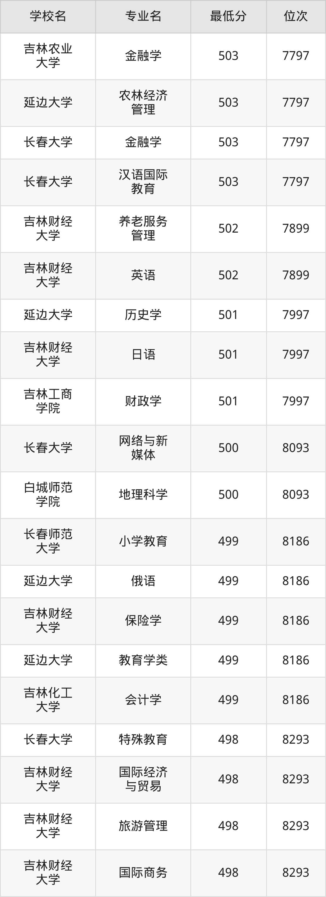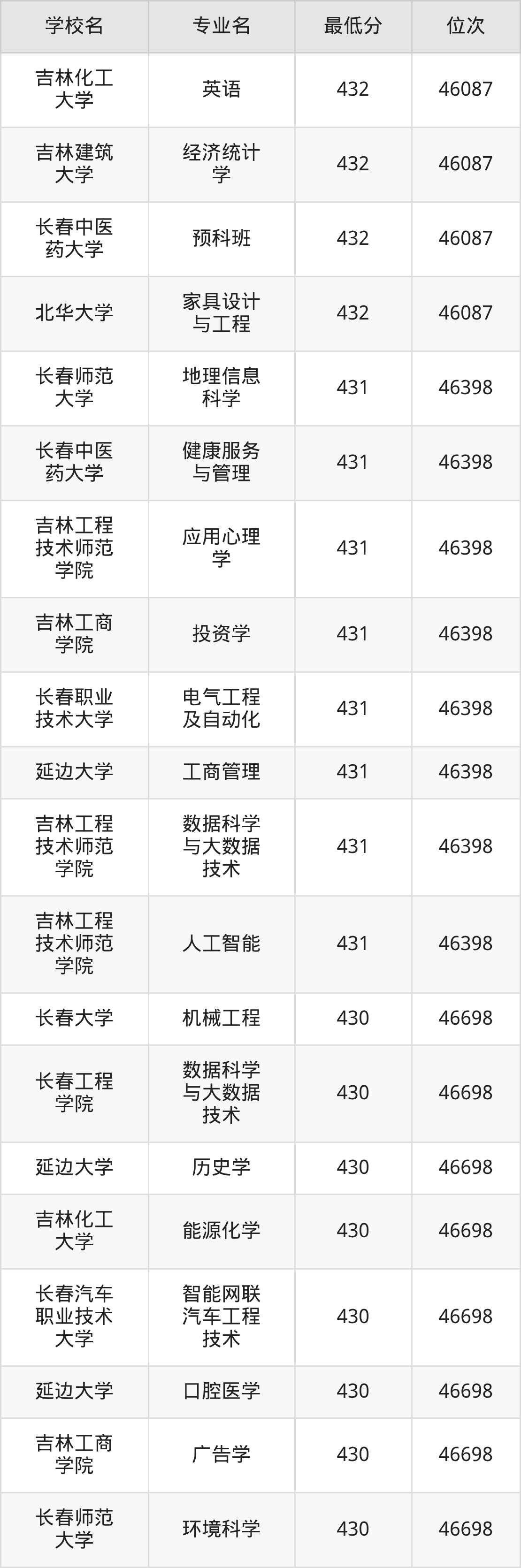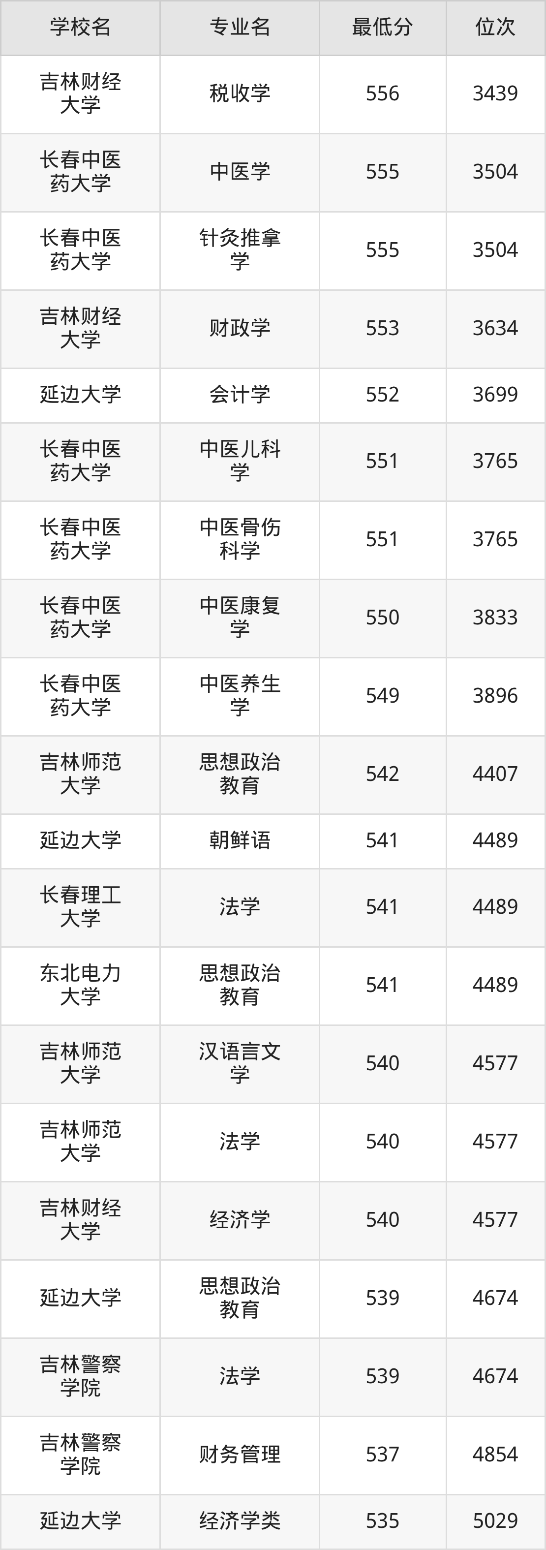 (4)吉林财经大学:2025年公办本科分数线421分到540分,位次区间是49343名到16442名,招生专业有39个,最低为朝鲜语、日语、最高为法学。