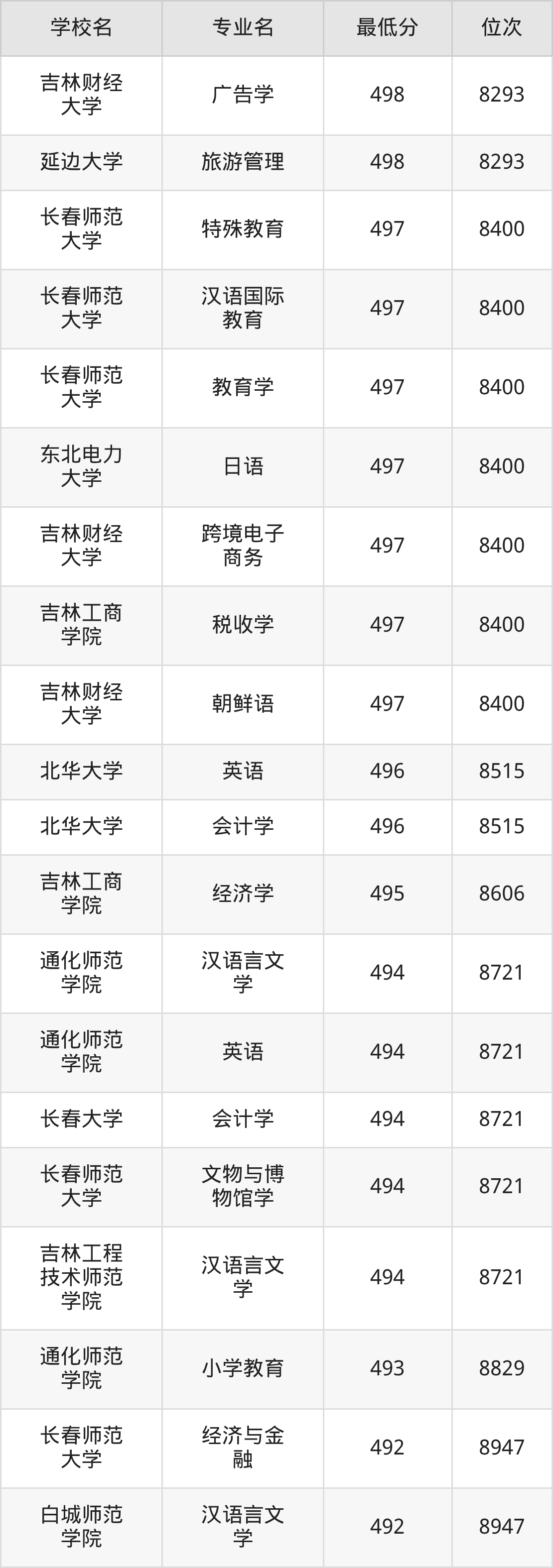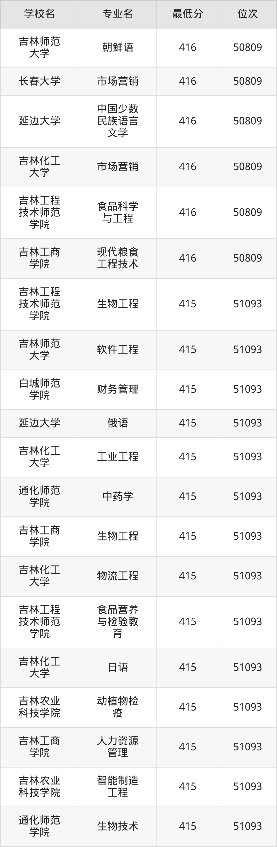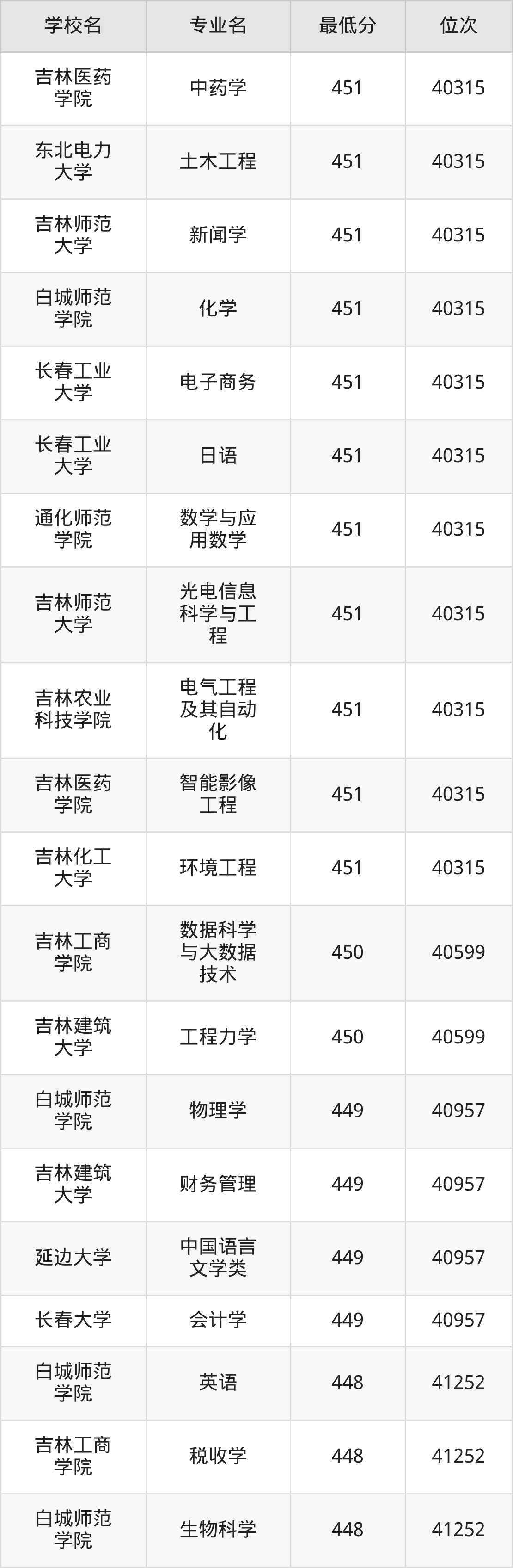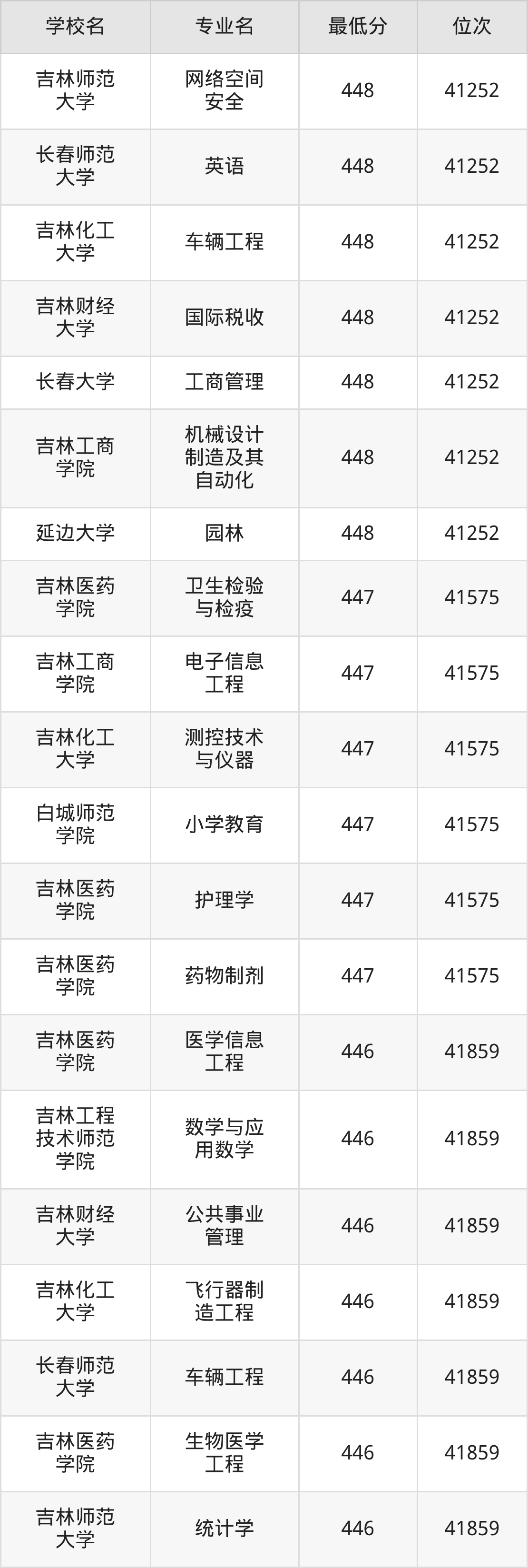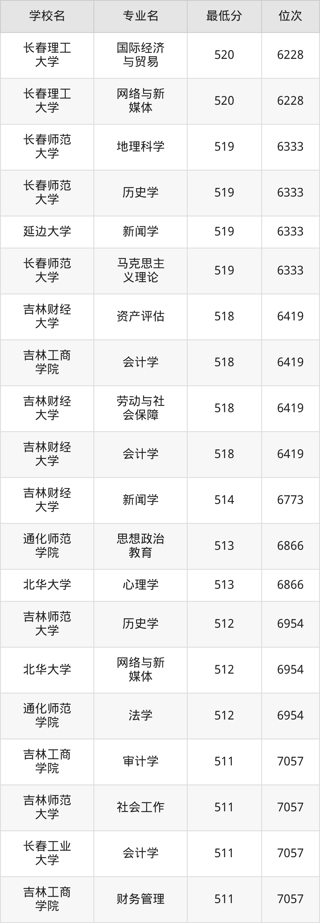 (4)吉林财经大学:2025年公办本科分数线421分到540分,位次区间是49343名到16442名,招生专业有39个,最低为朝鲜语、日语、最高为法学。