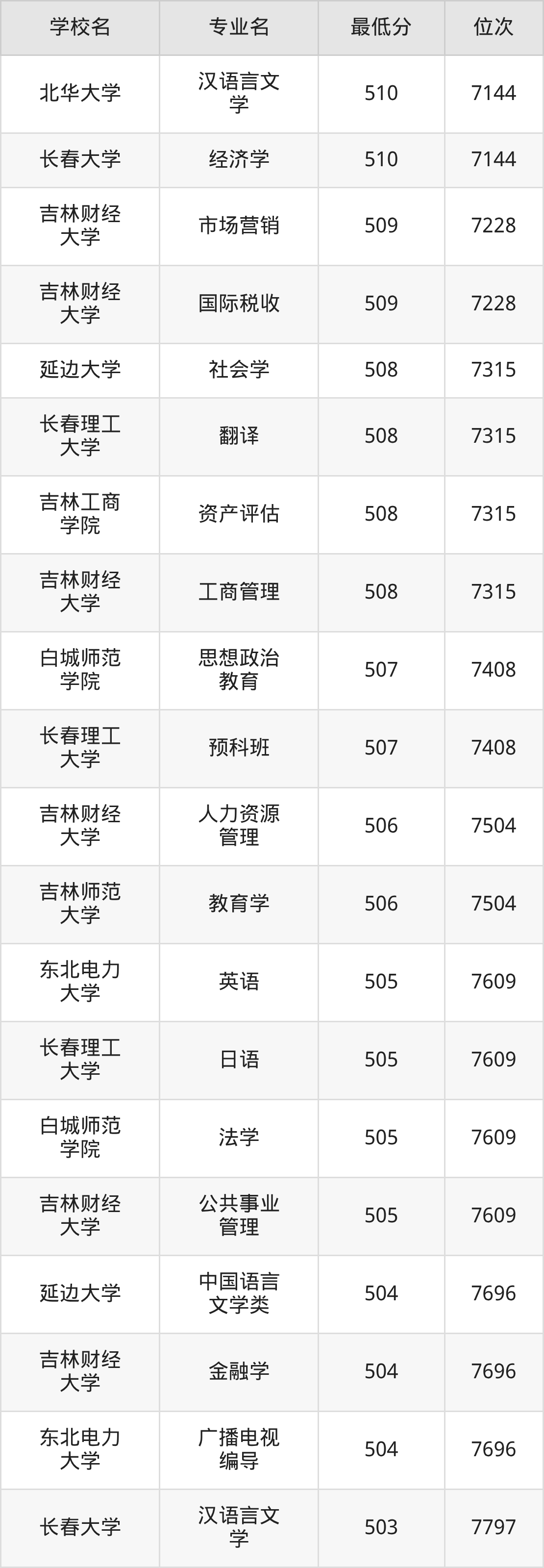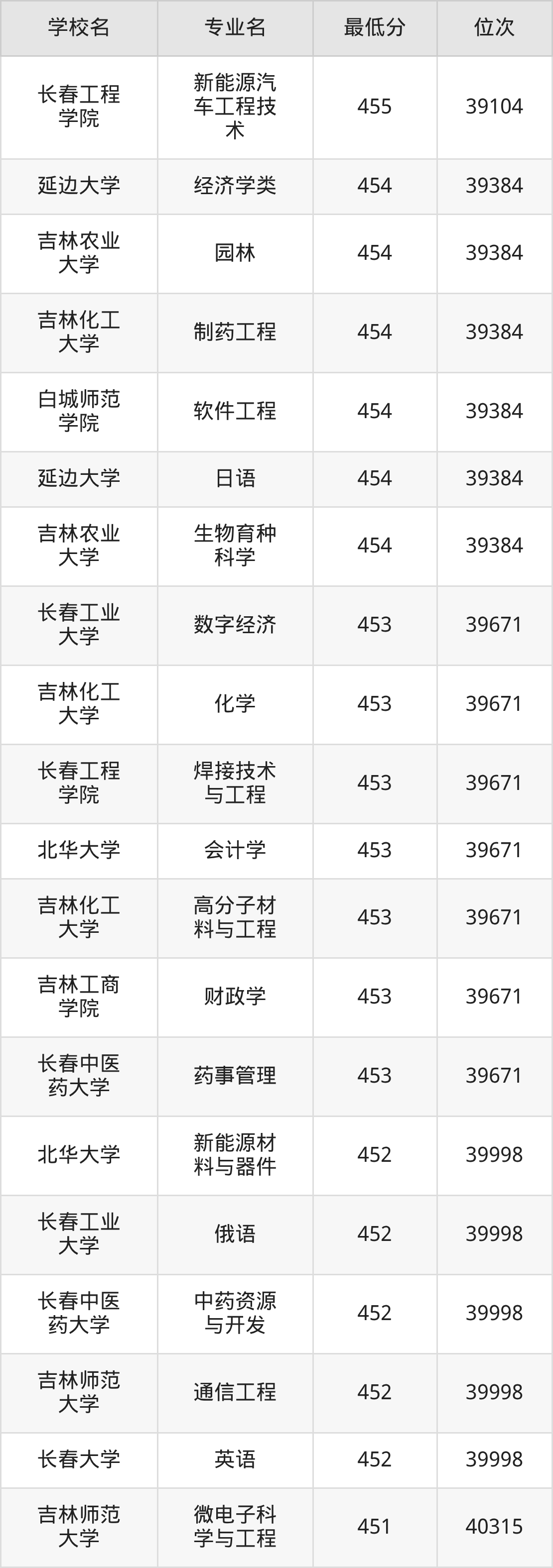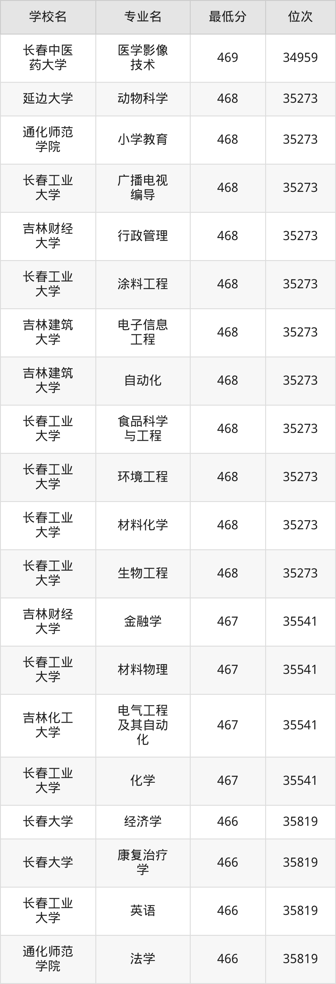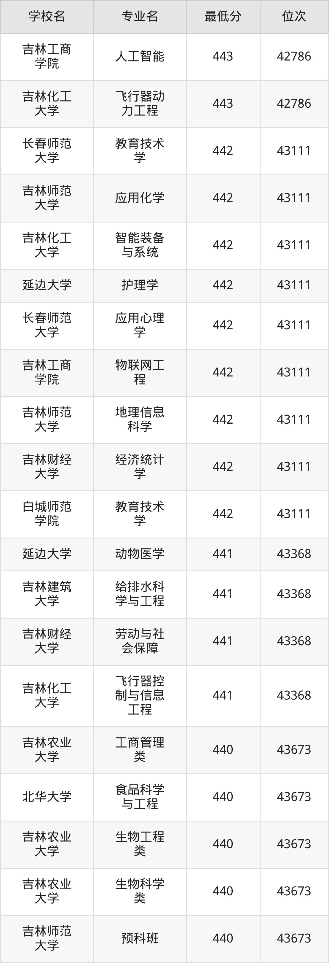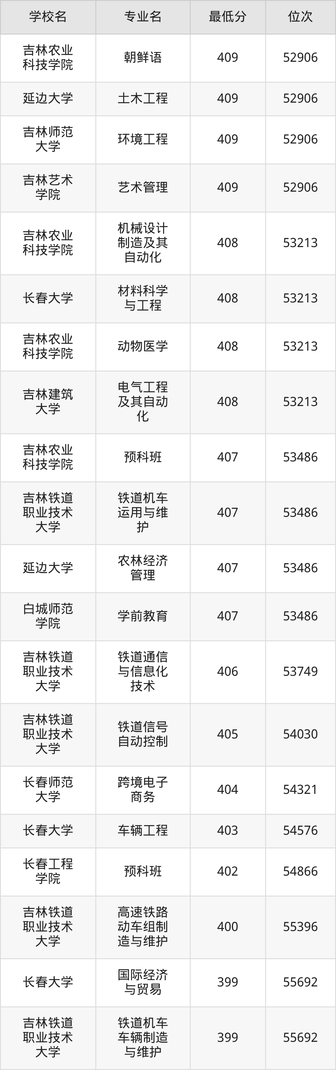 (4)吉林财经大学:2025年公办本科分数线421分到540分,位次区间是49343名到16442名,招生专业有39个,最低为朝鲜语、日语、最高为法学。