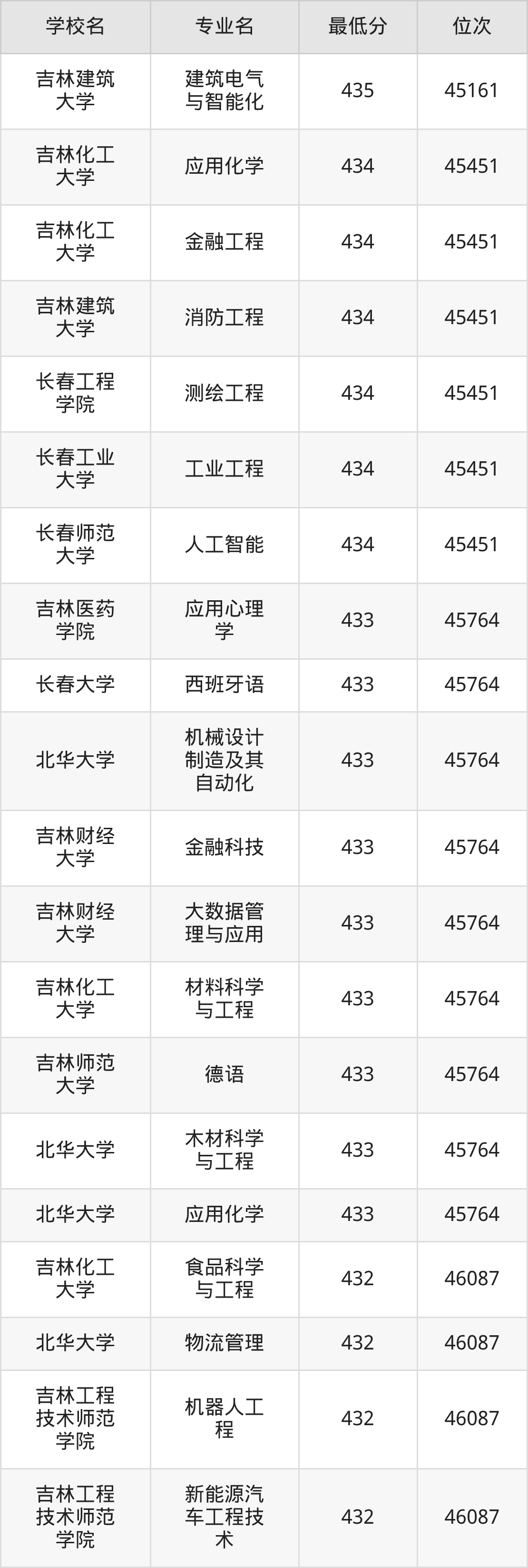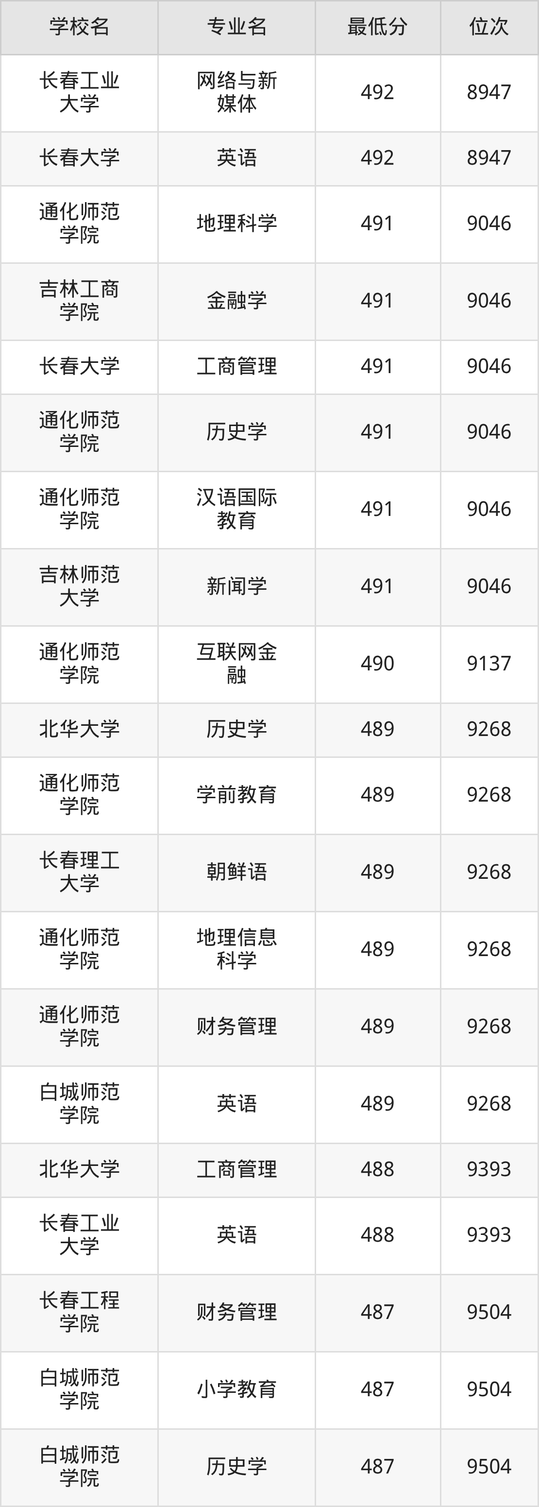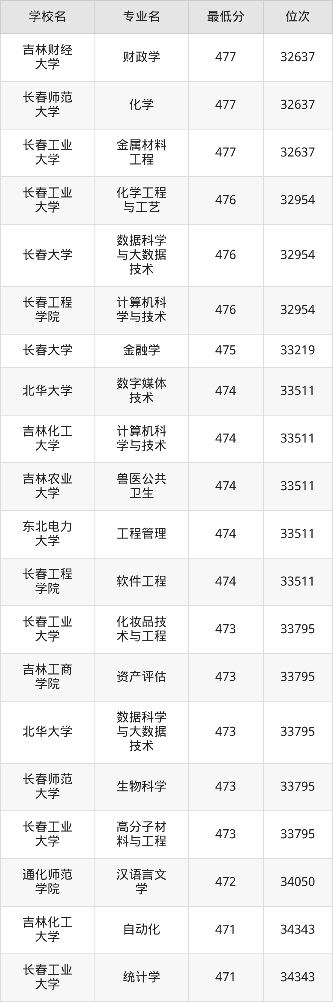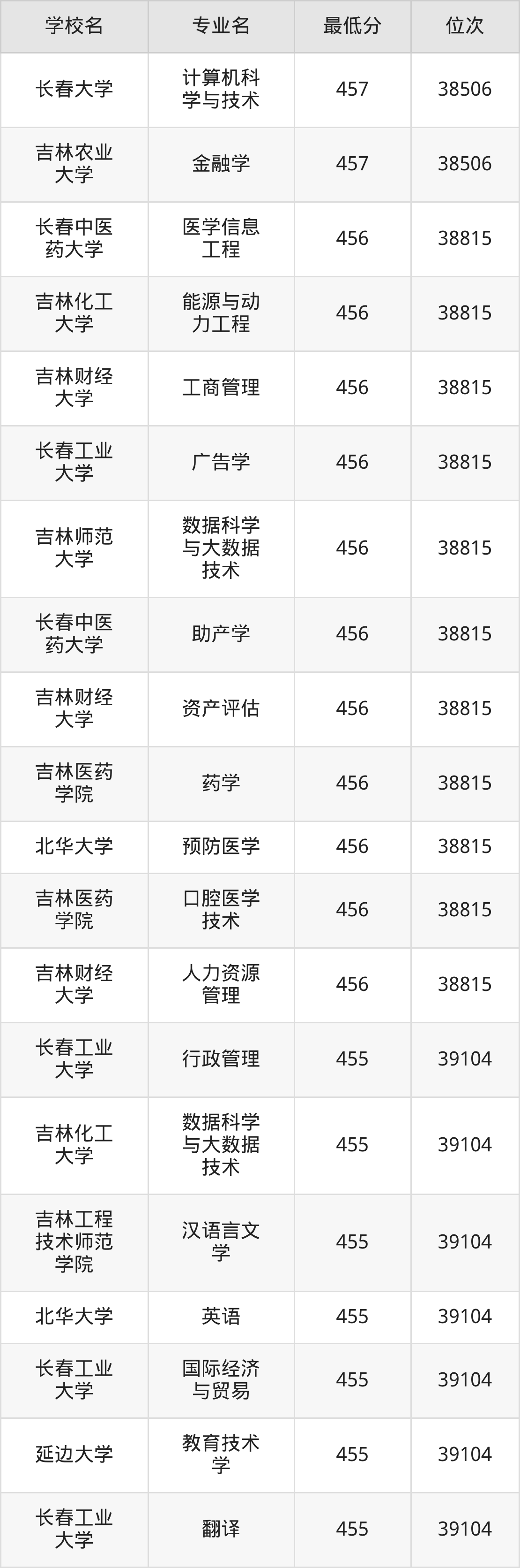 (4)吉林财经大学:2025年公办本科分数线421分到540分,位次区间是49343名到16442名,招生专业有39个,最低为朝鲜语、日语、最高为法学。