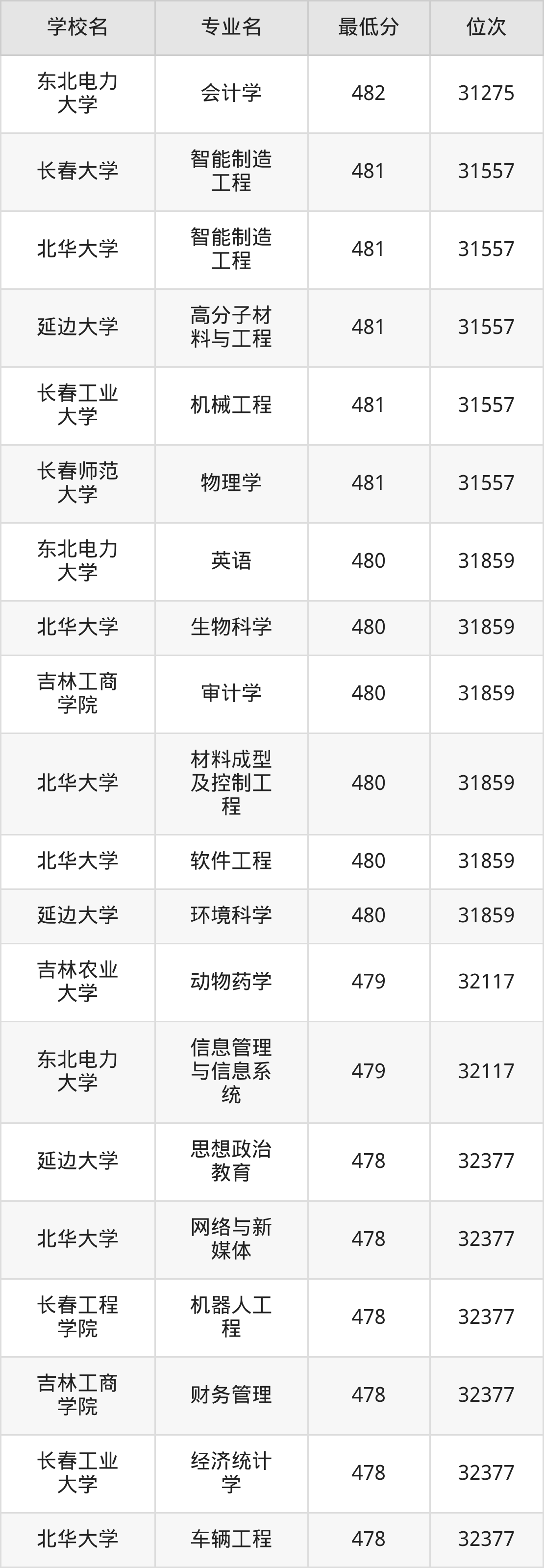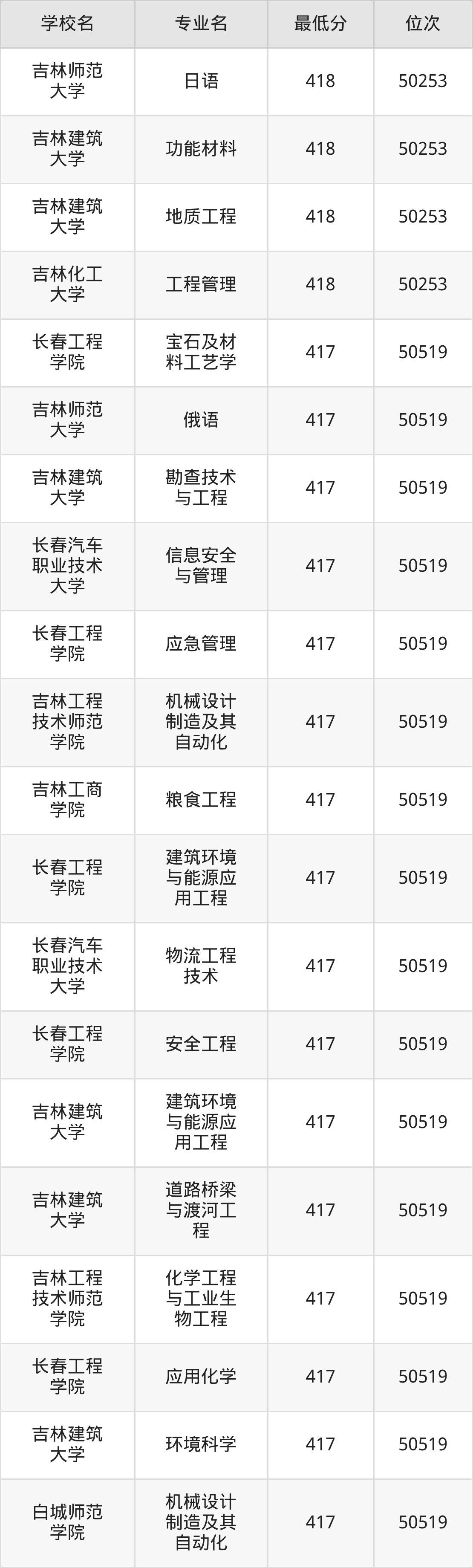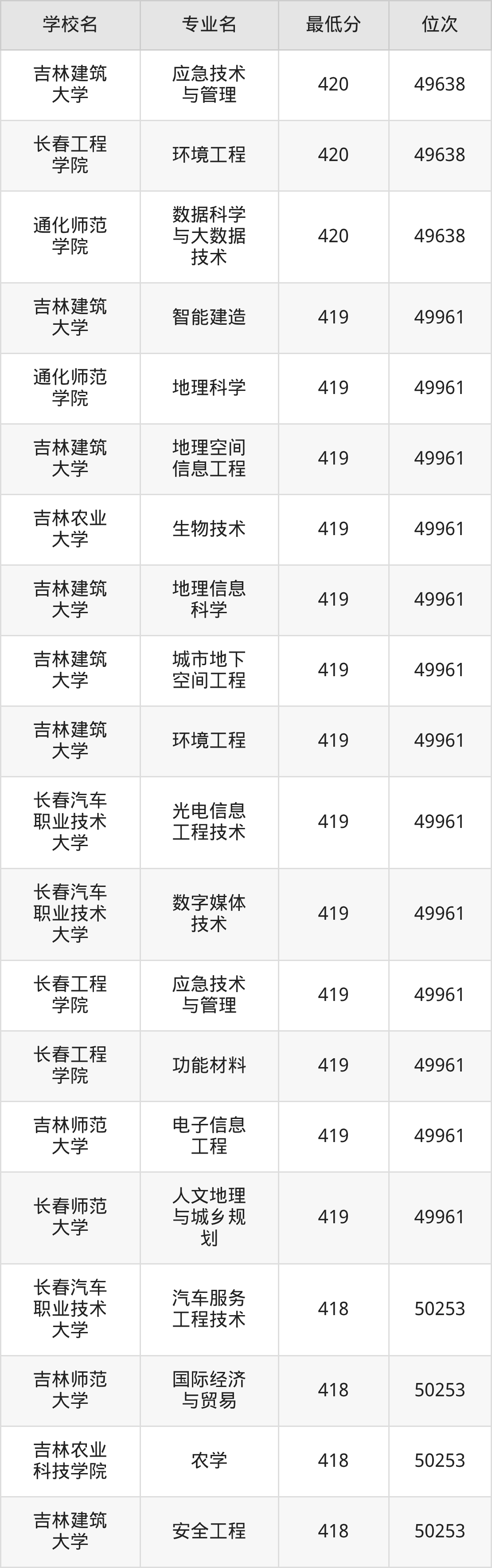 (5)吉林建筑大学:2025年公办本科分数线416分到477分,位次区间是18019名到10624名,招生专业有6个,最低为风景园林、最高为财务管理。