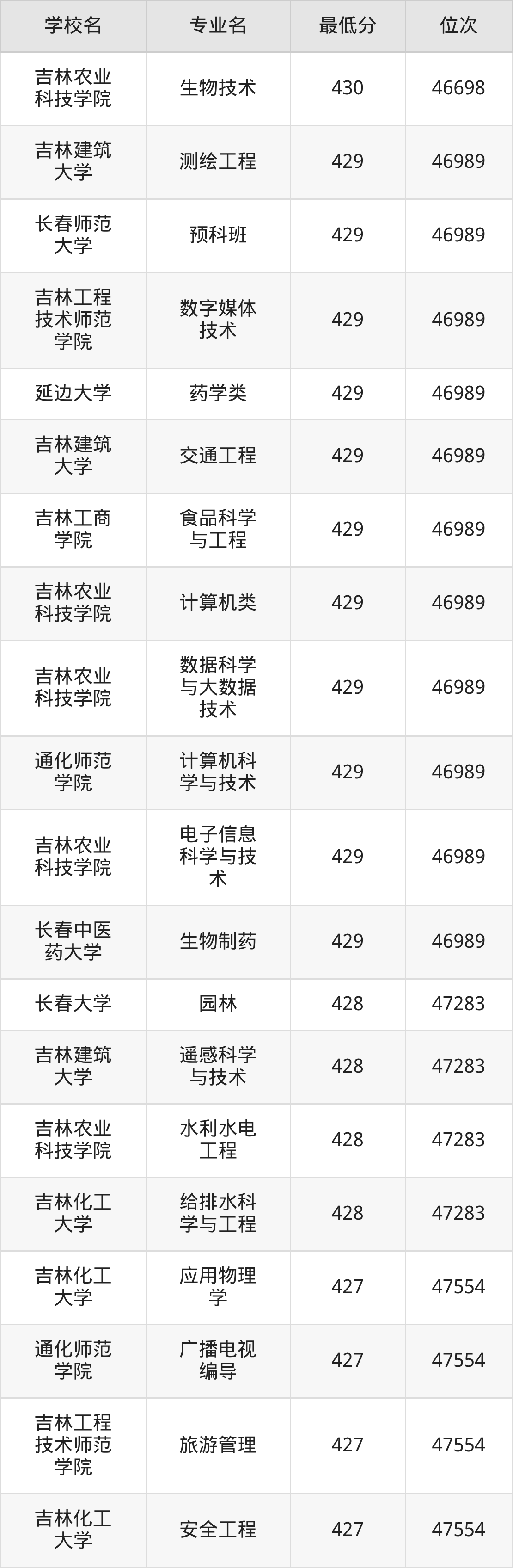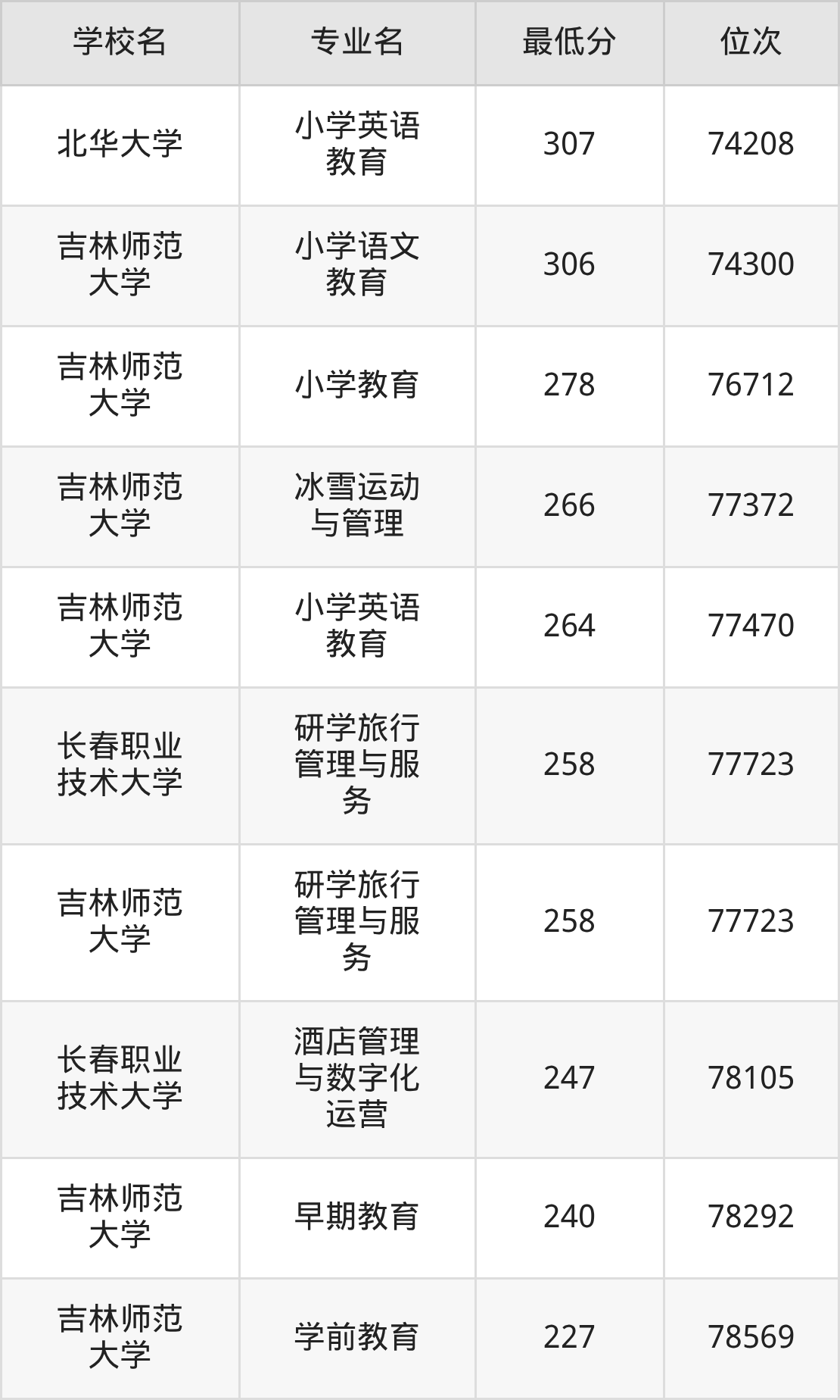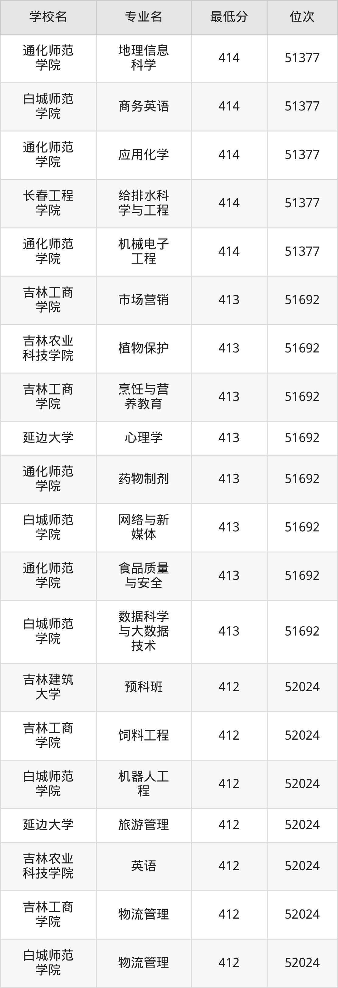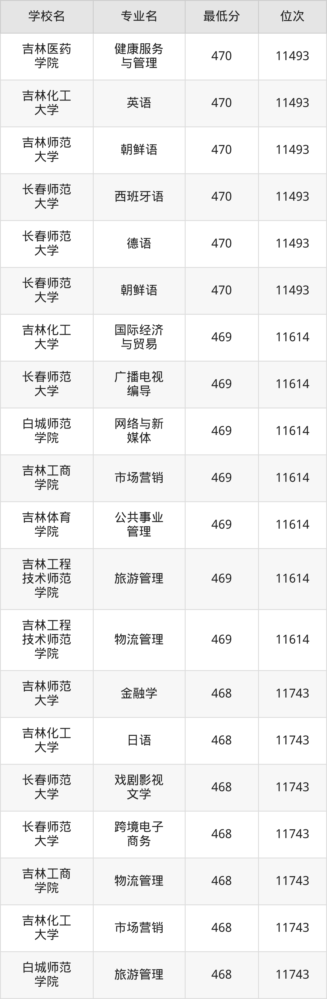 (4)吉林工程技术师范学院:2025年公办本科分数线469分到494分,位次区间是11614名到8721名,招生专业有11个,最低为旅游管理、物流管理、最高为汉语言文学。