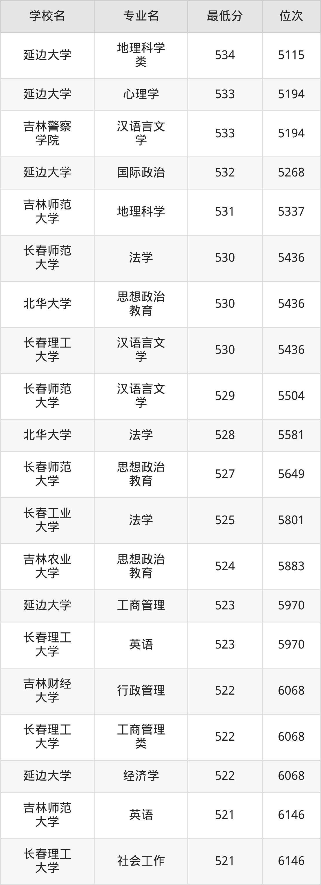 (6)吉林警察学院:2025年公办本科分数线421分到526分,位次区间是49343名到19729名,招生专业有4个,最低为朝鲜语、最高为法学。