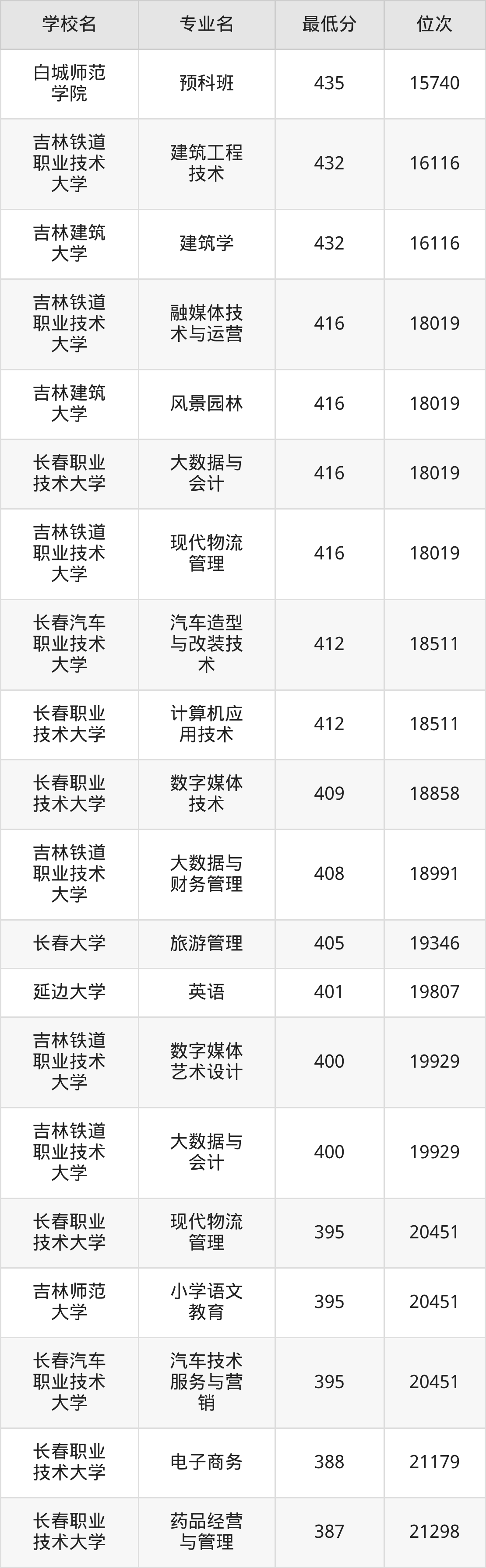 (3)白城师范学院:2025年公办本科分数线435分到507分,位次区间是15740名到7408名,招生专业有16个,最低为预科班、最高为思想政治教育。