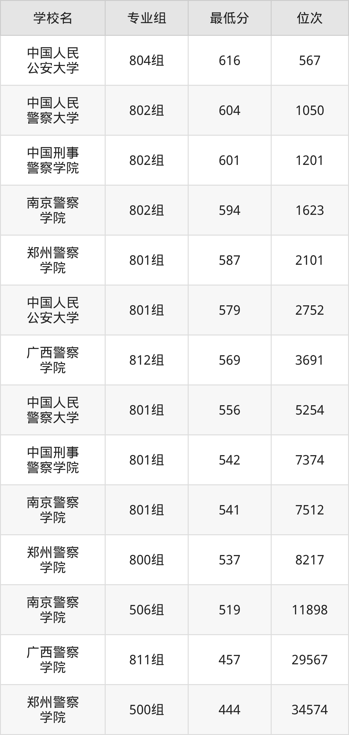 (5)郑州警察学院:2025年公安警察类分数线444分到587分,位次区间是34574名到2101名,招生专业组有3个,最低为500组、最高为801组。