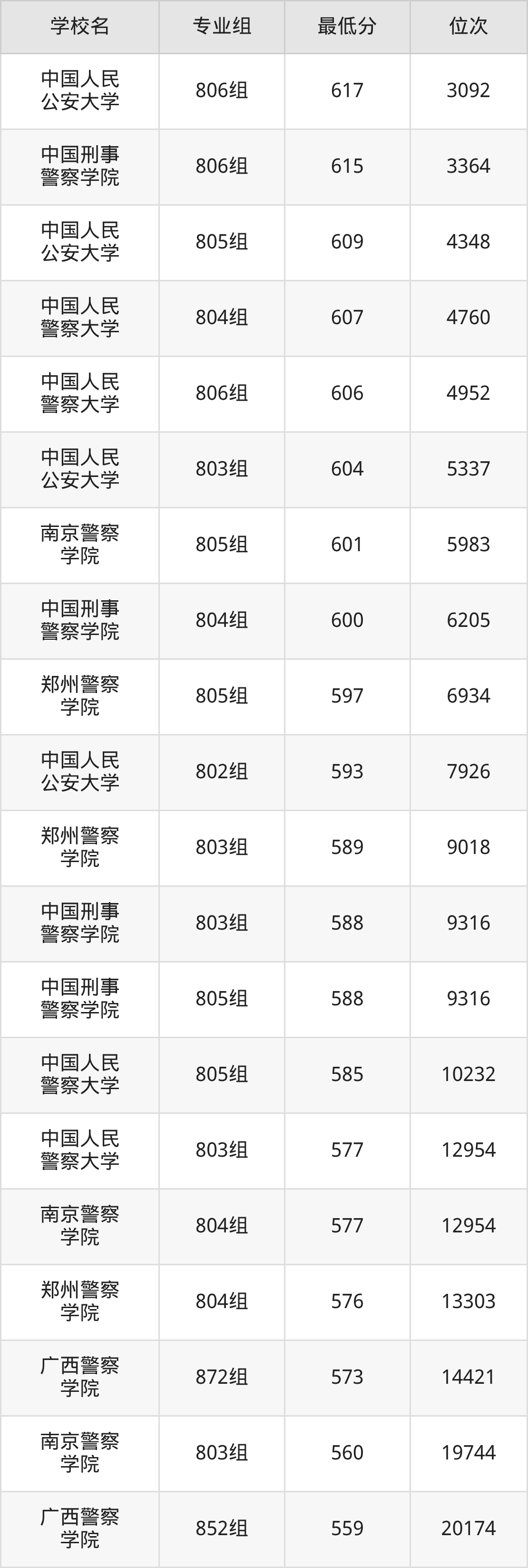 (1)中国人民公安大学:2025年公安警察类分数线593分到617分,位次区间是7926名到3092名,招生专业组有4个,最低为802组、最高为806组。