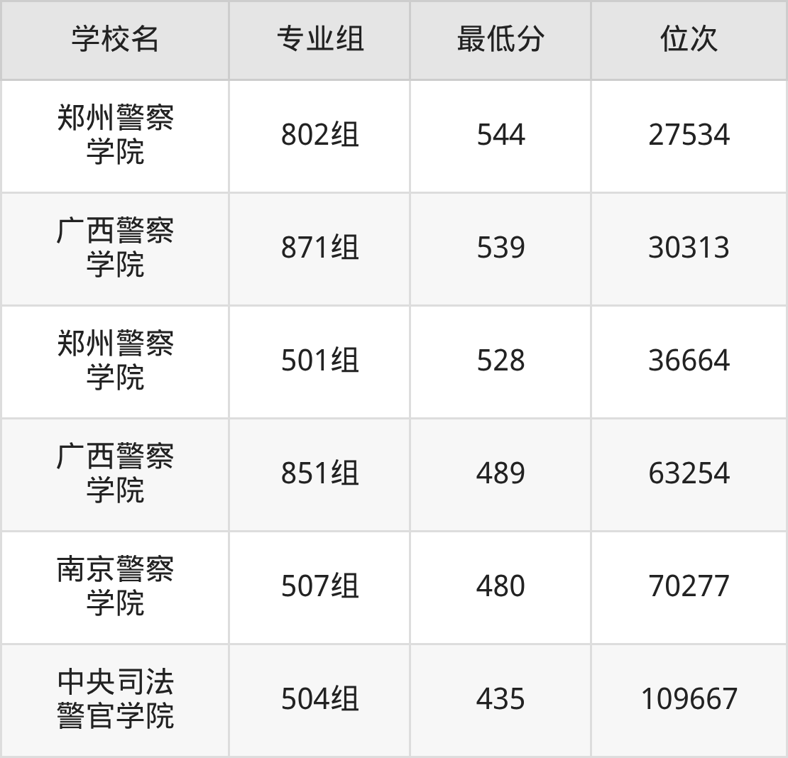 (6)广西警察学院:2025年公安警察类分数线489分到573分,位次区间是63254名到14421名,招生专业组有4个,最低为851组、最高为872组。