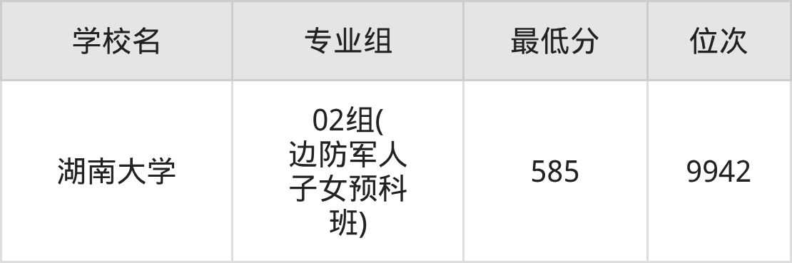 (1)湖南大学:2025年少数民族预科班分数线585分,位次是9942名,招生专业组有1个,最低为02组(边防军人子女预科班)。