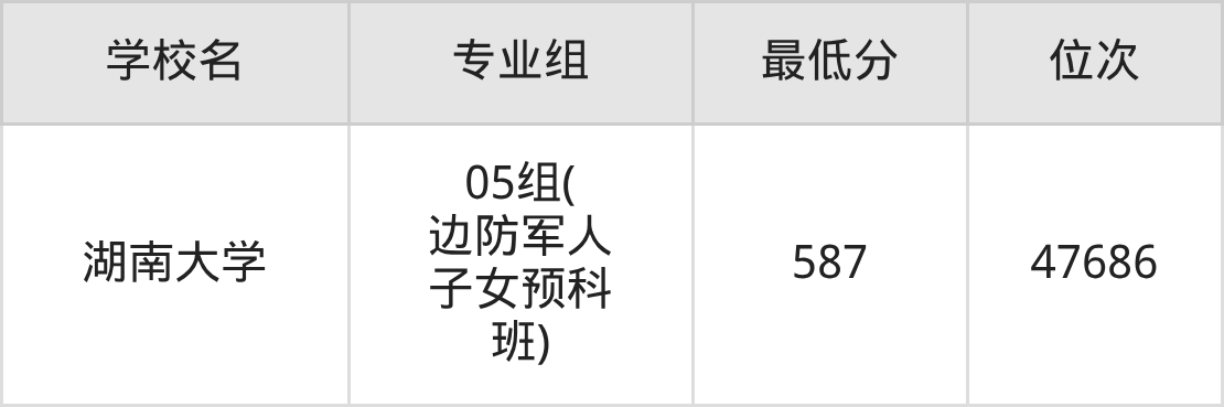 (1)湖南大学:2025年少数民族预科班分数线587分,位次是47686名,招生专业组有1个,最低为05组(边防军人子女预科班)。