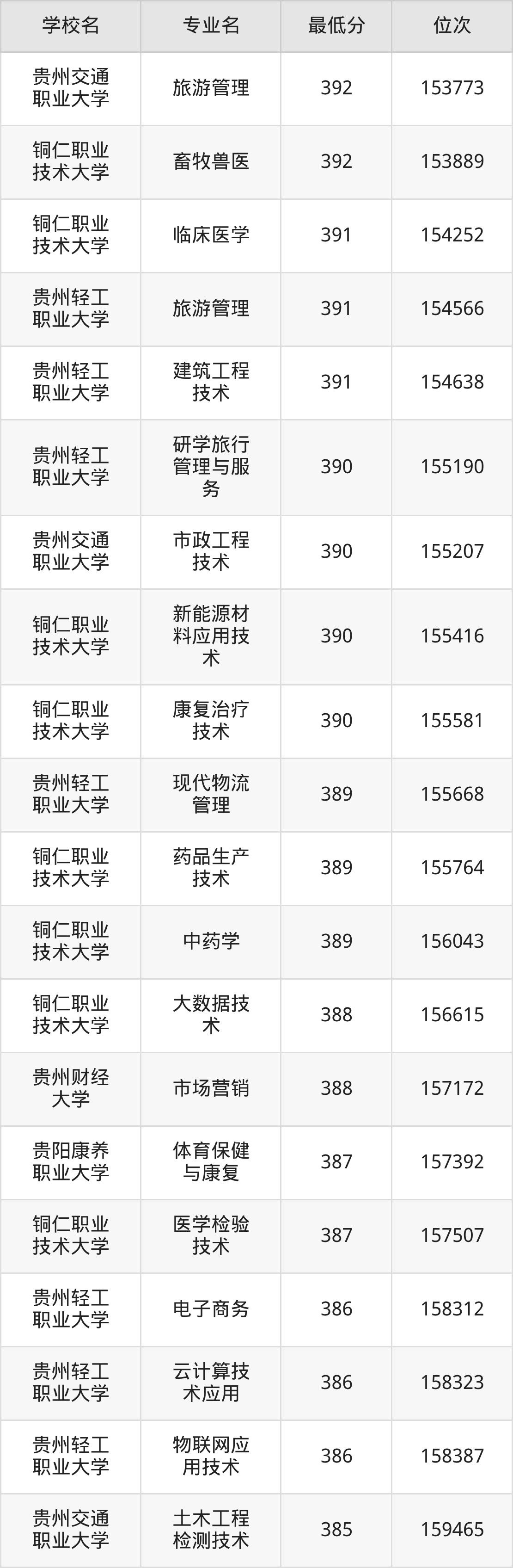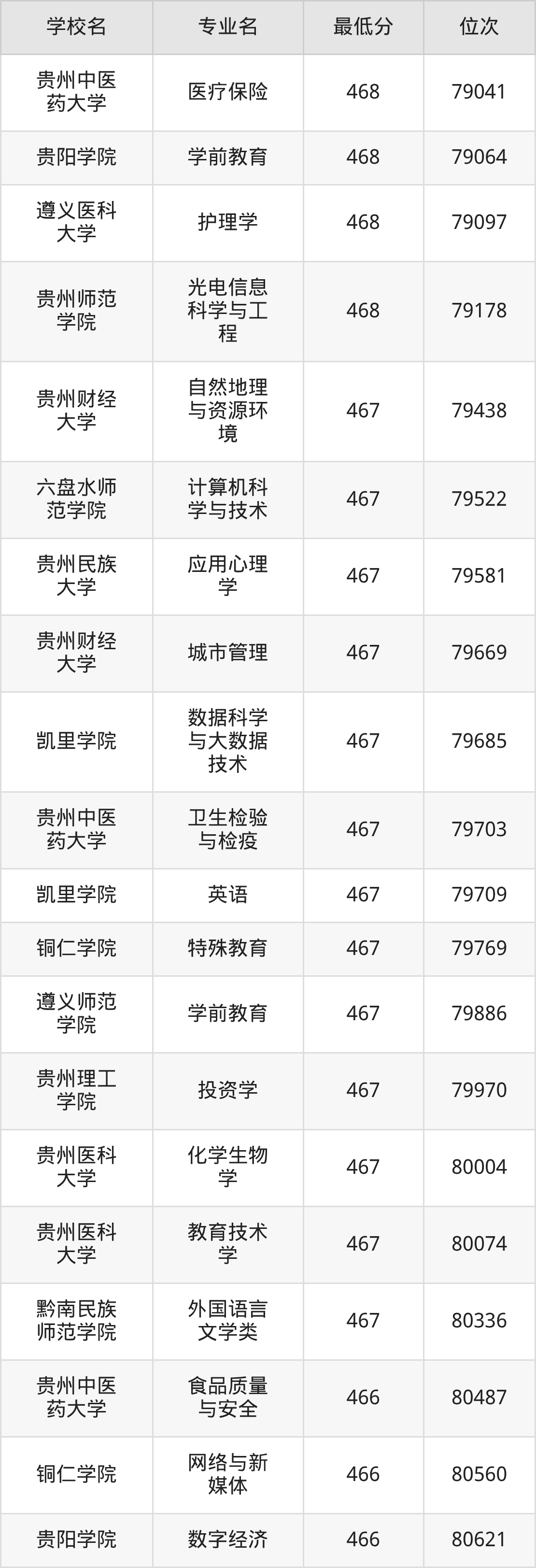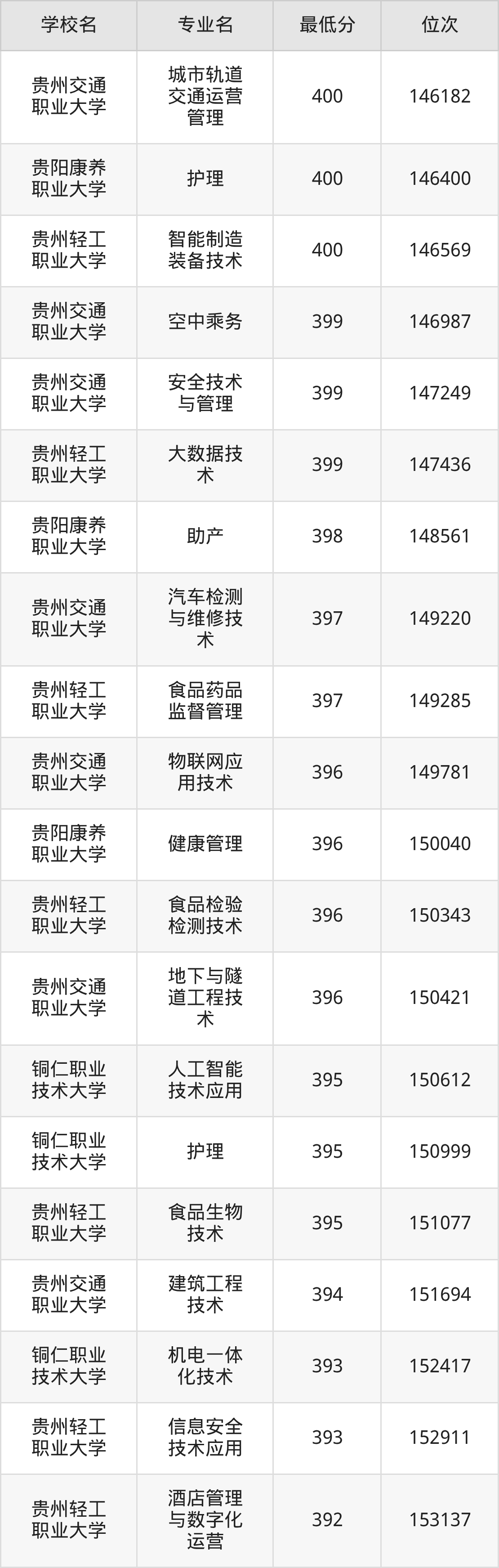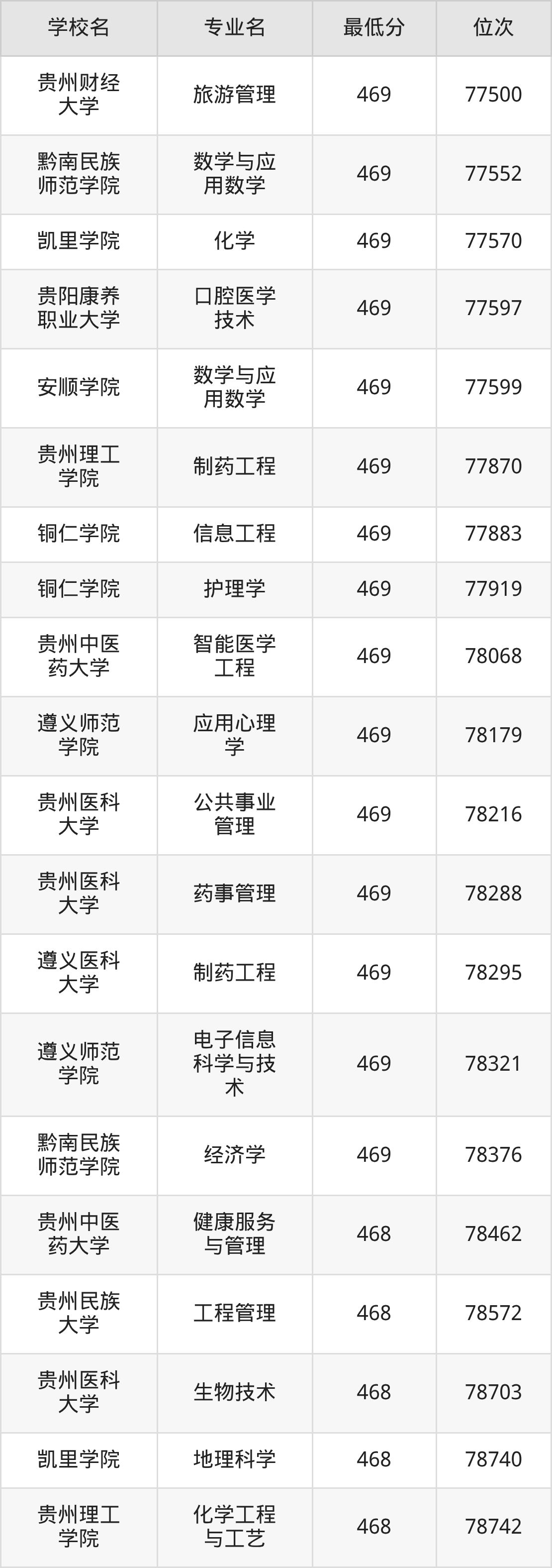 (6)贵阳康养职业大学:2025年公办本科分数线387分到469分,位次区间是157392名到77597名,招生专业有24个,最低为体育保健与康复、最高为口腔医学技术。