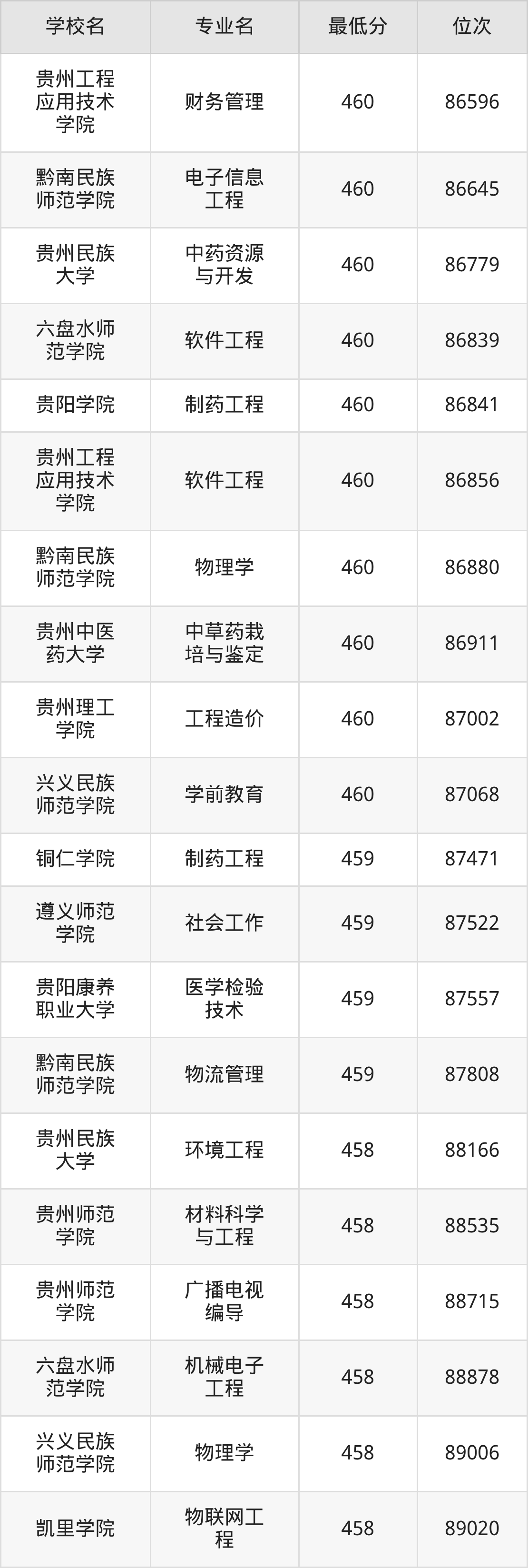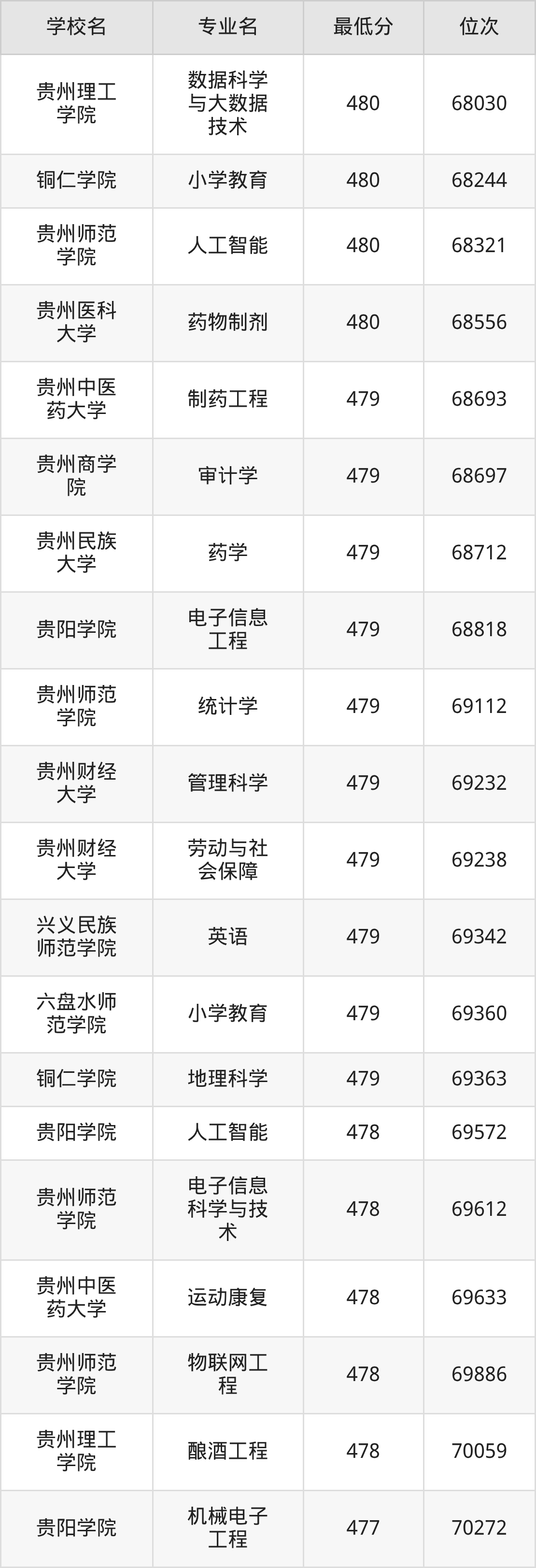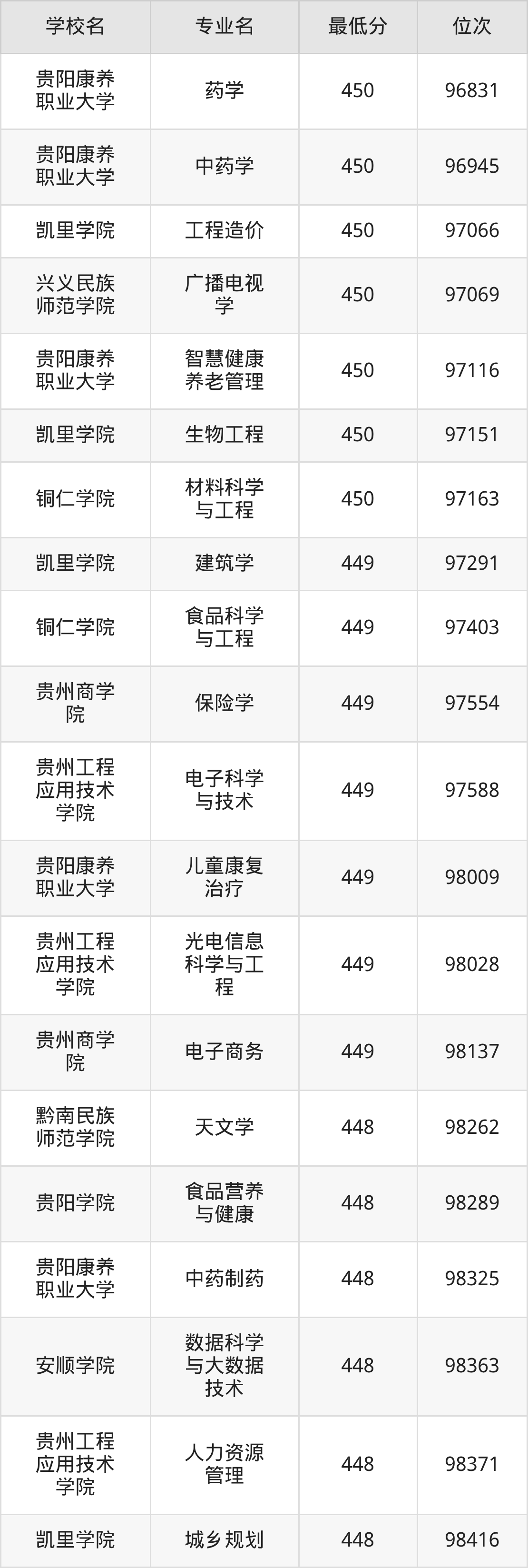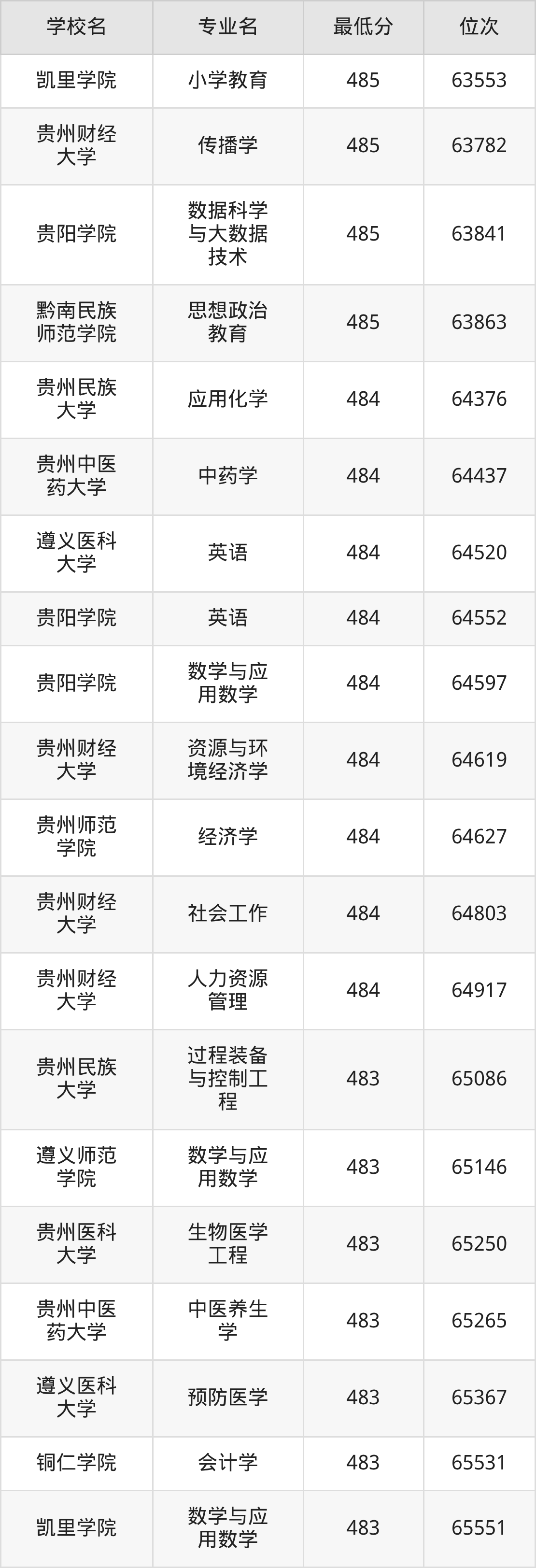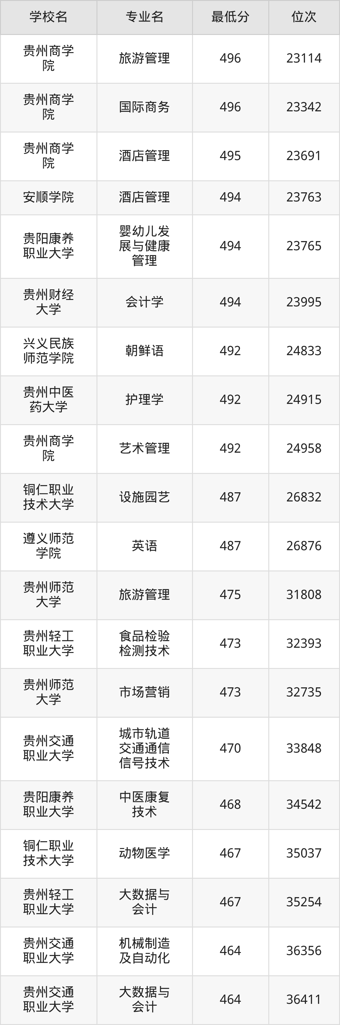 (6)贵阳康养职业大学:2025年公办本科分数线387分到469分,位次区间是157392名到77597名,招生专业有24个,最低为体育保健与康复、最高为口腔医学技术。