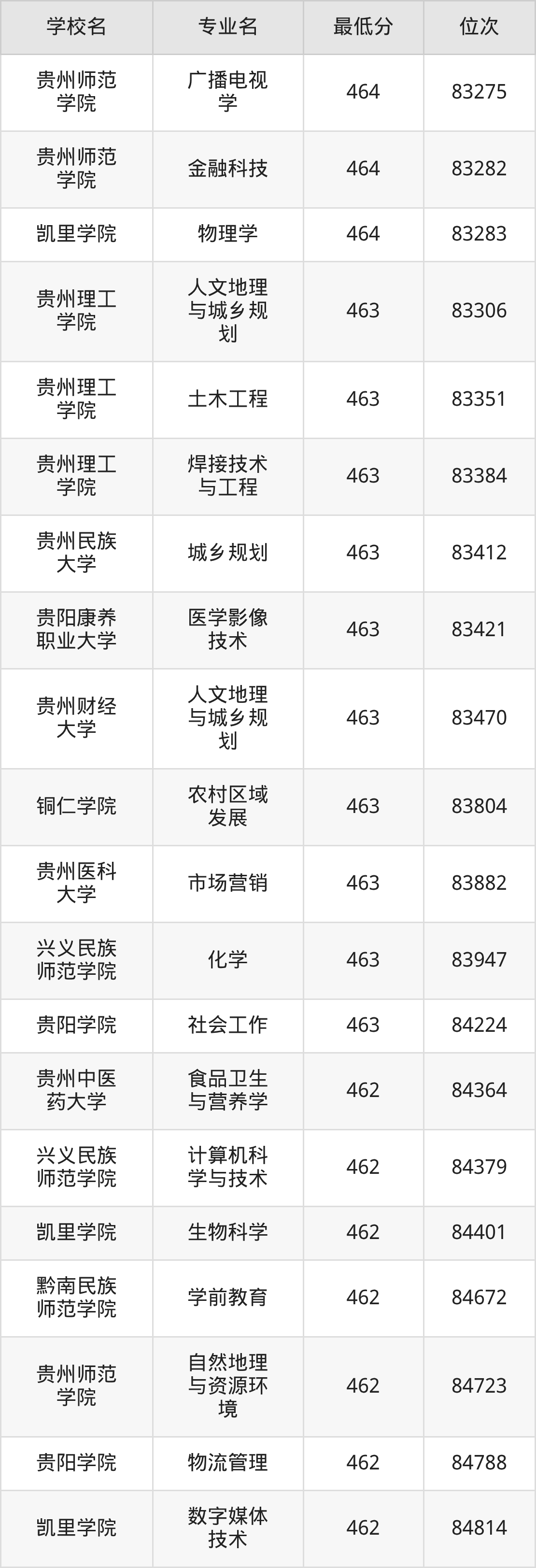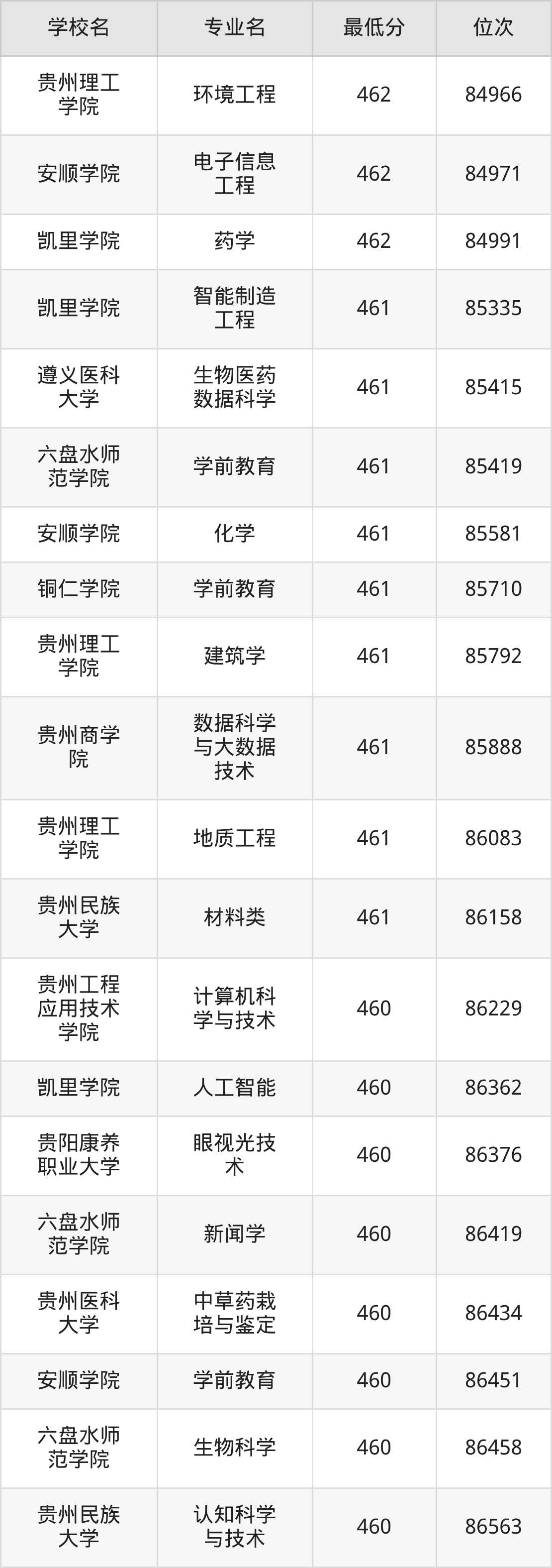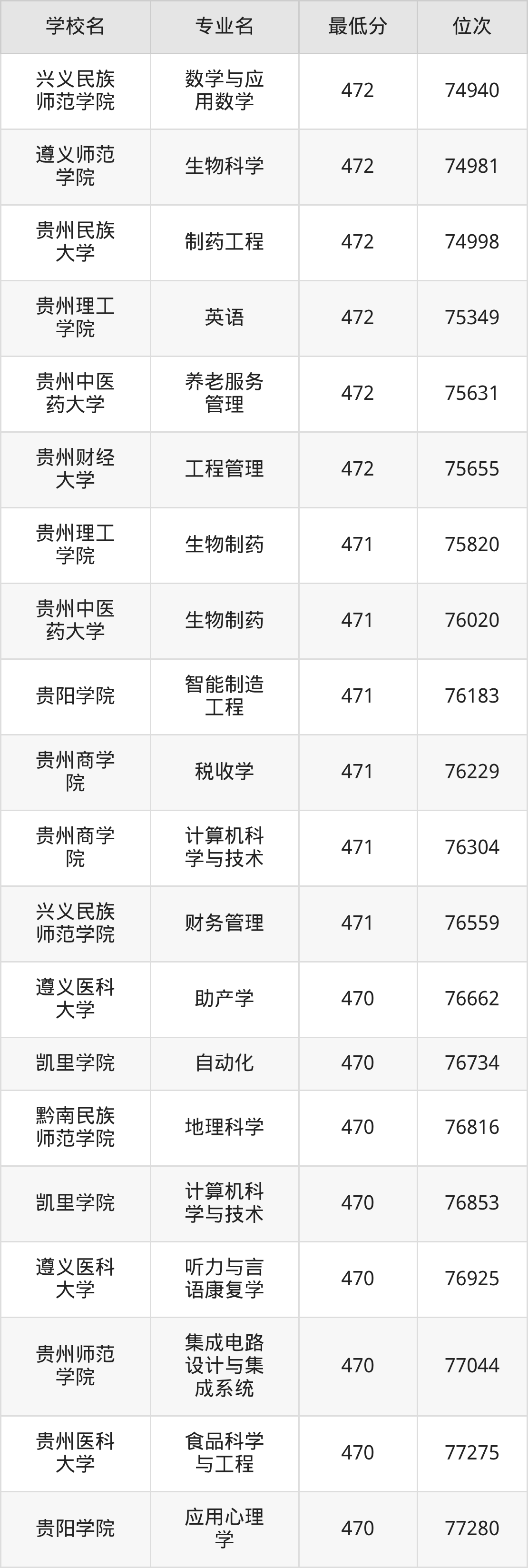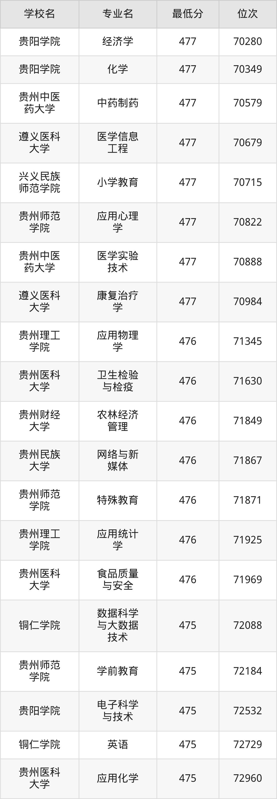 (6)贵阳康养职业大学:2025年公办本科分数线387分到469分,位次区间是157392名到77597名,招生专业有24个,最低为体育保健与康复、最高为口腔医学技术。