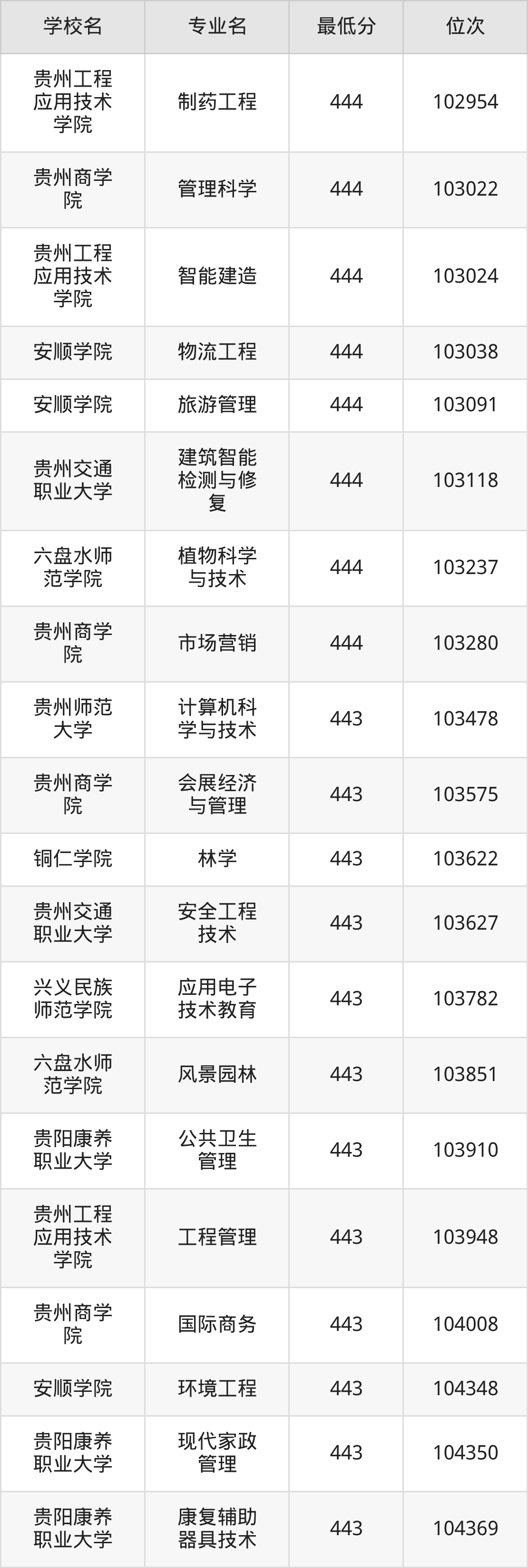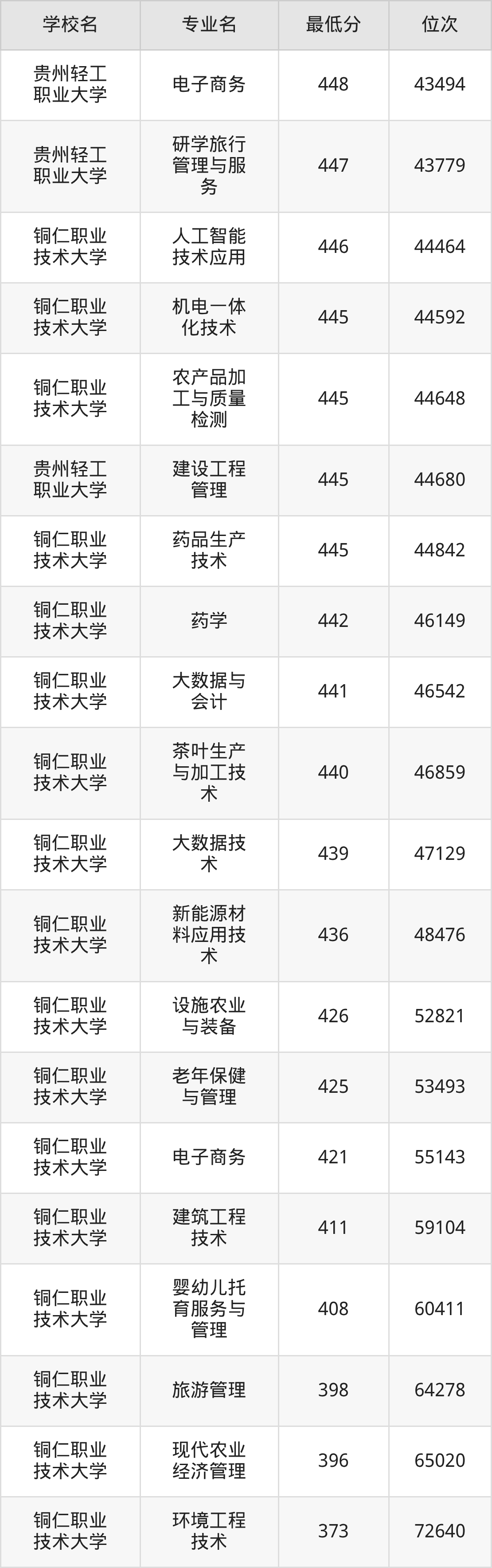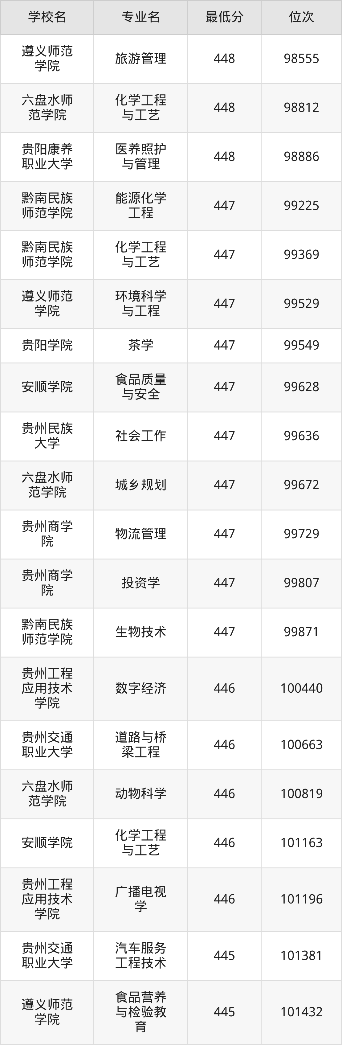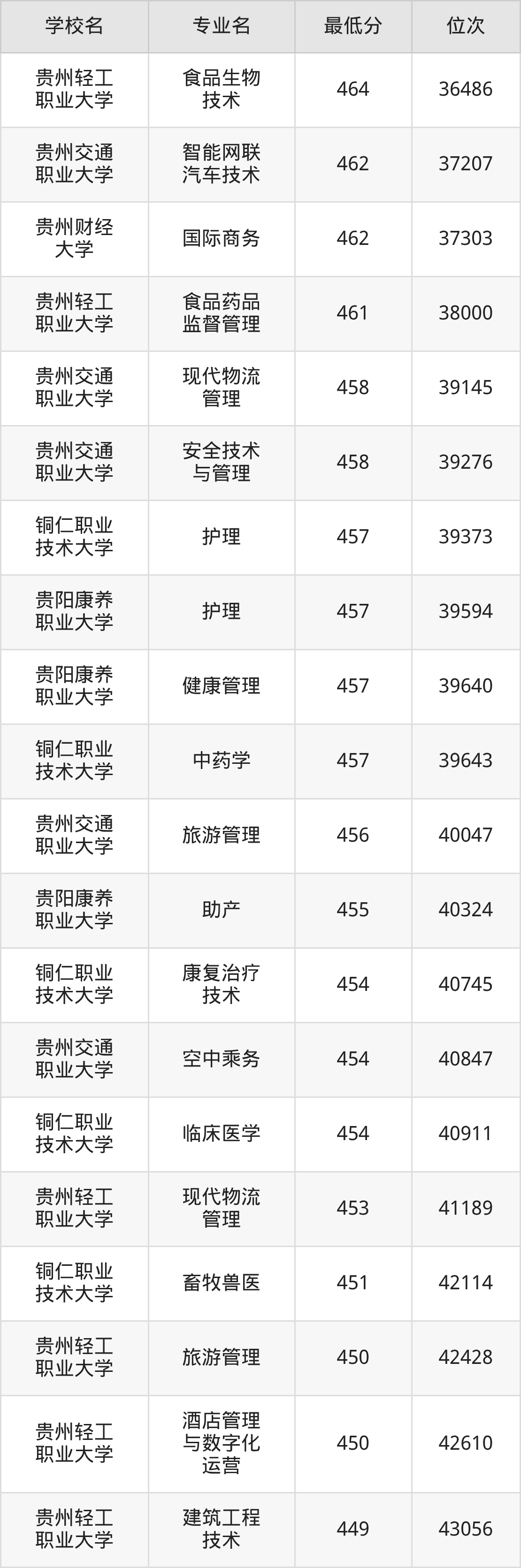 (2)贵州轻工职业大学:2025年公办本科分数线445分到473分,位次区间是44680名到32393名,招生专业有11个,最低为建设工程管理、最高为食品检验检测技术。