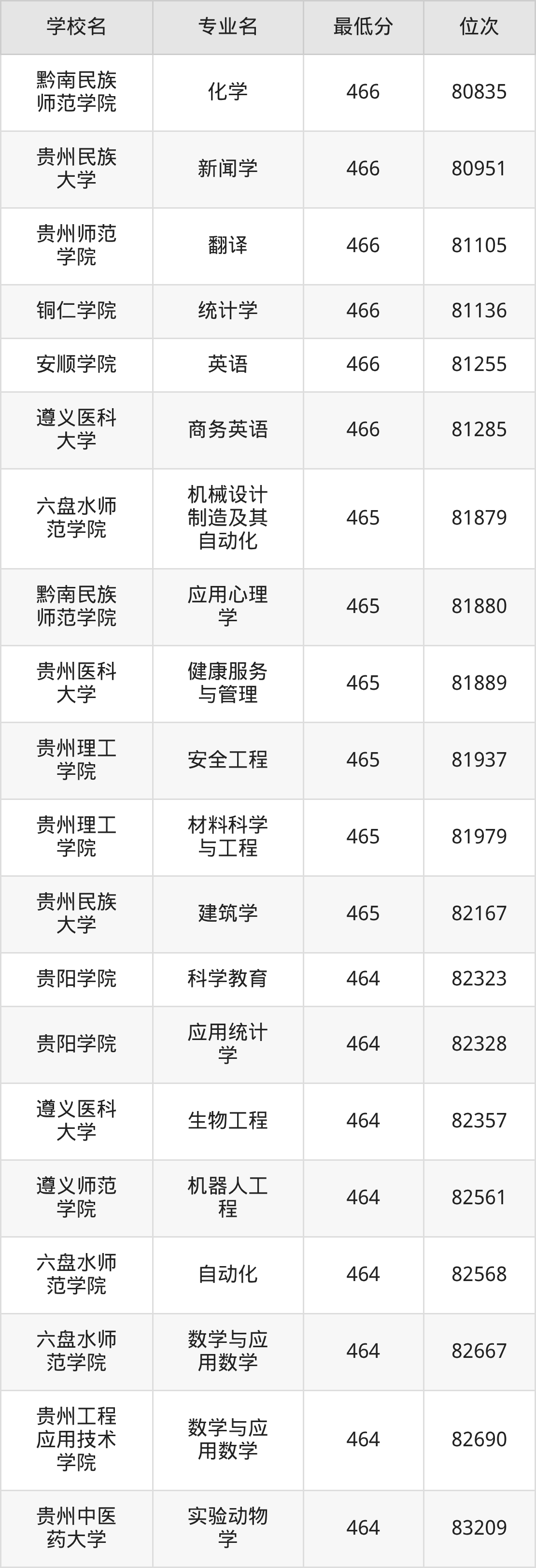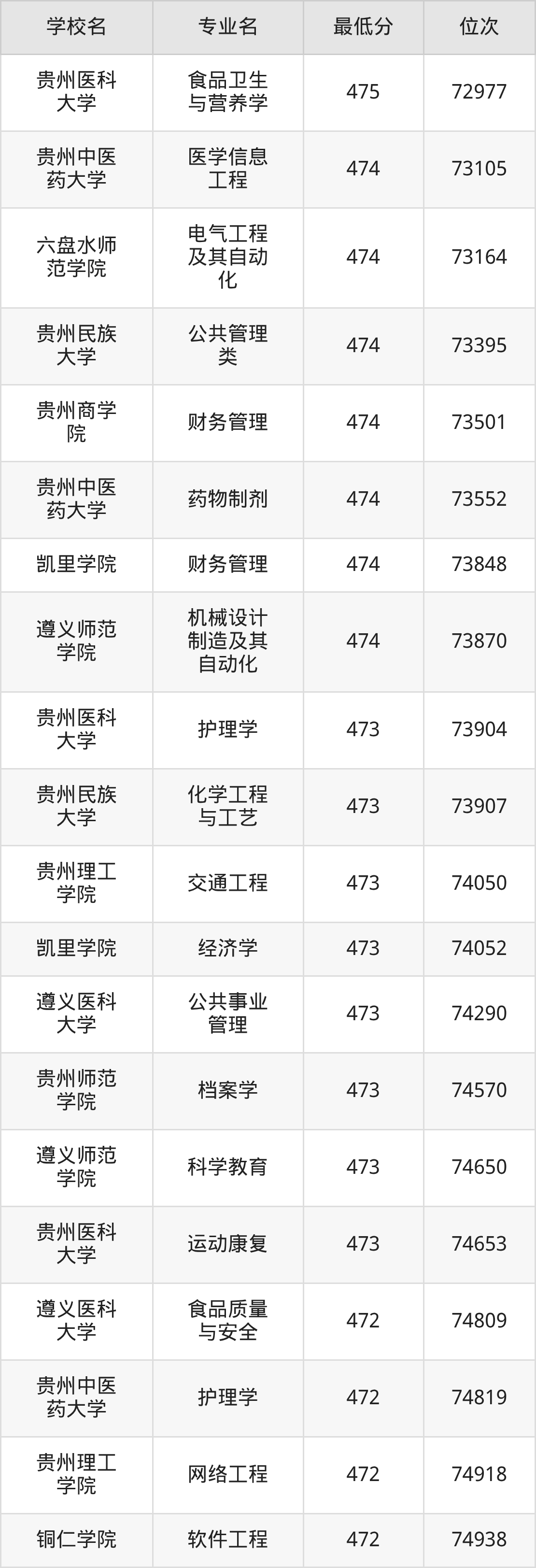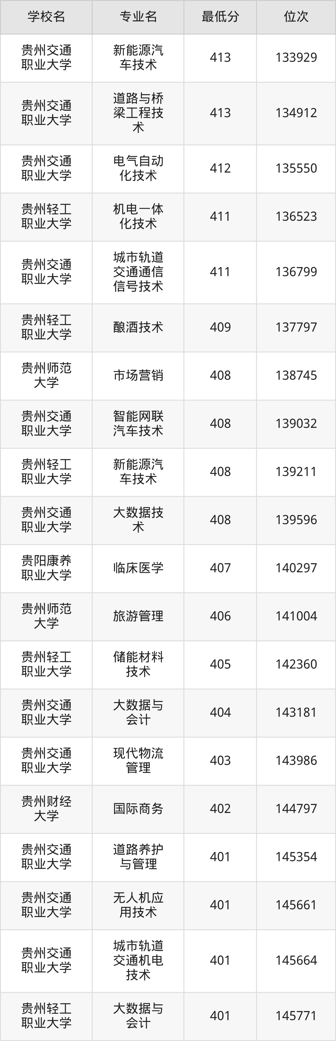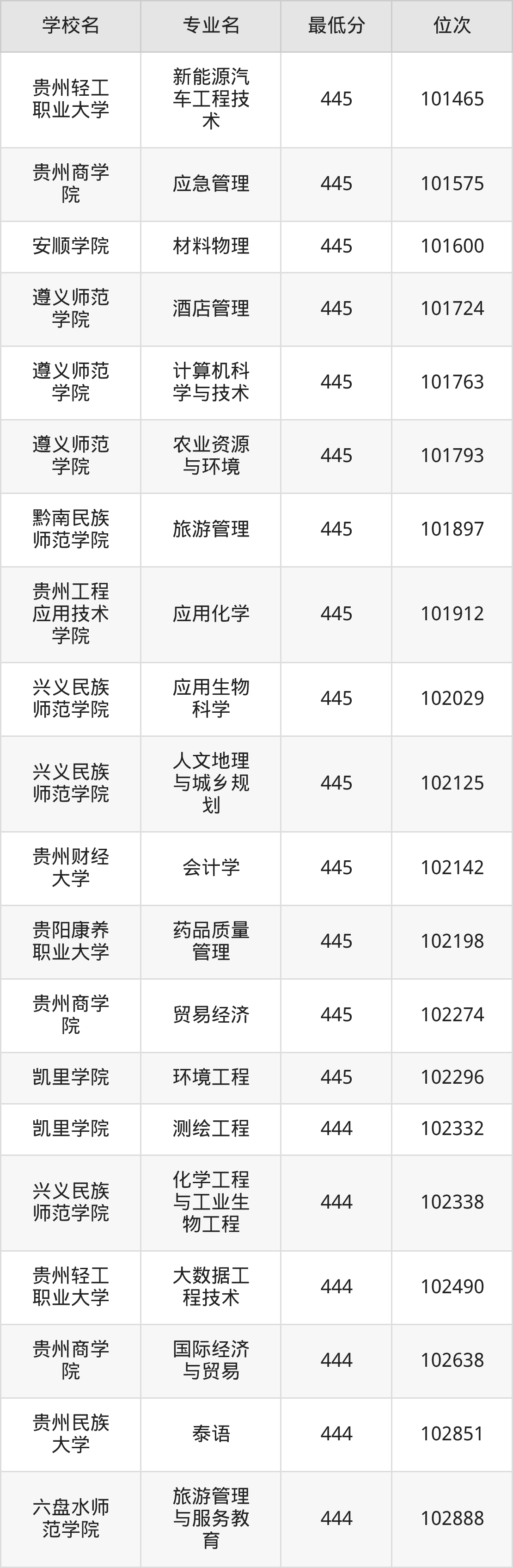 (2)贵州轻工职业大学:2025年公办本科分数线445分到473分,位次区间是44680名到32393名,招生专业有11个,最低为建设工程管理、最高为食品检验检测技术。