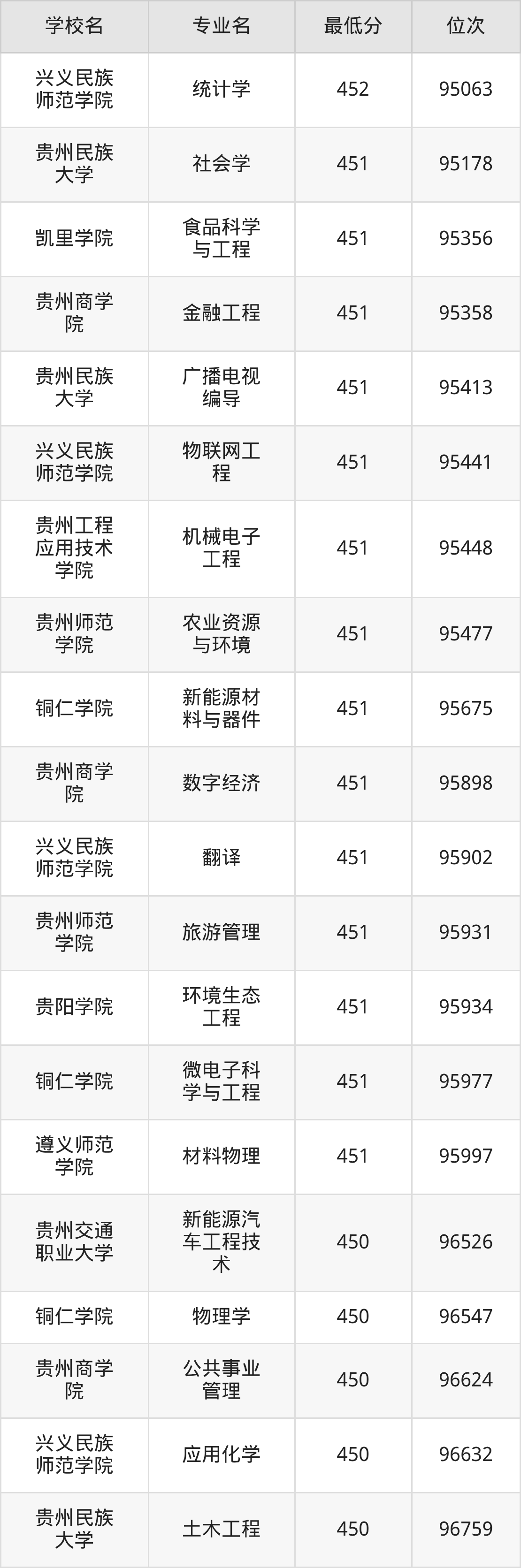 (3)贵州师范学院:2025年公办本科分数线451分到521分,位次区间是95931名到38554名,招生专业有34个,最低为旅游管理、最高为数学与应用数学。