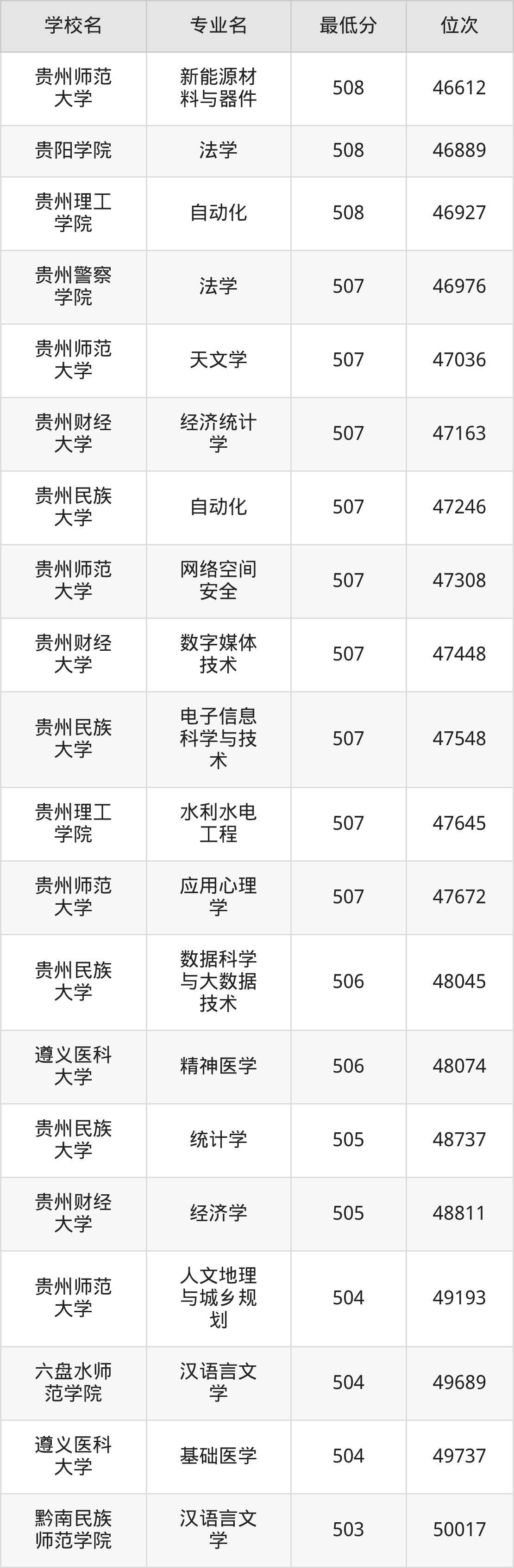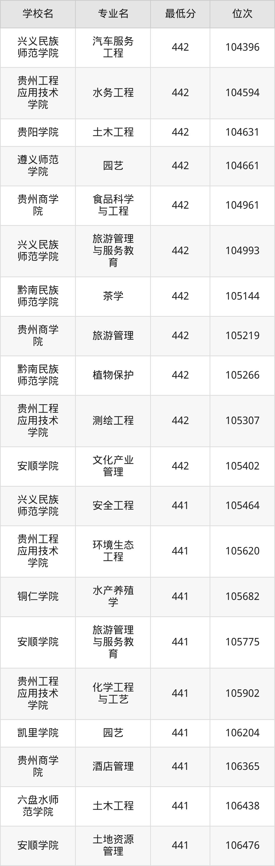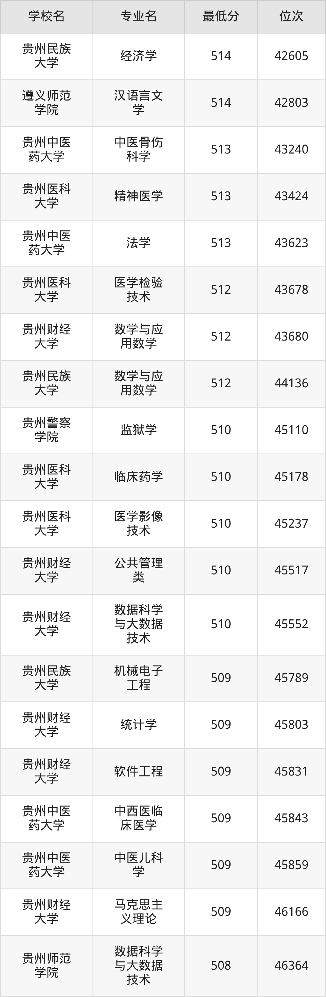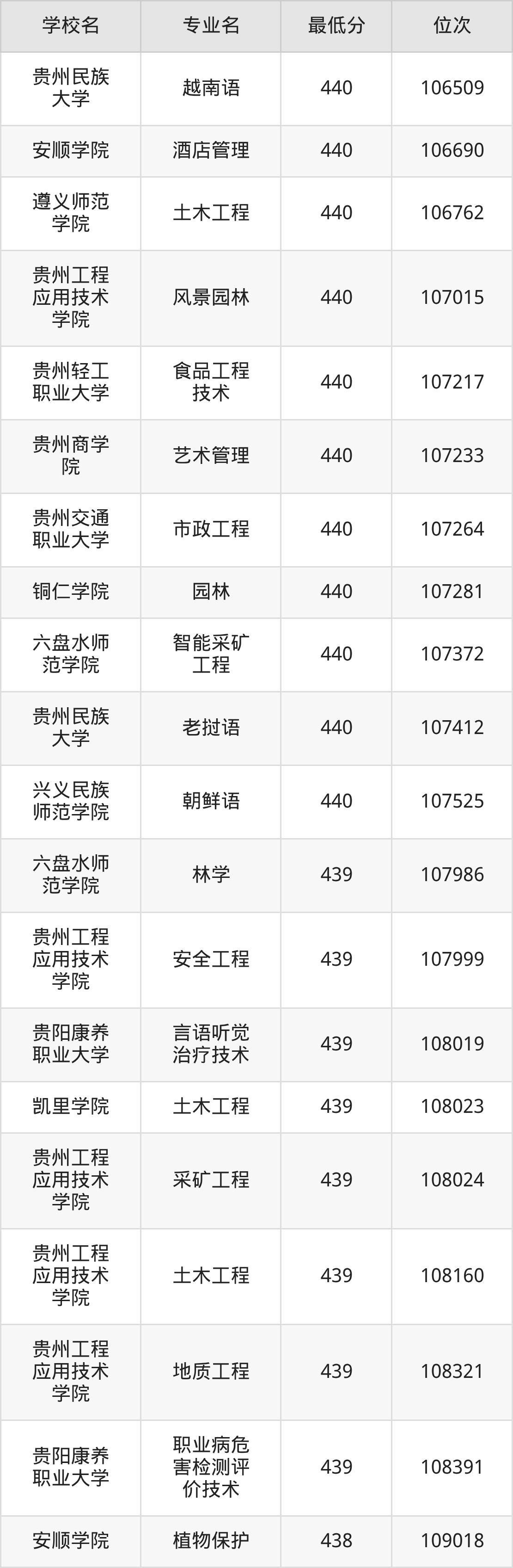 (1)贵州民族大学:2025年公办本科分数线440分到534分,位次区间是107412名到30950名,招生专业有44个,最低为老挝语、最高为法学。