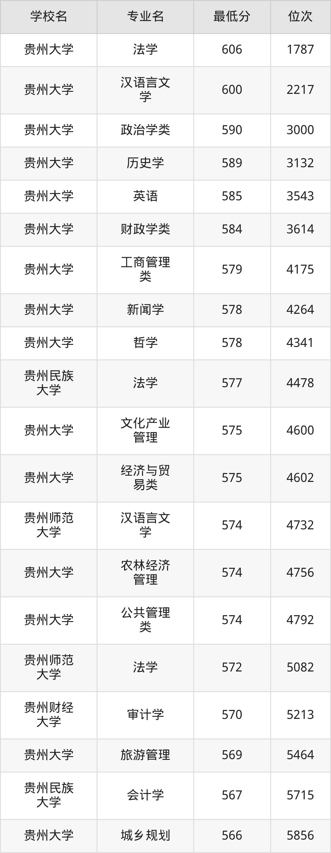 (6)贵州民族大学:2025年公办本科分数线500分到577分,位次区间是21791名到4478名,招生专业有23个,最低为老挝语、最高为法学。
