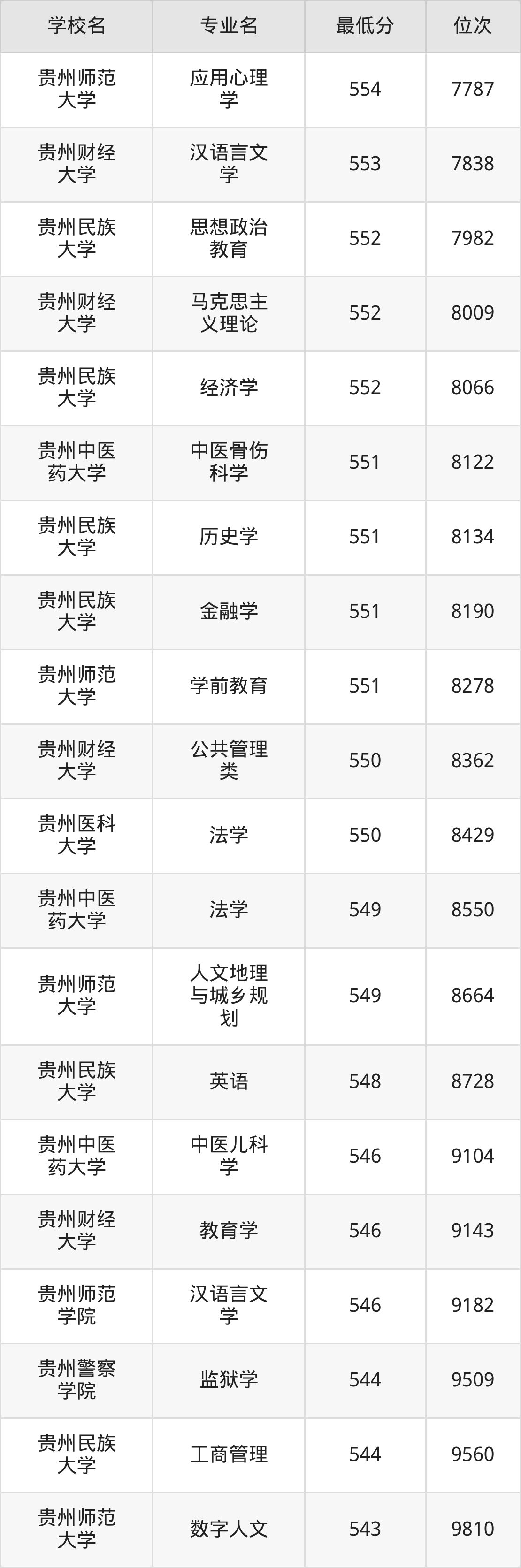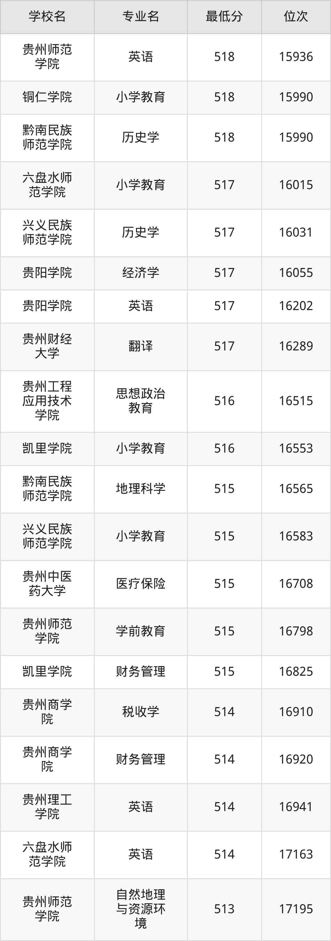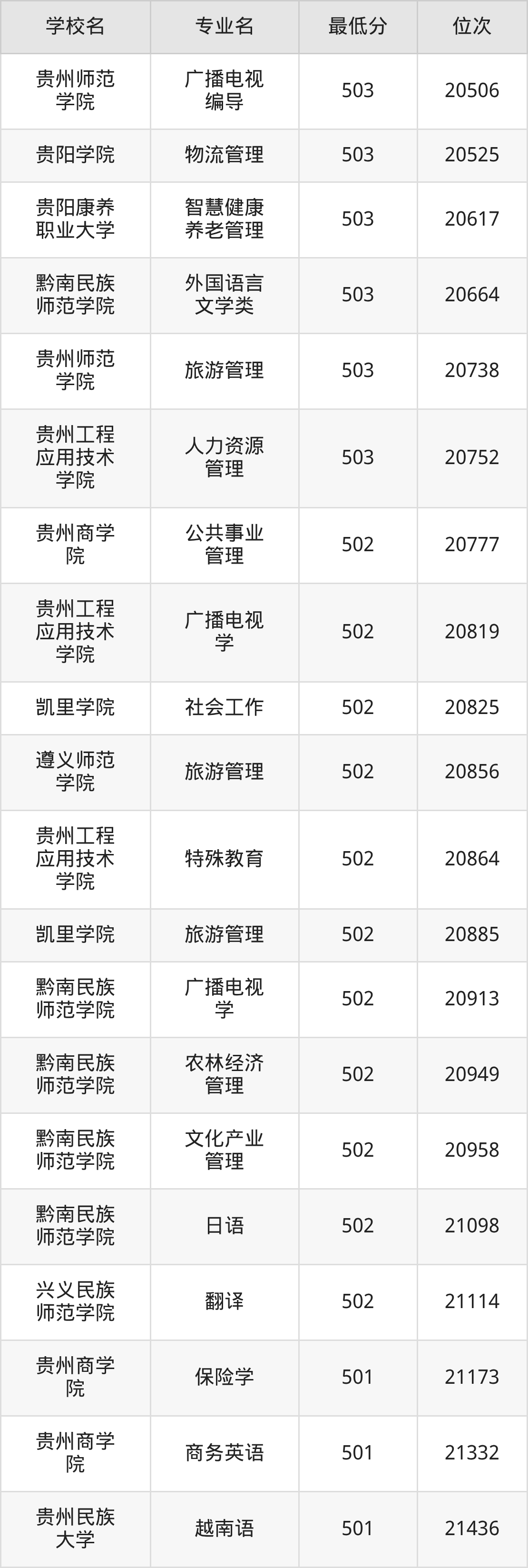 (4)贵州师范学院:2025年公办本科分数线503分到546分,位次区间是20738名到9182名,招生专业有19个,最低为旅游管理、最高为汉语言文学。