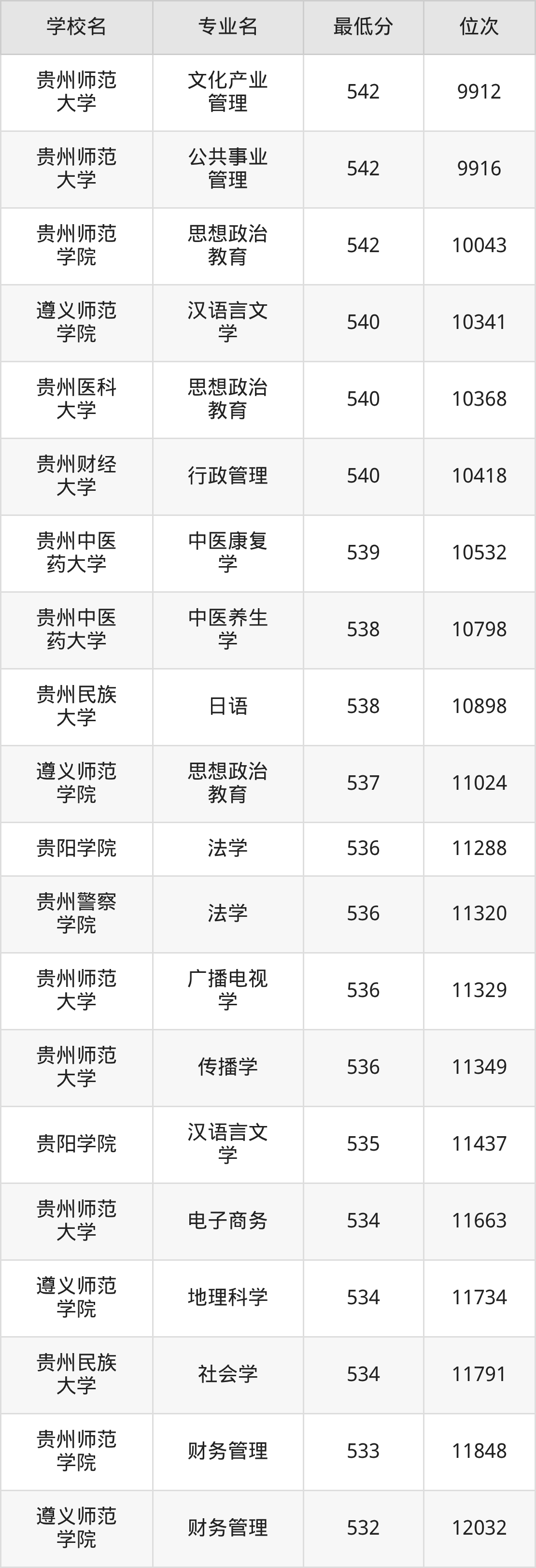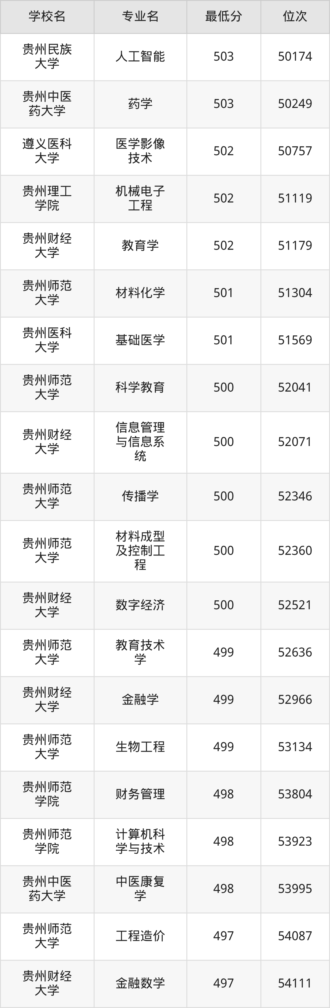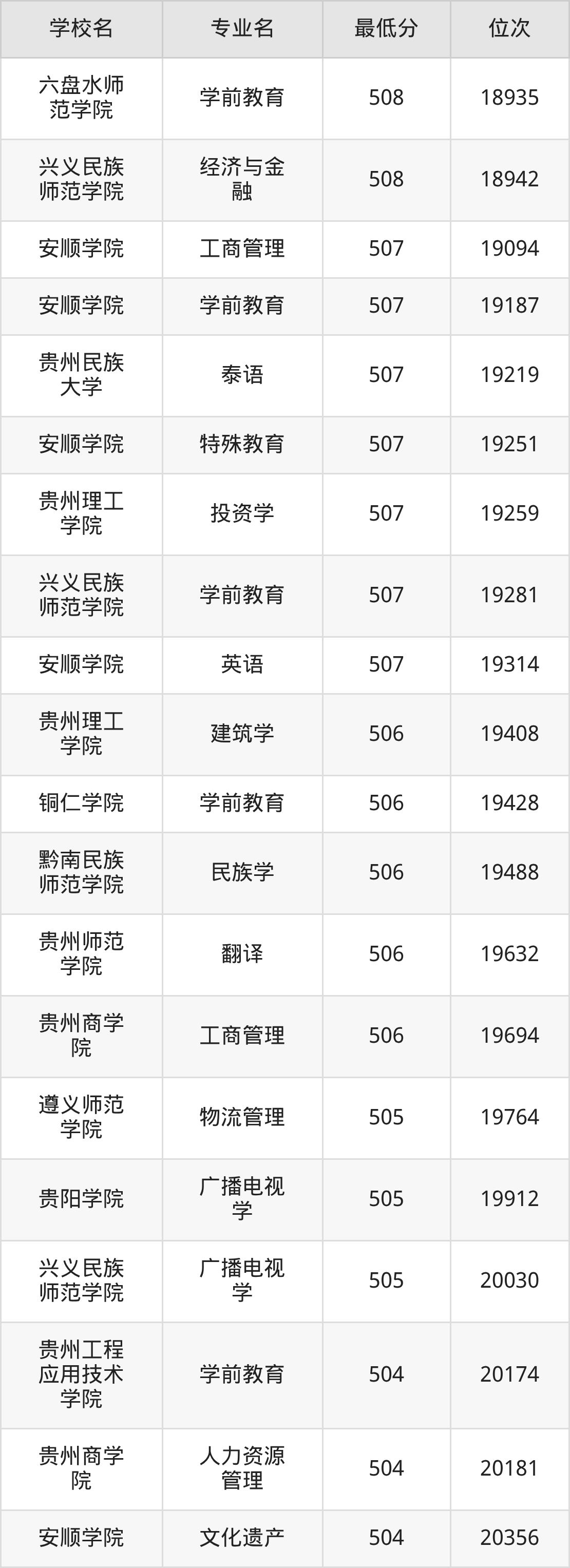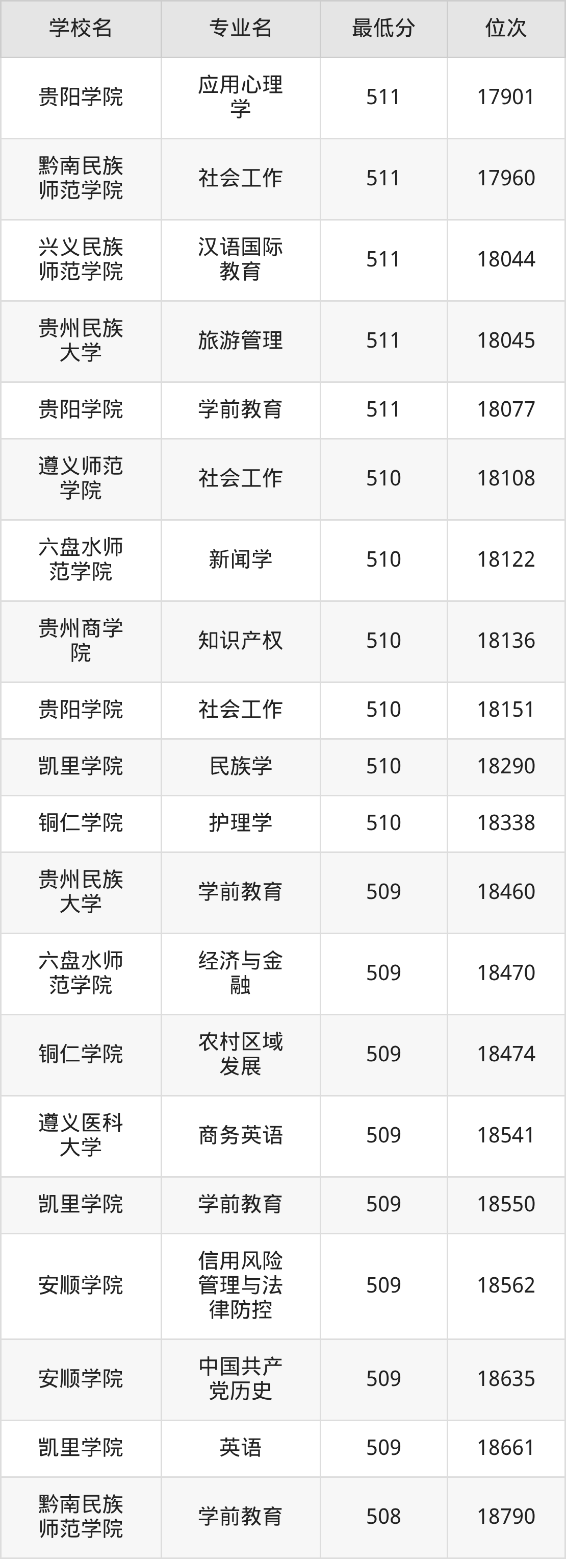 (4)贵州师范学院:2025年公办本科分数线503分到546分,位次区间是20738名到9182名,招生专业有19个,最低为旅游管理、最高为汉语言文学。